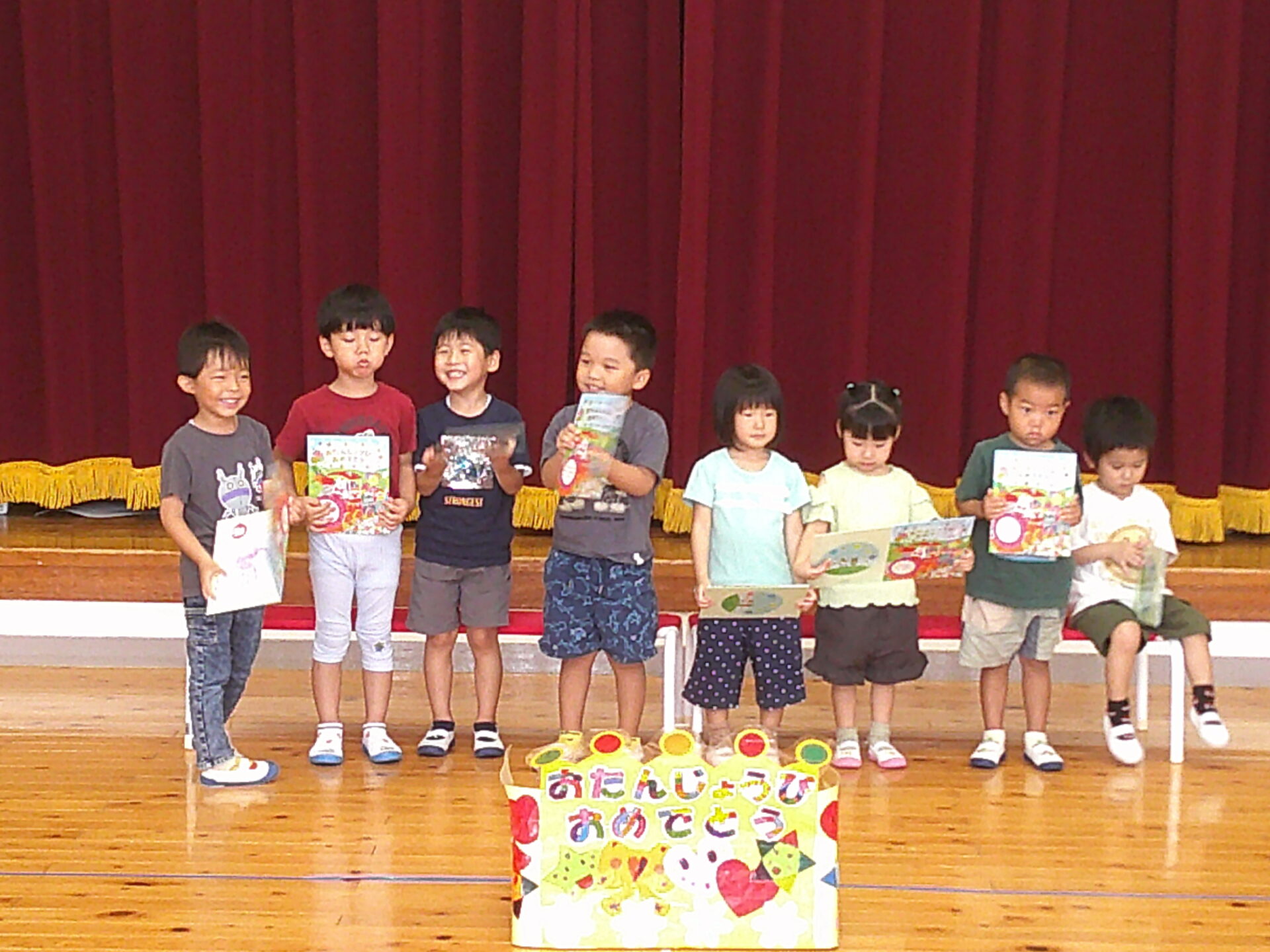 まだまだ暑さが残る9月ですが、少しずつセミの声が減ってきて、秋の虫の声が聞こえてくるようになってきました。そんな暑さが残る9月に誕生したお友だちのお誕生会が、本日開催されました。くじらチームさん(5歳児)のお誕生者は0名でした。そらチームさん(4歳児)4名、にじチームさん(3歳児)4名の計8名がお誕生者でした。0.1.2歳児さんは計4名いました。