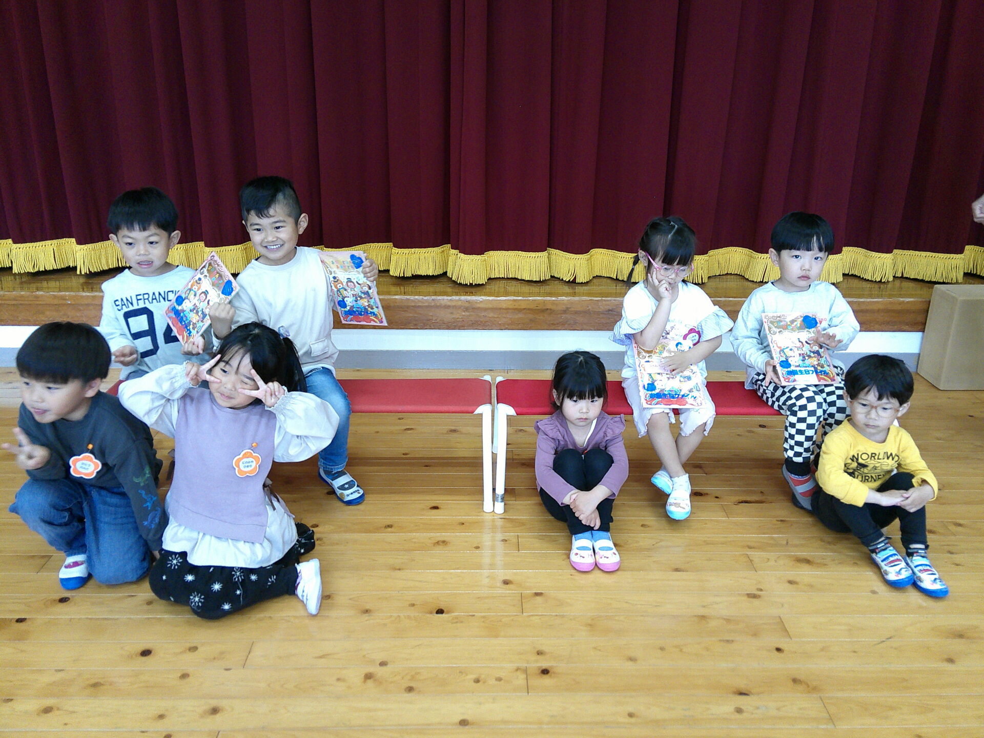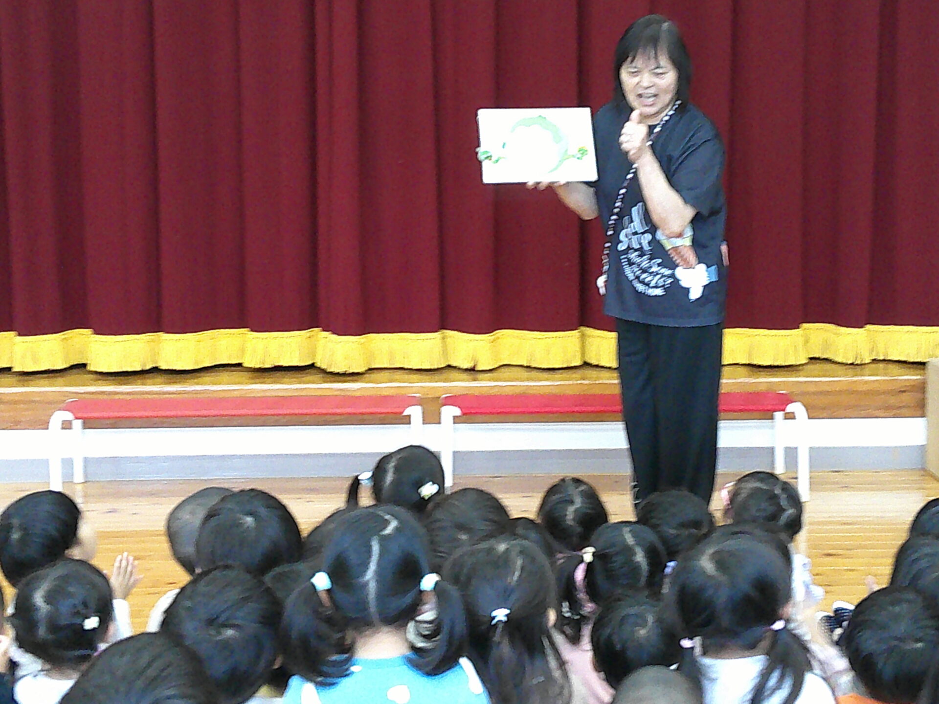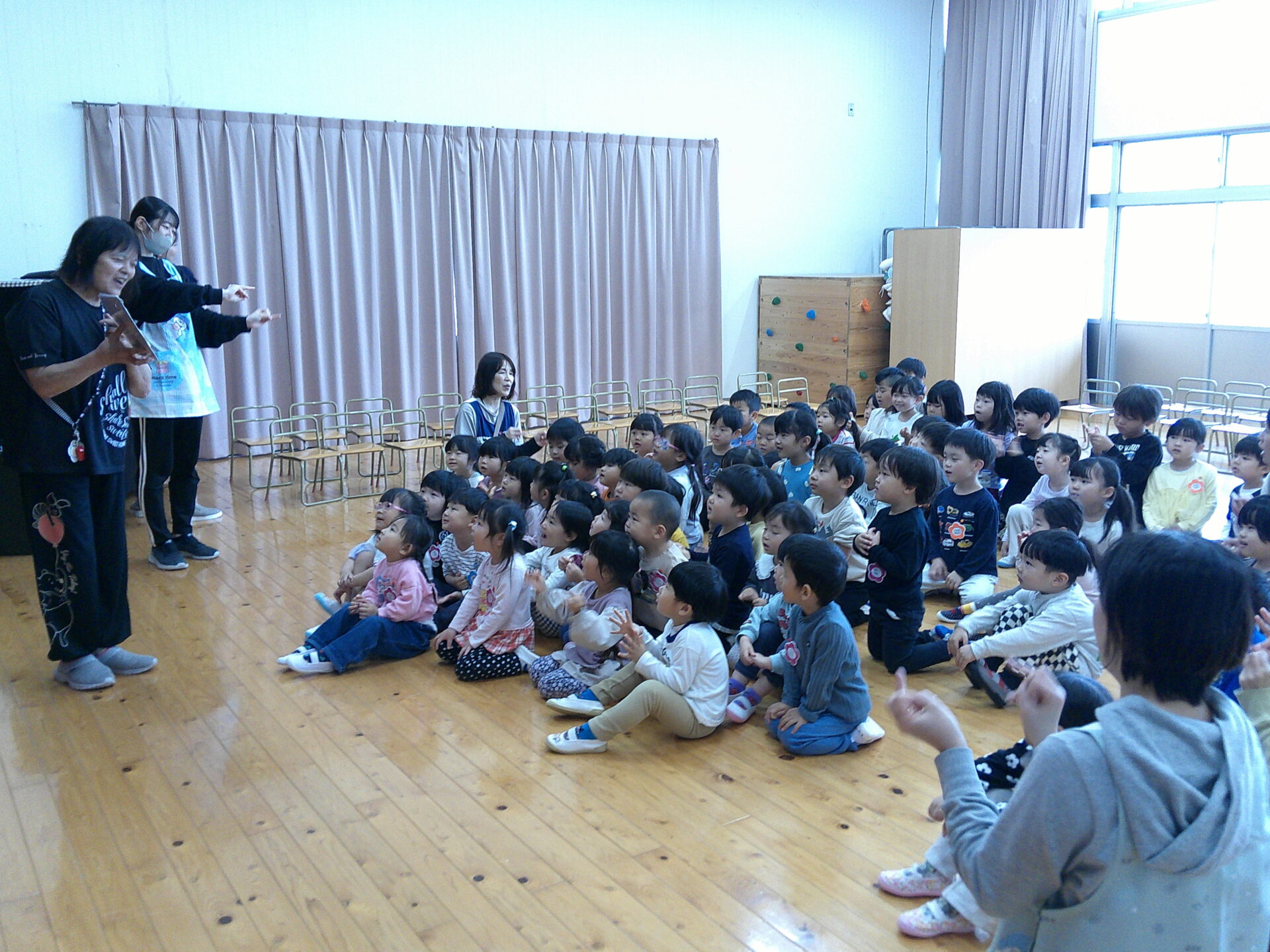 今日は、4月生まれのお友だちの誕生会でした。くじらチームさん(5歳児)2名、にじチーム(3歳児)2名の4名のお友だちのお祝いでした。今年度になり、初めての集会ということで、新しく仲間になったお友だちは、ちょっぴり、不安そうに参加していました。けれども、お誕生日のお友だちに、カードを渡す時や、お祝いの歌を歌うときは、ニコニコ笑顔で、お祝いをしていました。先生からのプレゼントは、『キャベツの中から』と『チューリップ』の歌のお話でした。知っている歌だったので、みんな興味津々で見入っていました。これから、楽しいこと、おもしろいこと、たくさんしようね。