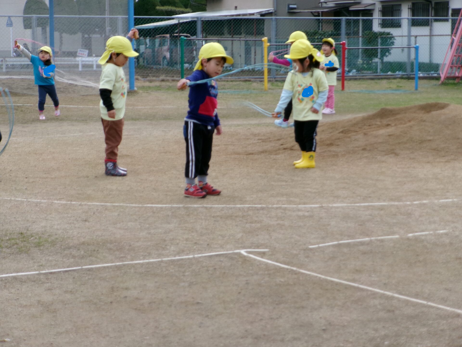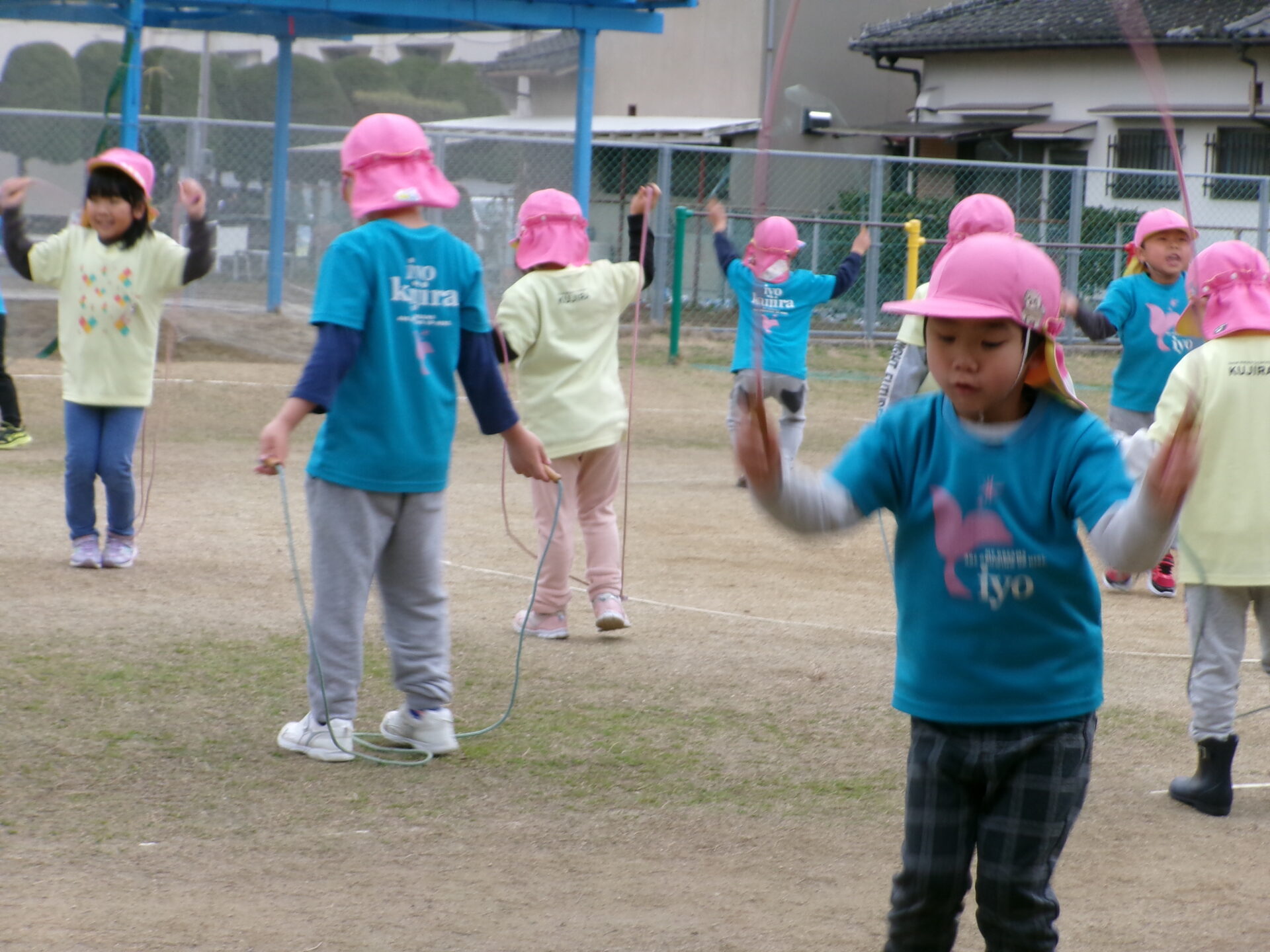 くじらチーム(5歳児)になると、さすが!!!連続とびも軽くこなす子ども達、友達同士お互いを励まし合って頑張っています。