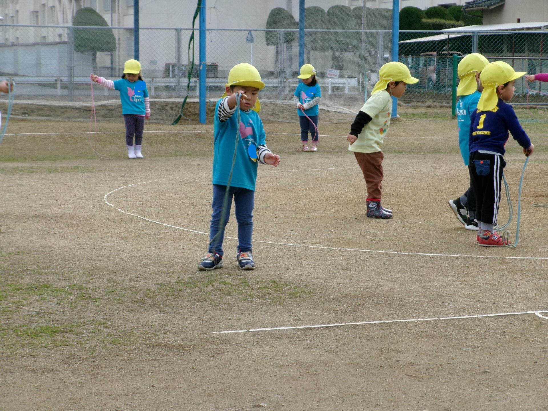 まだ飛べないにじチーム(3歳児)は、縄跳びのイメージを体験するところから始まります。自分の利き手に二つ折りした縄跳びをビュンビュンとまわします。自分で飛んでいるかのようなイメージ作りをします。なんだか、たくさん飛べている感覚になり得意そうに報告してくれます。「飛べたよ!!」