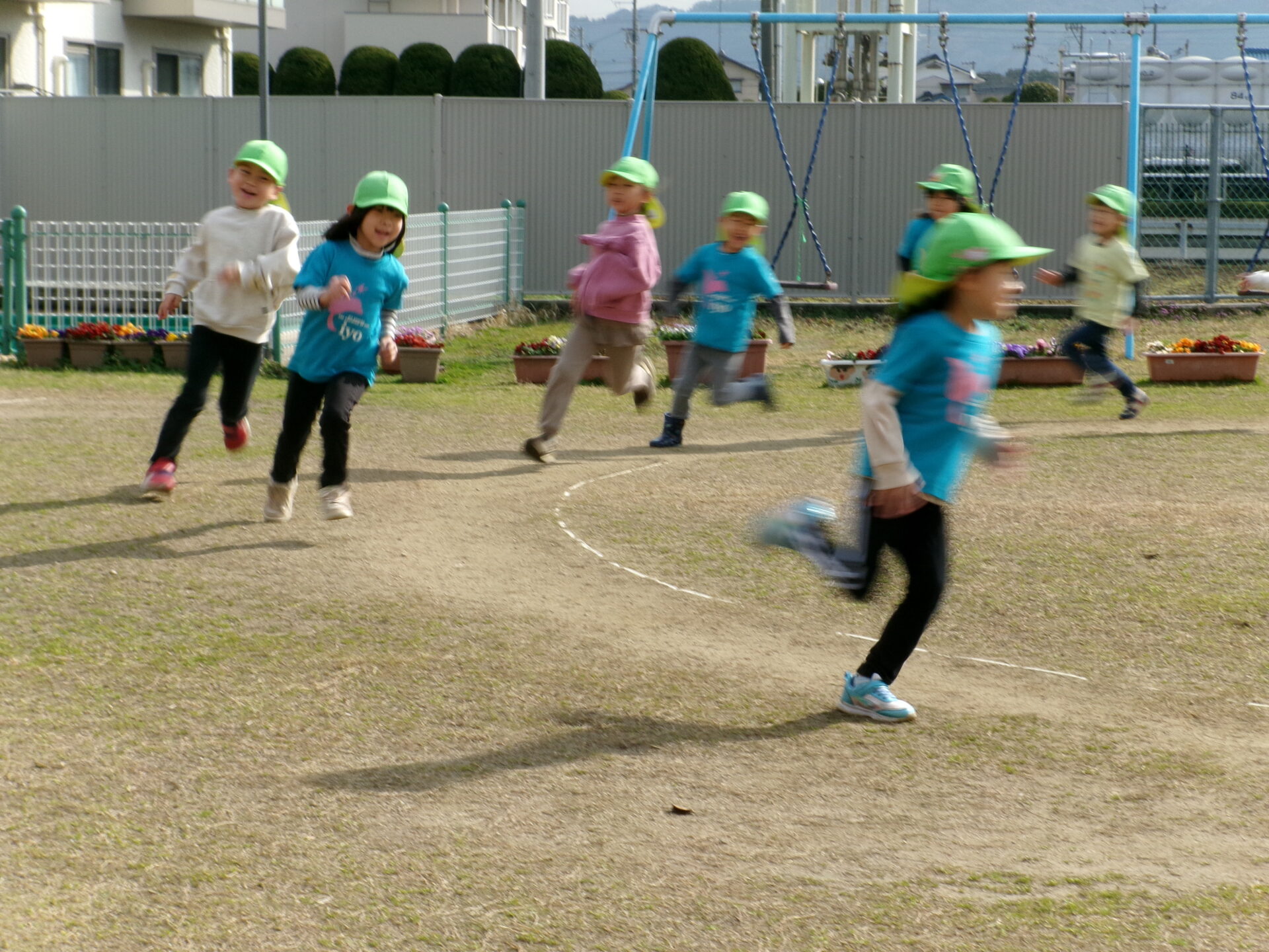 挨拶から始まって、準備体操の駆け足で走ります。「GO!GO!ガンバレーーー!」