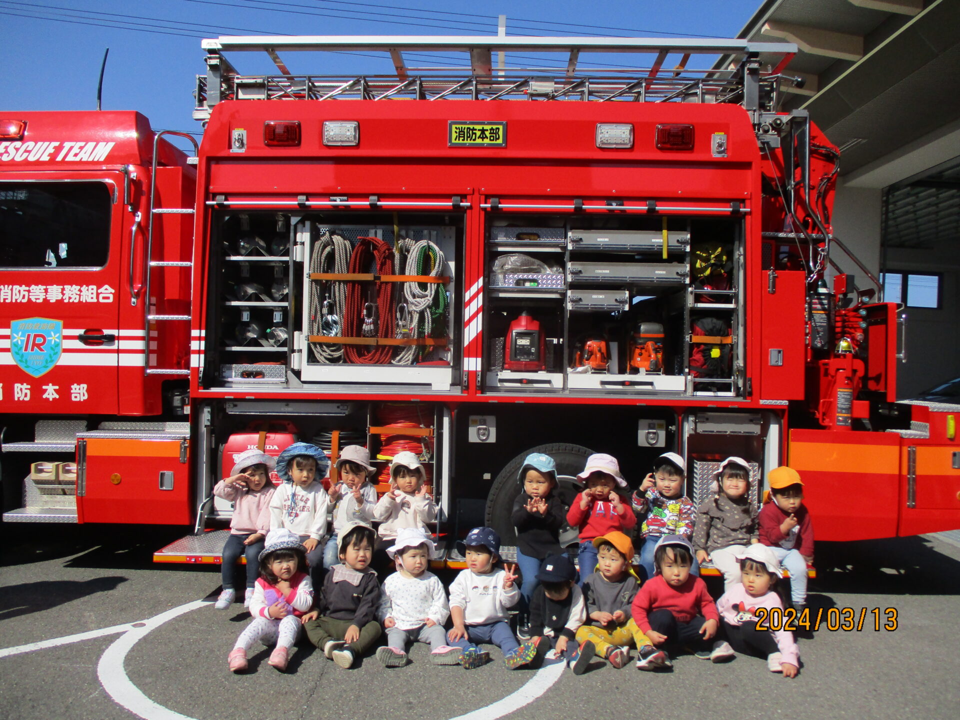 伊予消防署へ見学に行って来ました。小さな子どもたちは、夢も大きく振り返った時に写真見て懐かしく思い出してくれることを願ってます。
