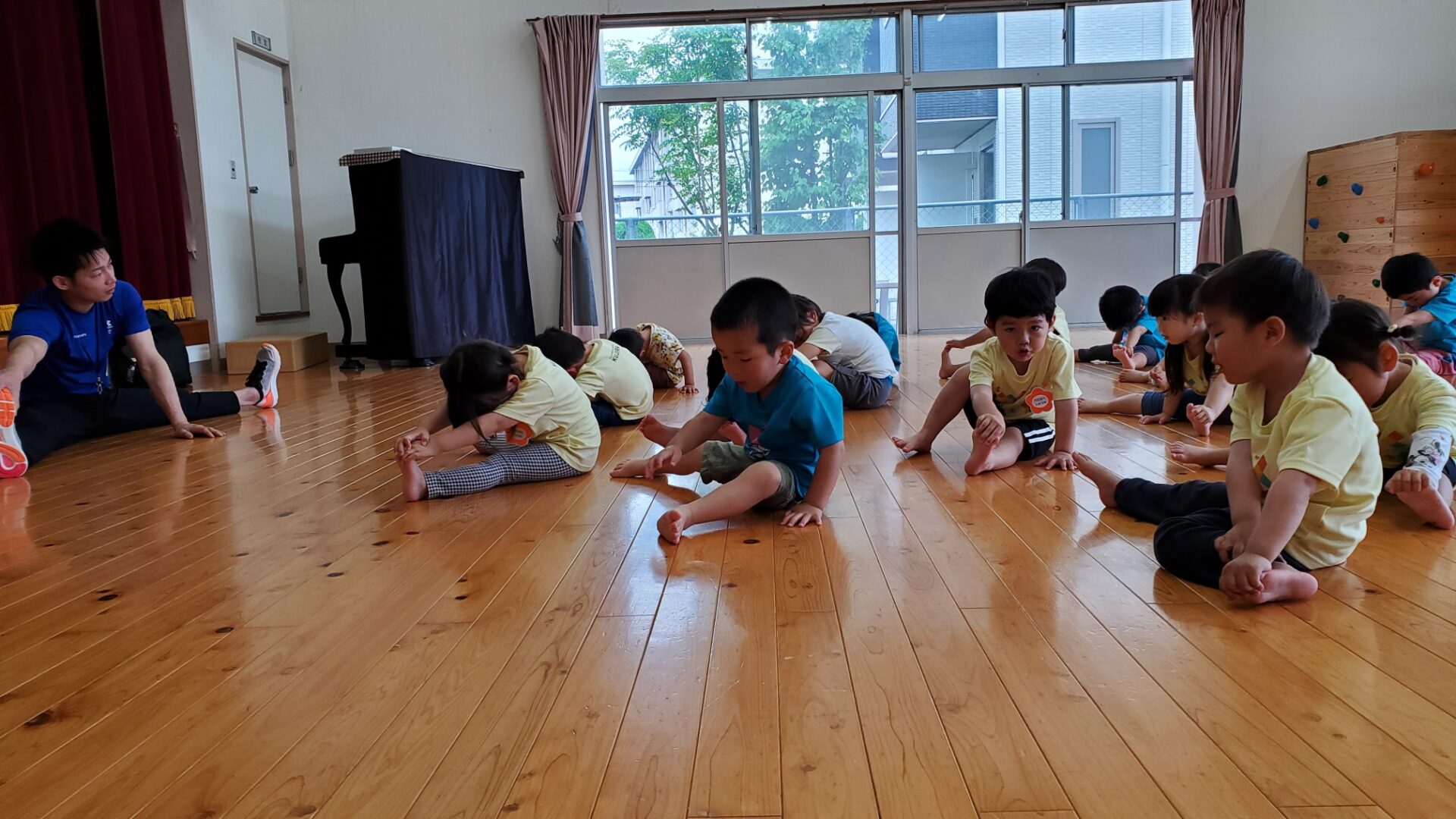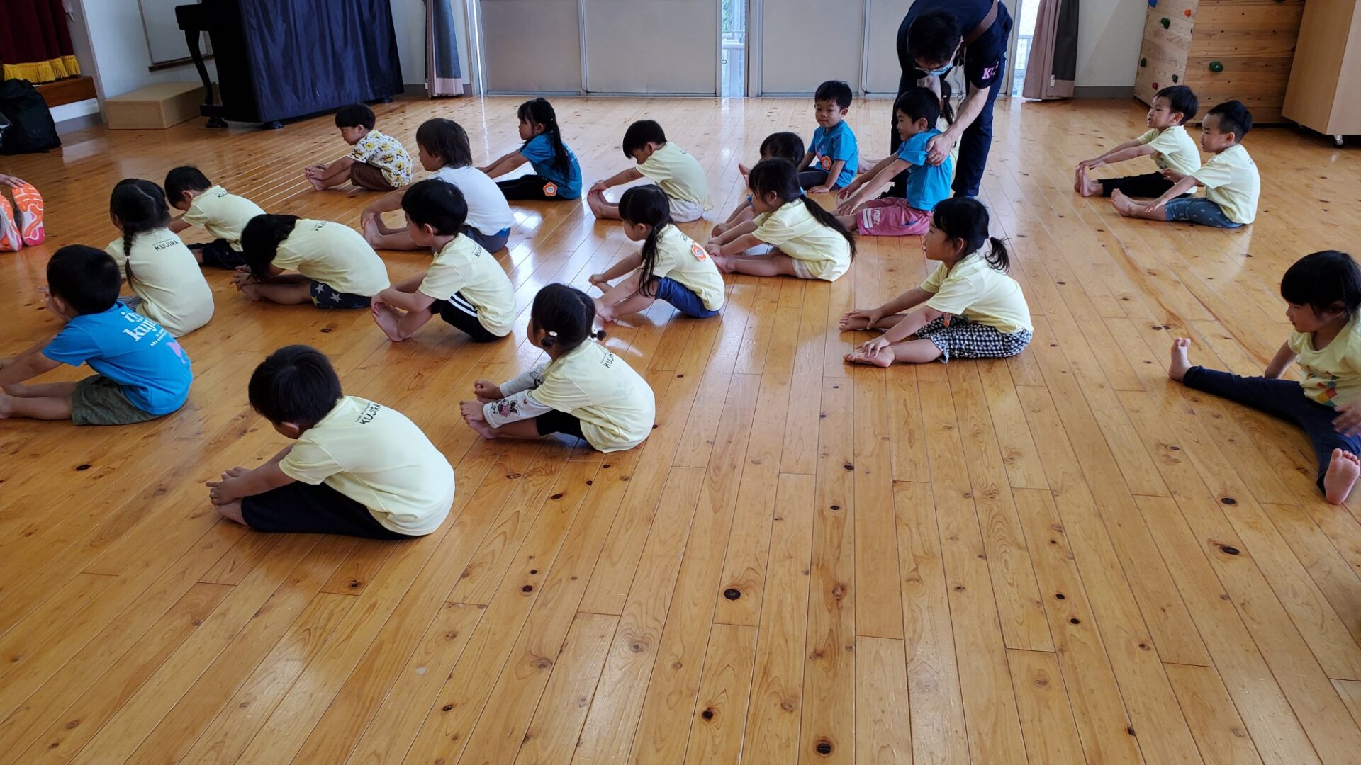 本日は、にじチームのけんスポ(体操教室)の様子をご紹介します。昨年度は月1回ほどのけんスポでしたが、今年度から月4回実施しています。すっかり挨拶も上達してきました。柔軟体操もお手の物です。