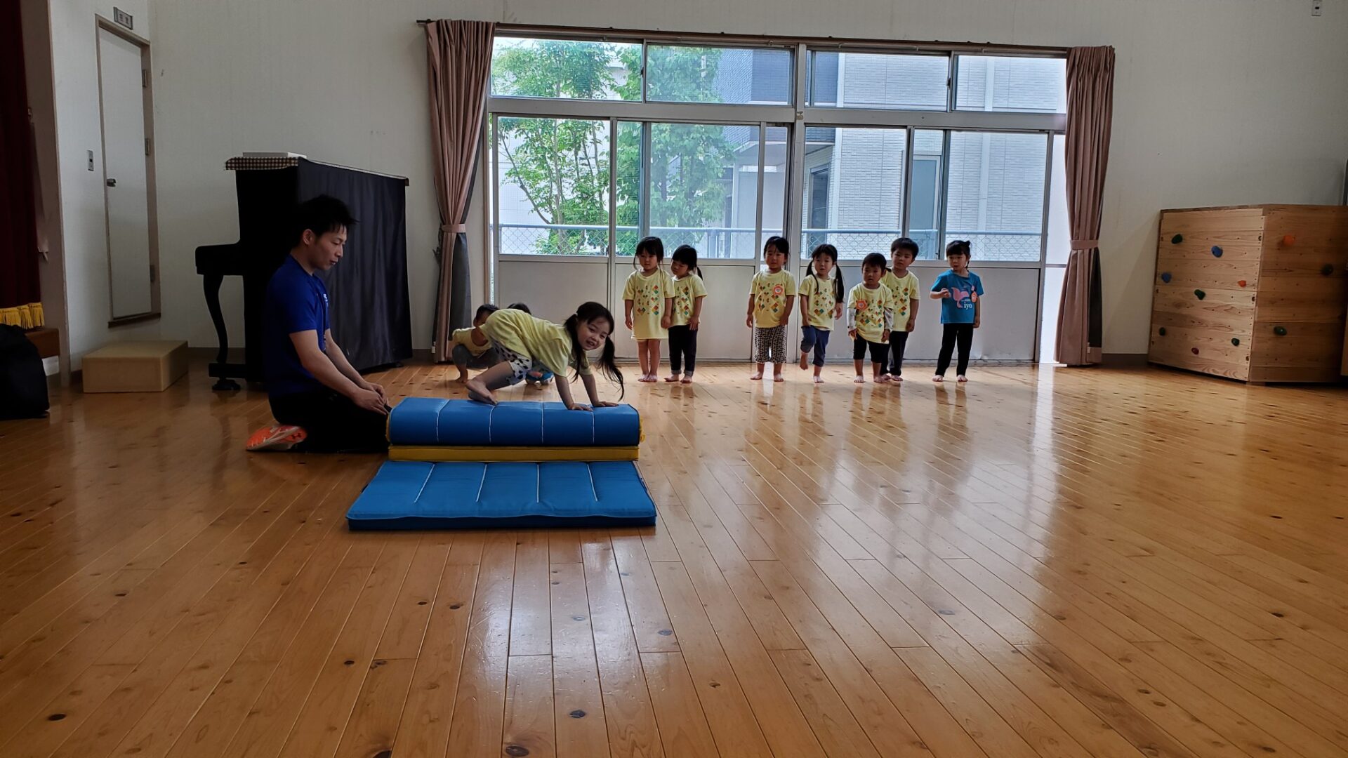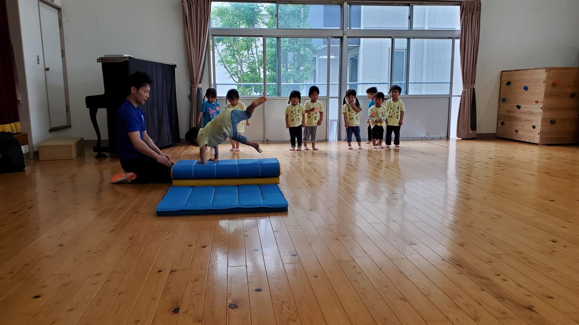 この日は、マットで前転と側転の練習をしました。出来ることが少しずつ増えてきて、体操教室が楽しくなってきているにじチームのお友だち。一年間、色々な事を教えてもらおうね。