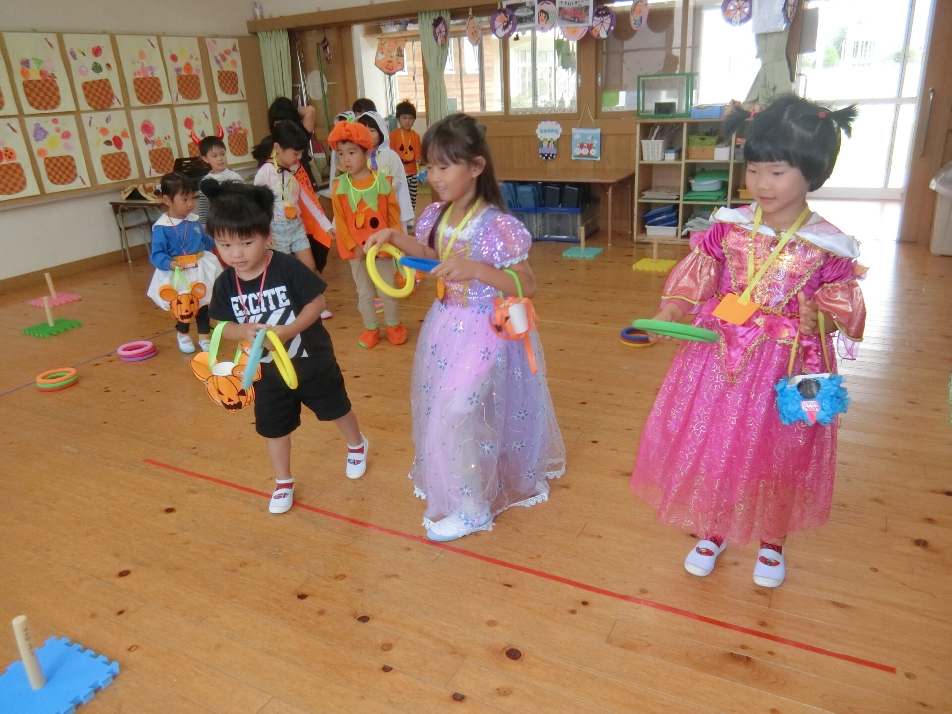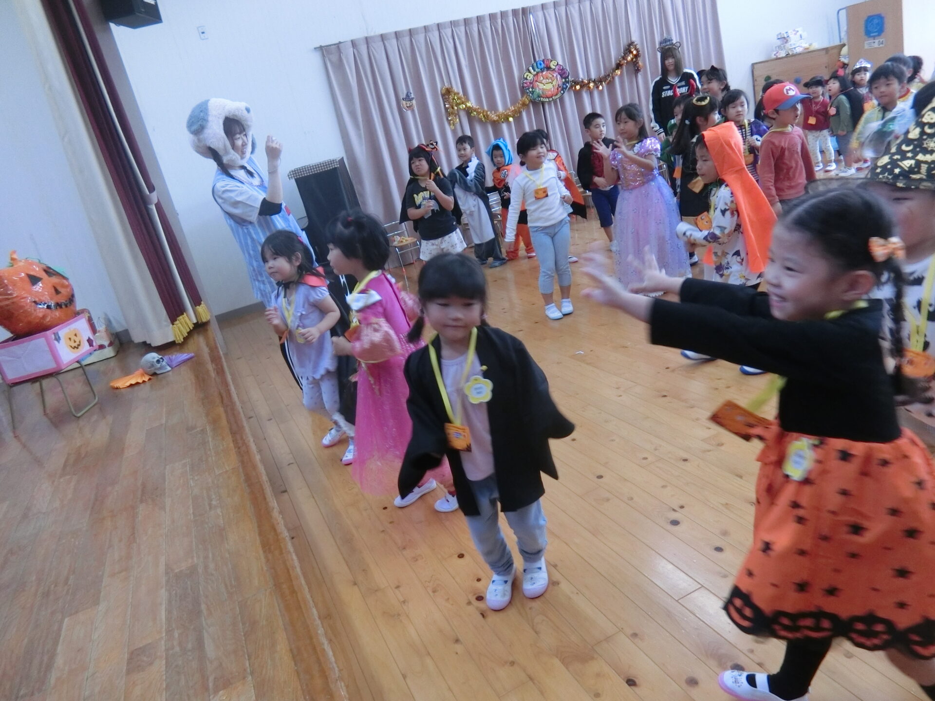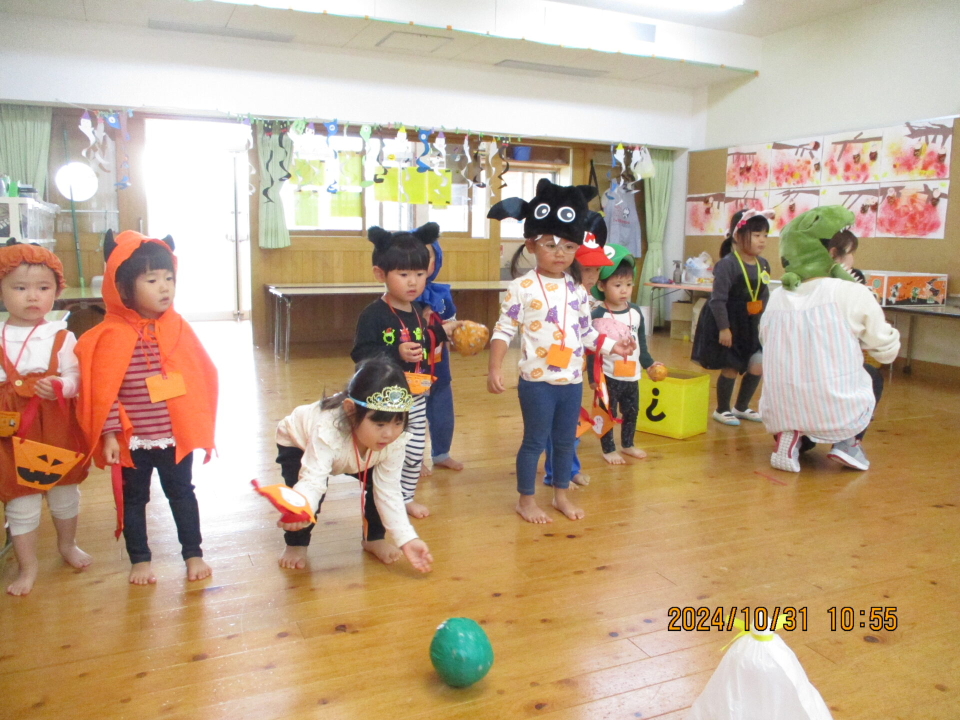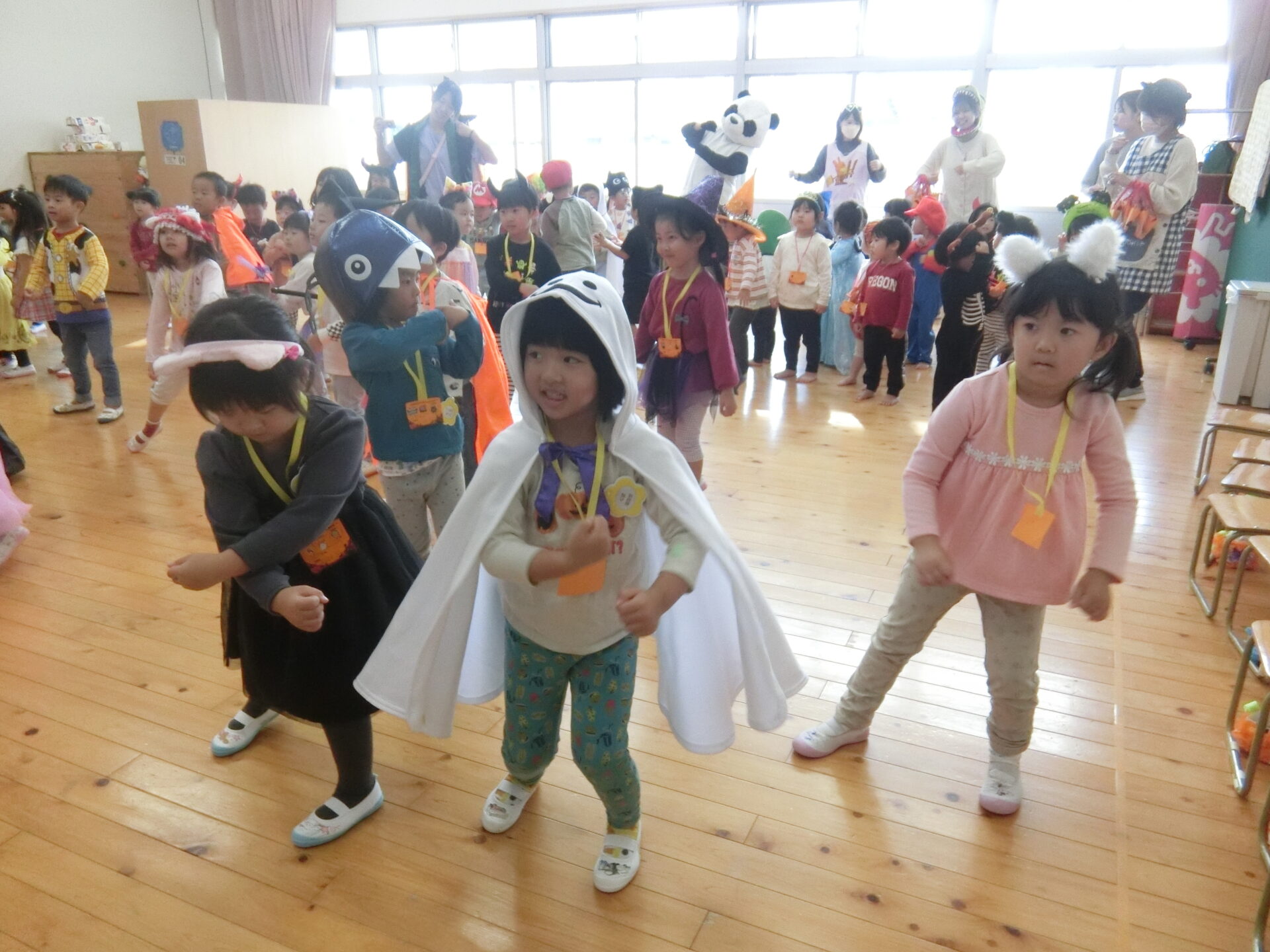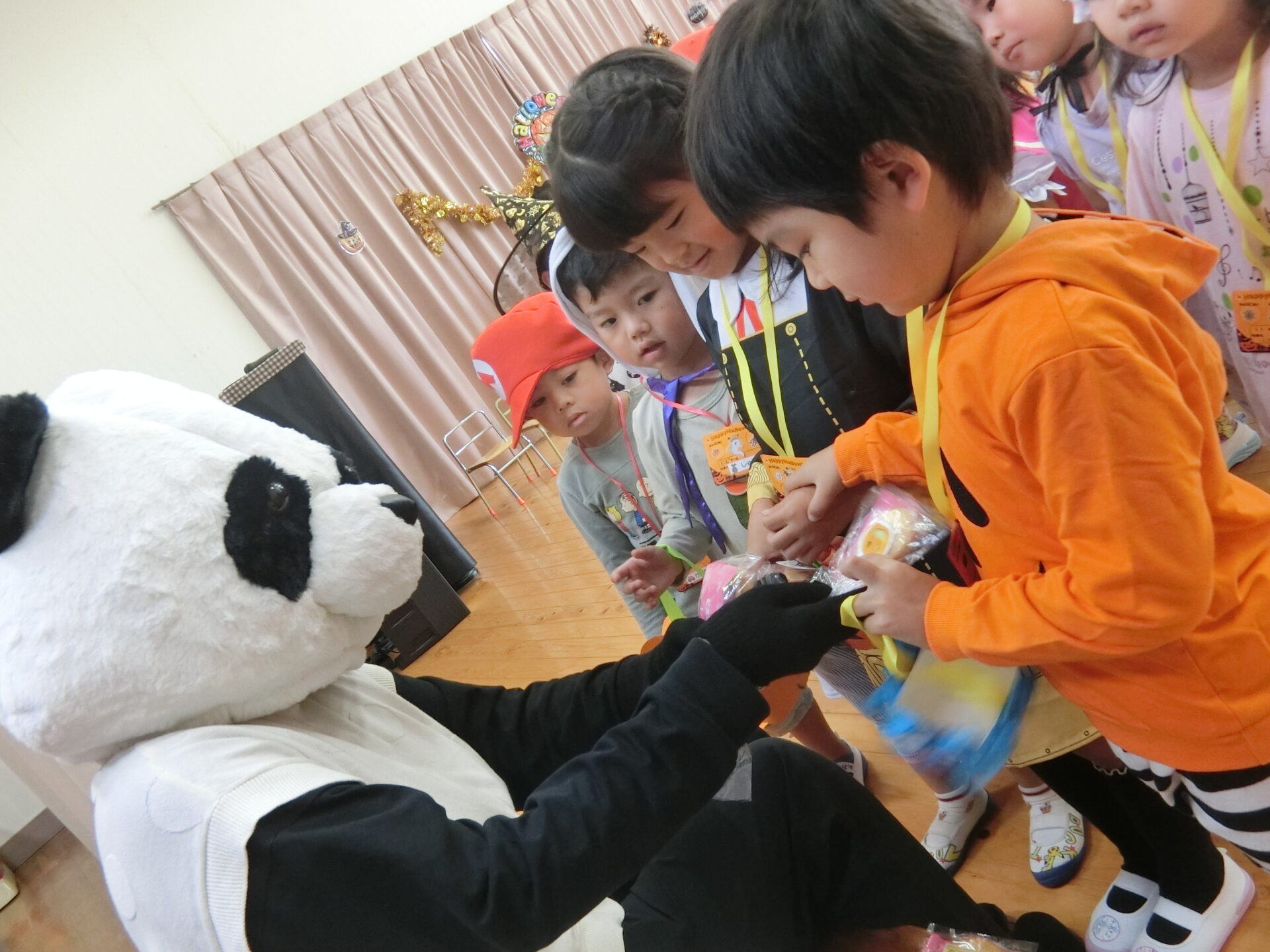 そして、楽しいハロウィンパーティーが始まりです。3か所に分かれてゲームが開催されました。輪投げや、ボーリング、匂い当てゲームがありました。にじチーム(3歳児)そらチーム(4歳児)くじらチーム(5歳児)が一人ずつ3人一チームになってゲームを楽しみました。なかなかうまくいかない時は、大きいお友だちが手伝ってくれたりして、みんなとてもいきいきとした表情です。ゲームが終わったら、お楽しみの「トリックオアトリート!」「お菓子くれないといたずらしちゃうぞ」の合言葉で、パンダさんからお菓子を受け取る子どもたちでした。お菓子をもらって、嬉しそうでした。最後はみんなでハロウィンダンスを踊って、今年のハロウィンは幕を閉じました。また来年楽しもうね。