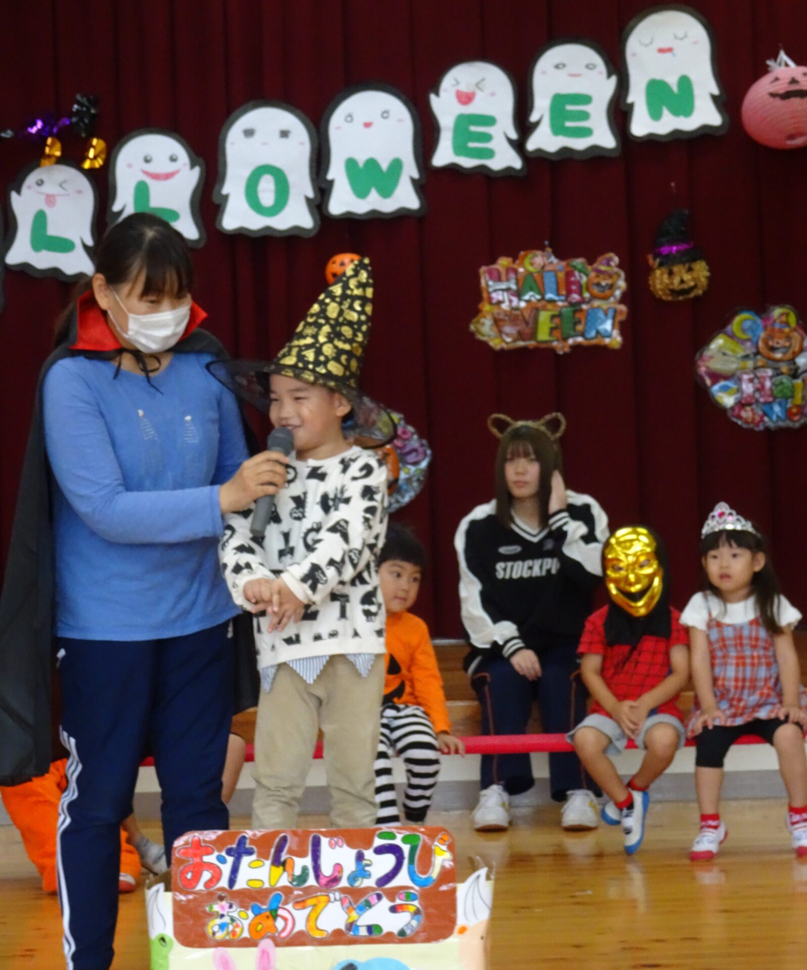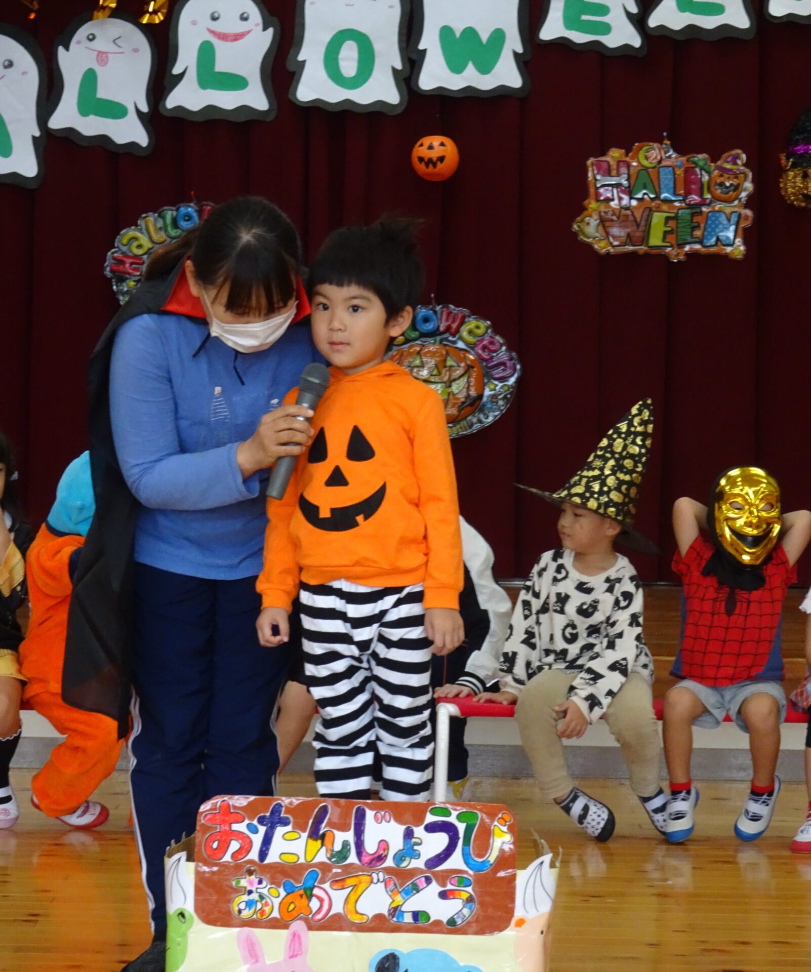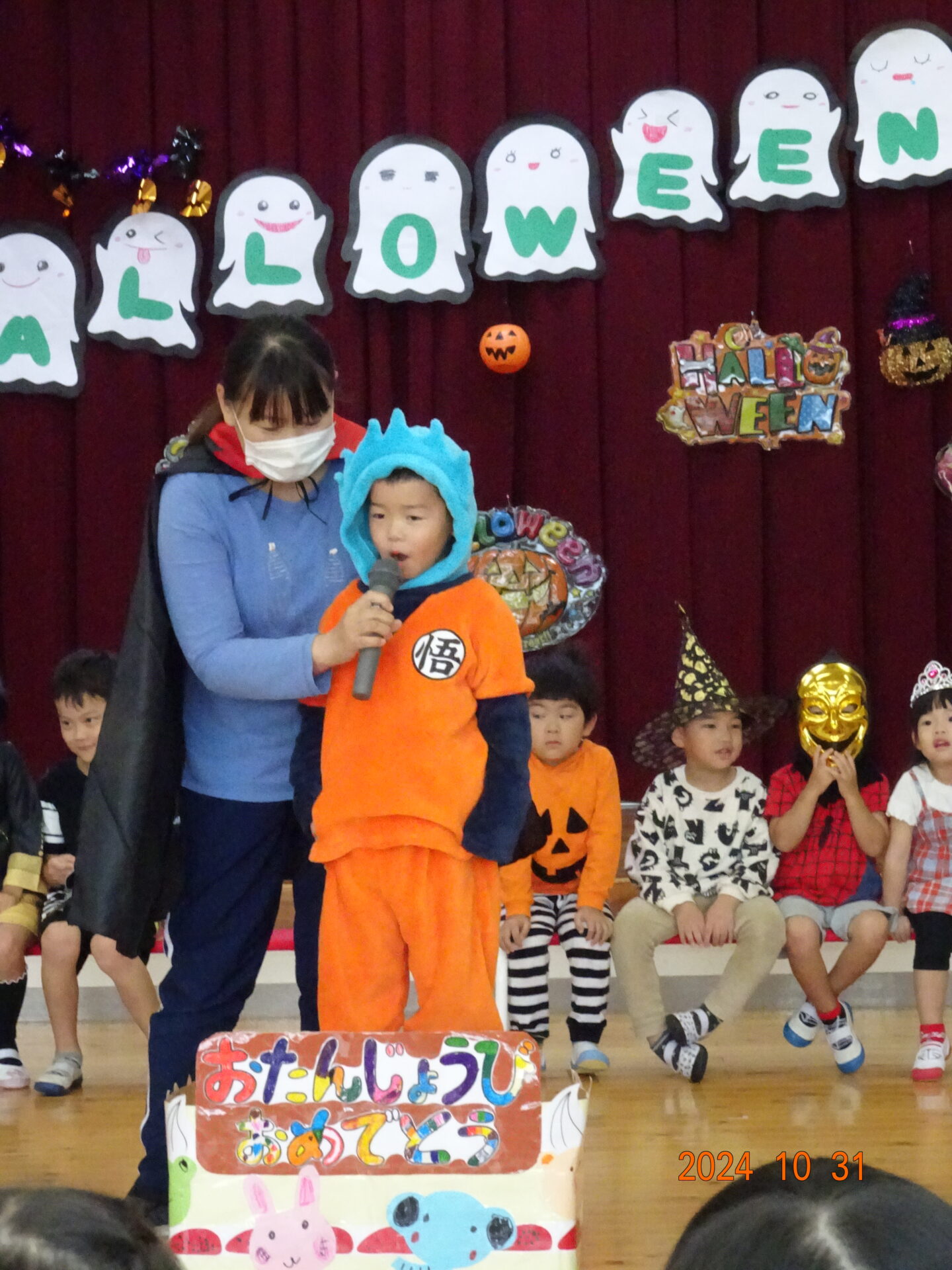 10月のお誕生会&ハロウィンパーティーの様子です。本来なら、くじらチームさん(5歳児)は6名の誕生者でしたが、この日出席していたのは、3名でした。ちょっぴり寂しいくじらチームさんでしたが、そらチームさん(4歳児)とにじチームさん(3歳児)が盛り上げてくれました。