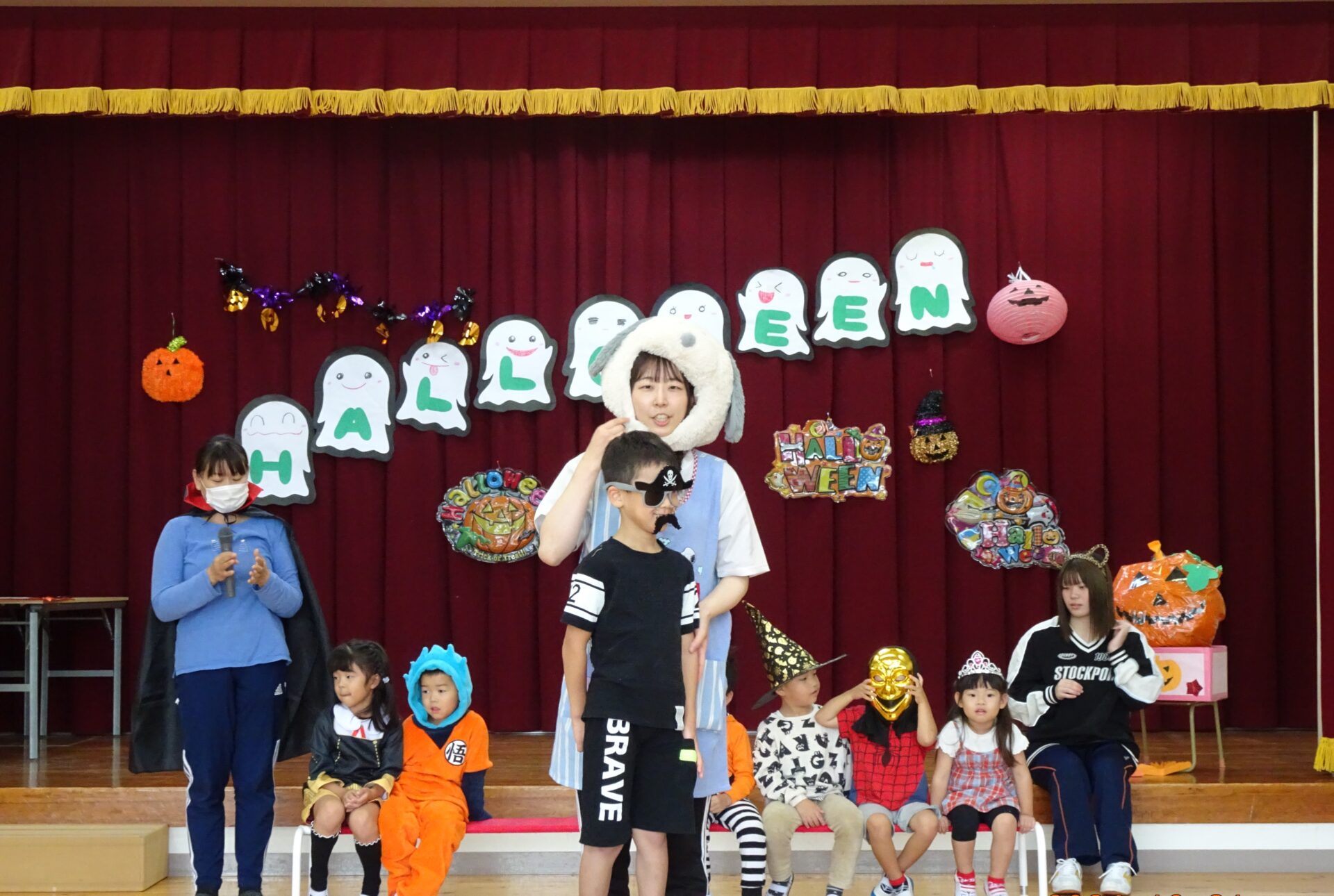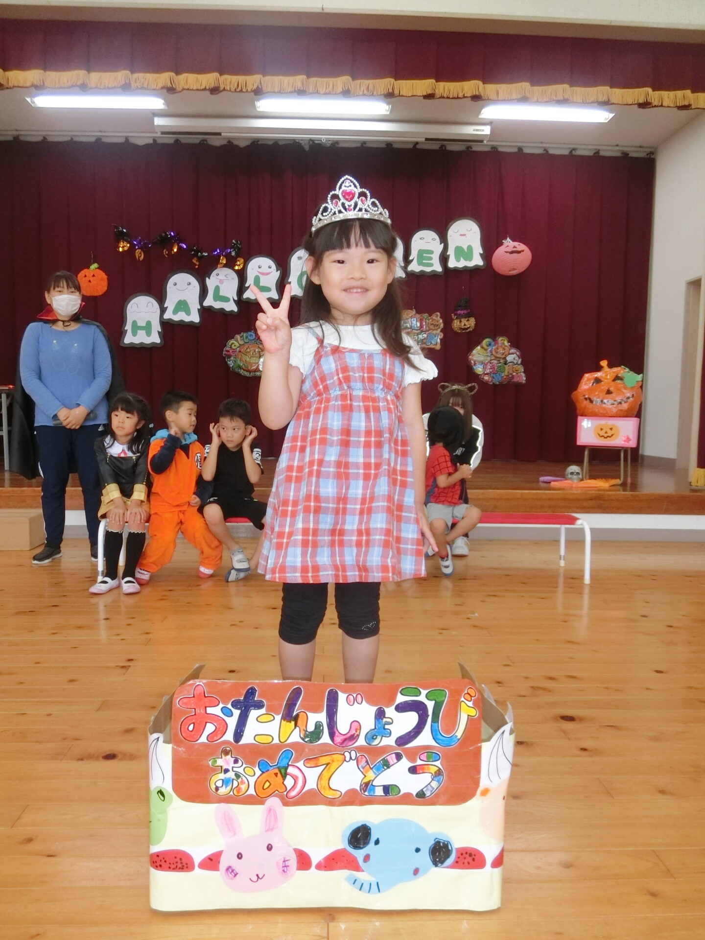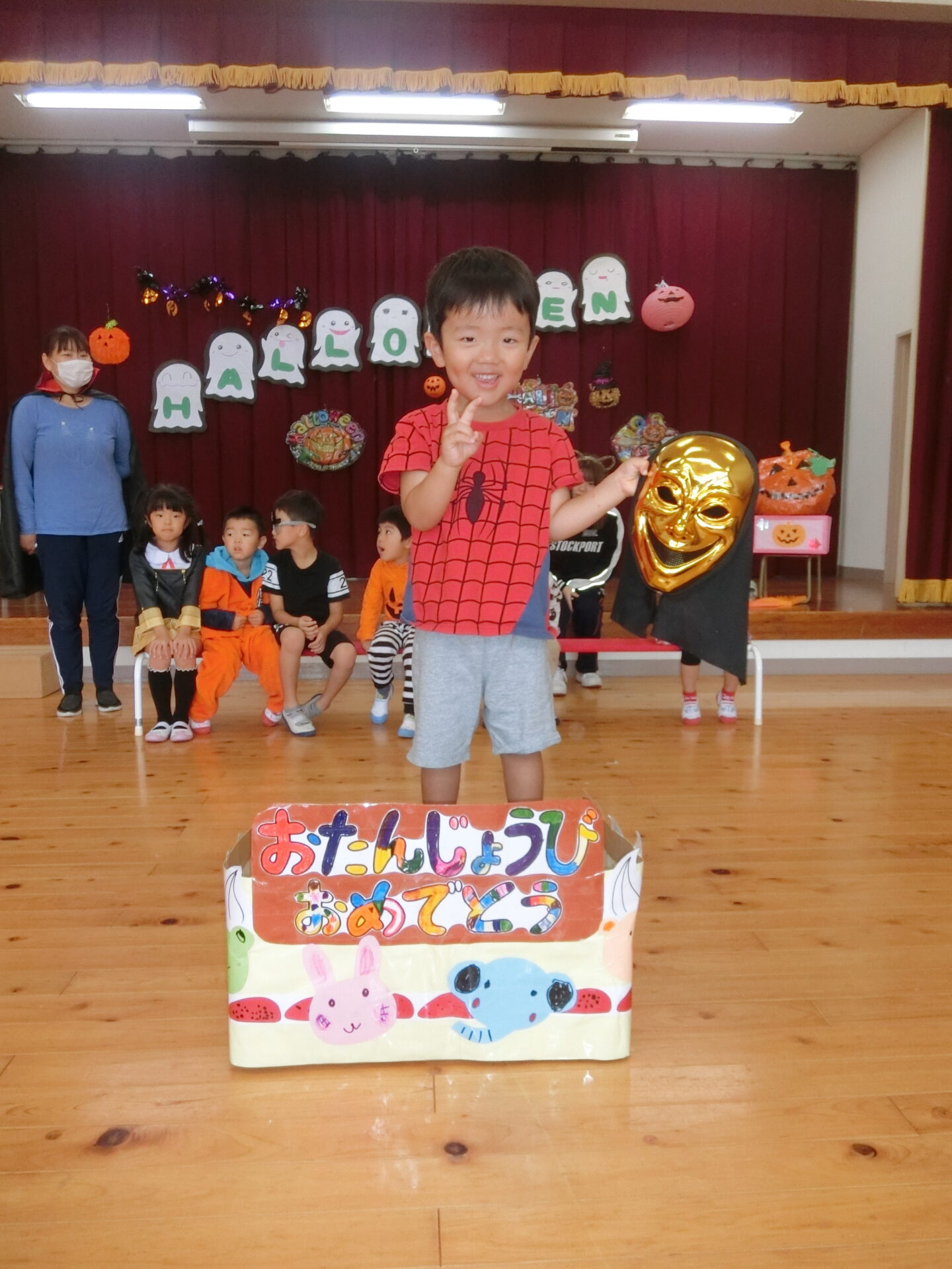 10月のお誕生会&ハロウィンパーティーの様子です。本来なら、くじらチームさん(5歳児)は6名の誕生者でしたが、この日出席していたのは、3名でした。ちょっぴり寂しいくじらチームさんでしたが、そらチームさん(4歳児)とにじチームさん(3歳児)が盛り上げてくれました。