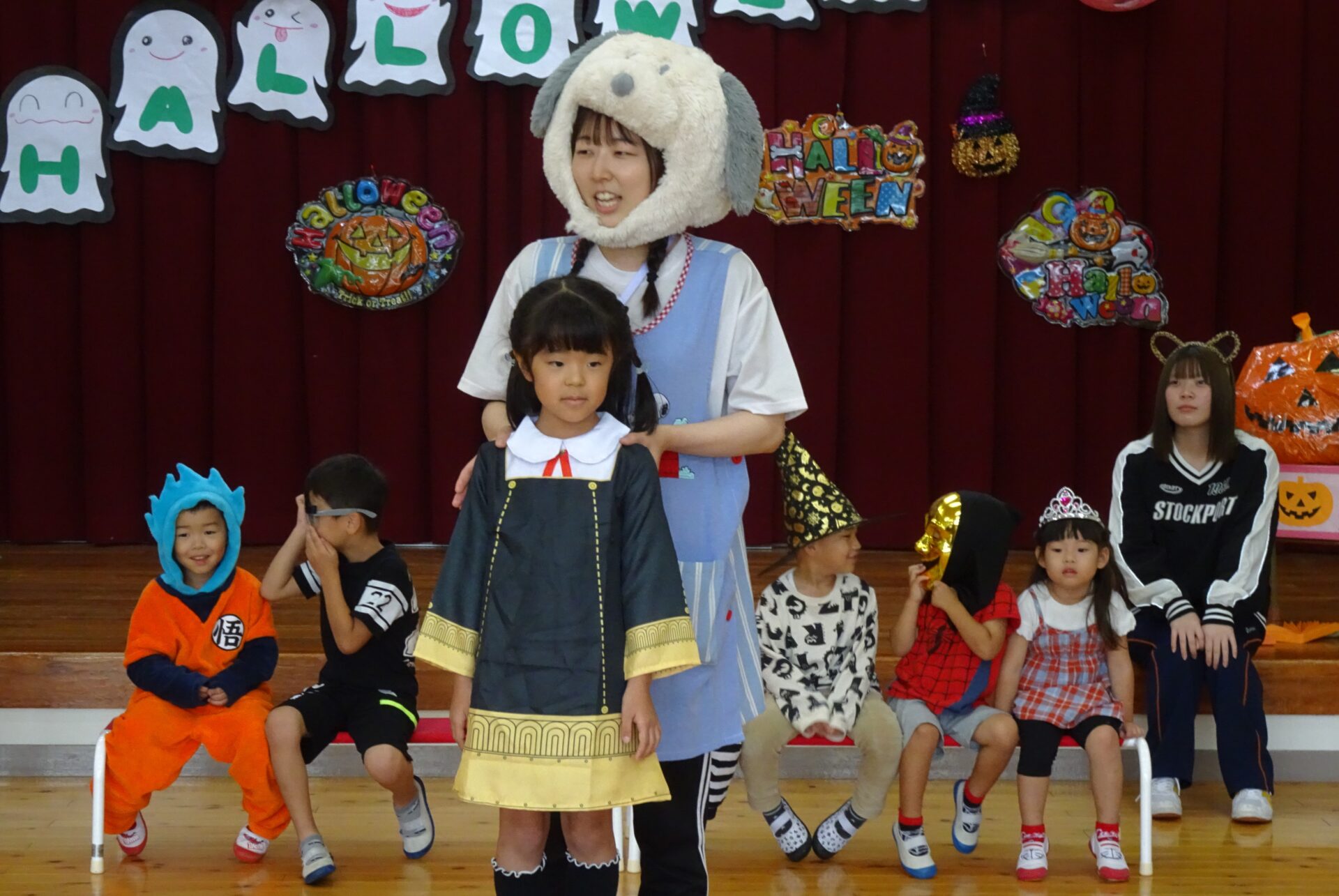 この後、ハロウィンパーティーが待っているので、みんな仮装しています。とても素敵です。これからもたくさん保育園で遊んで大きくなろうね。