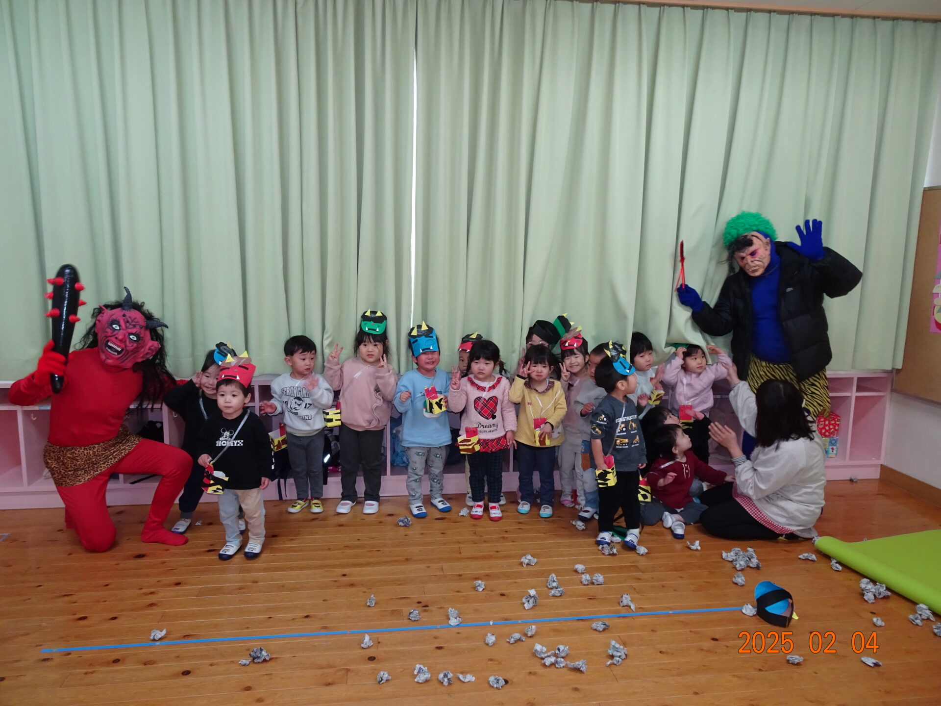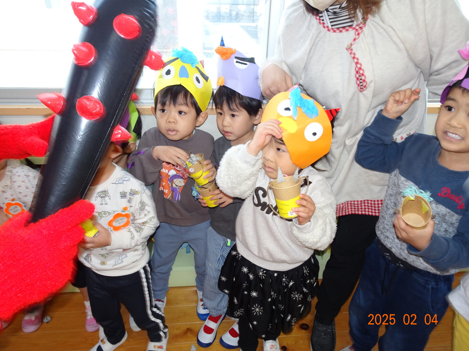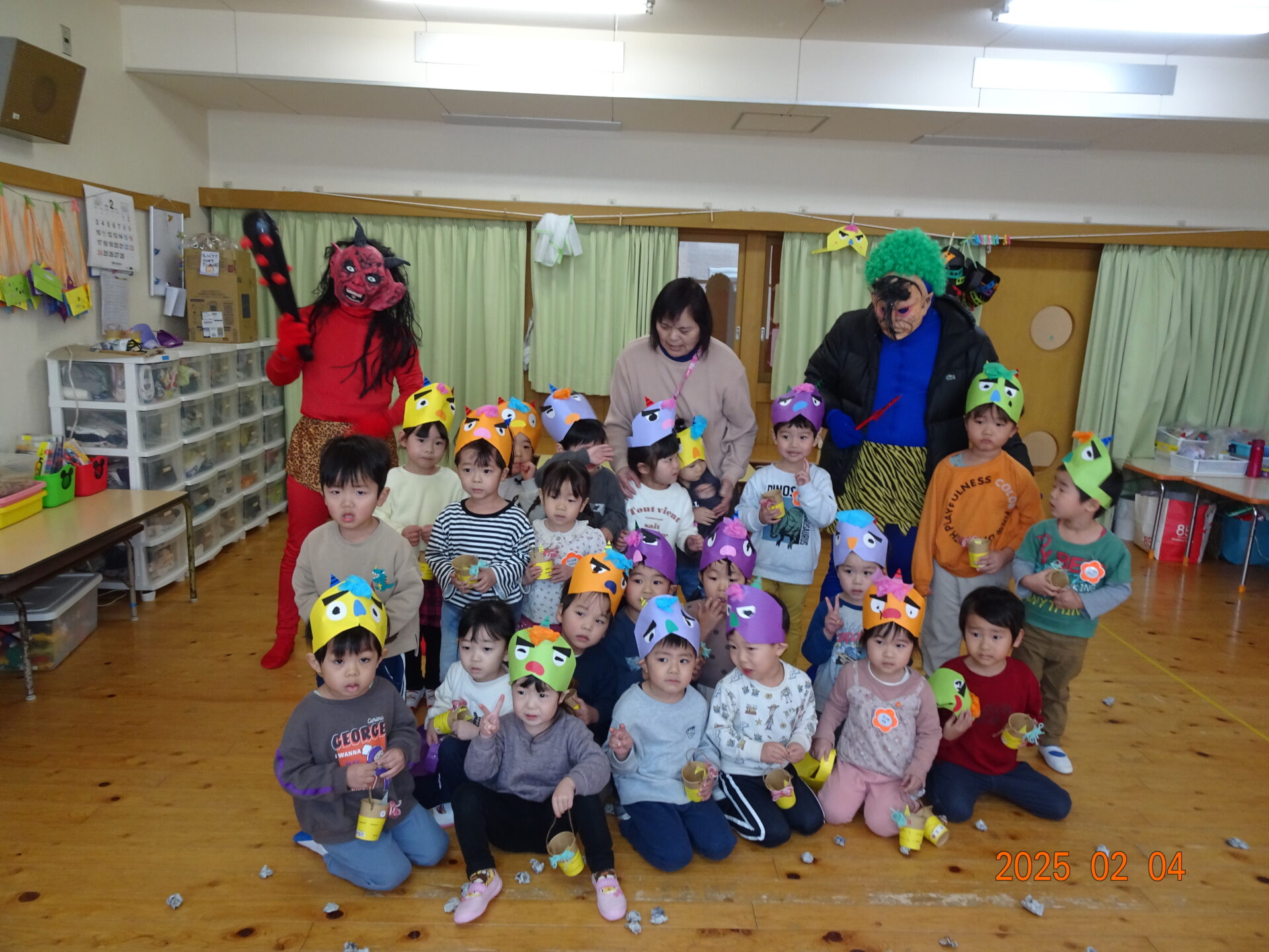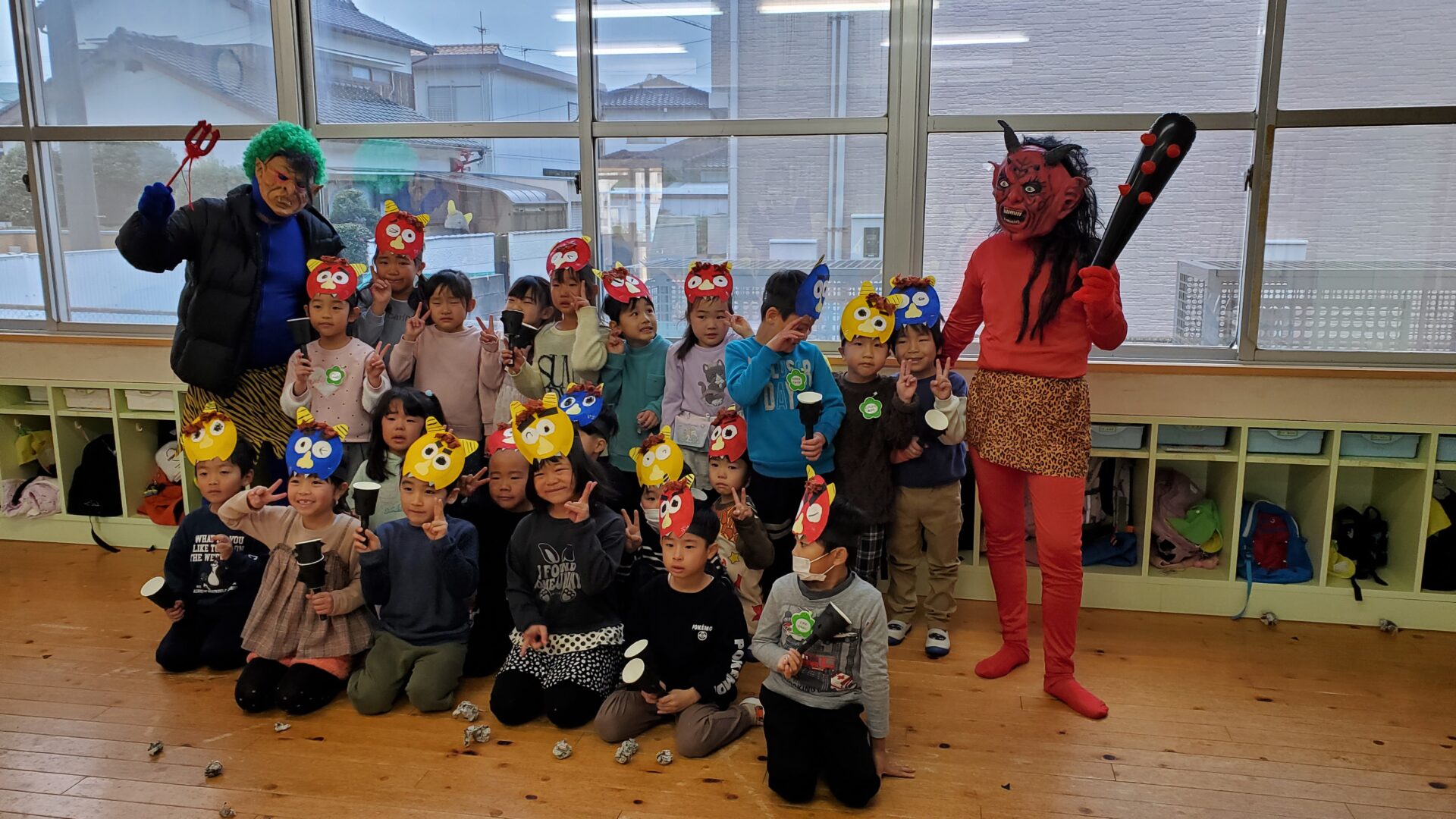 驚いて、泣いてしまいましたが、鬼さんと約束をして、最後は仲よく記念撮影をしました。心の中の悪い鬼をやっつけて、みんな、すがすがしい笑顔です。今年一年、元気で、楽しく過ごせるね。