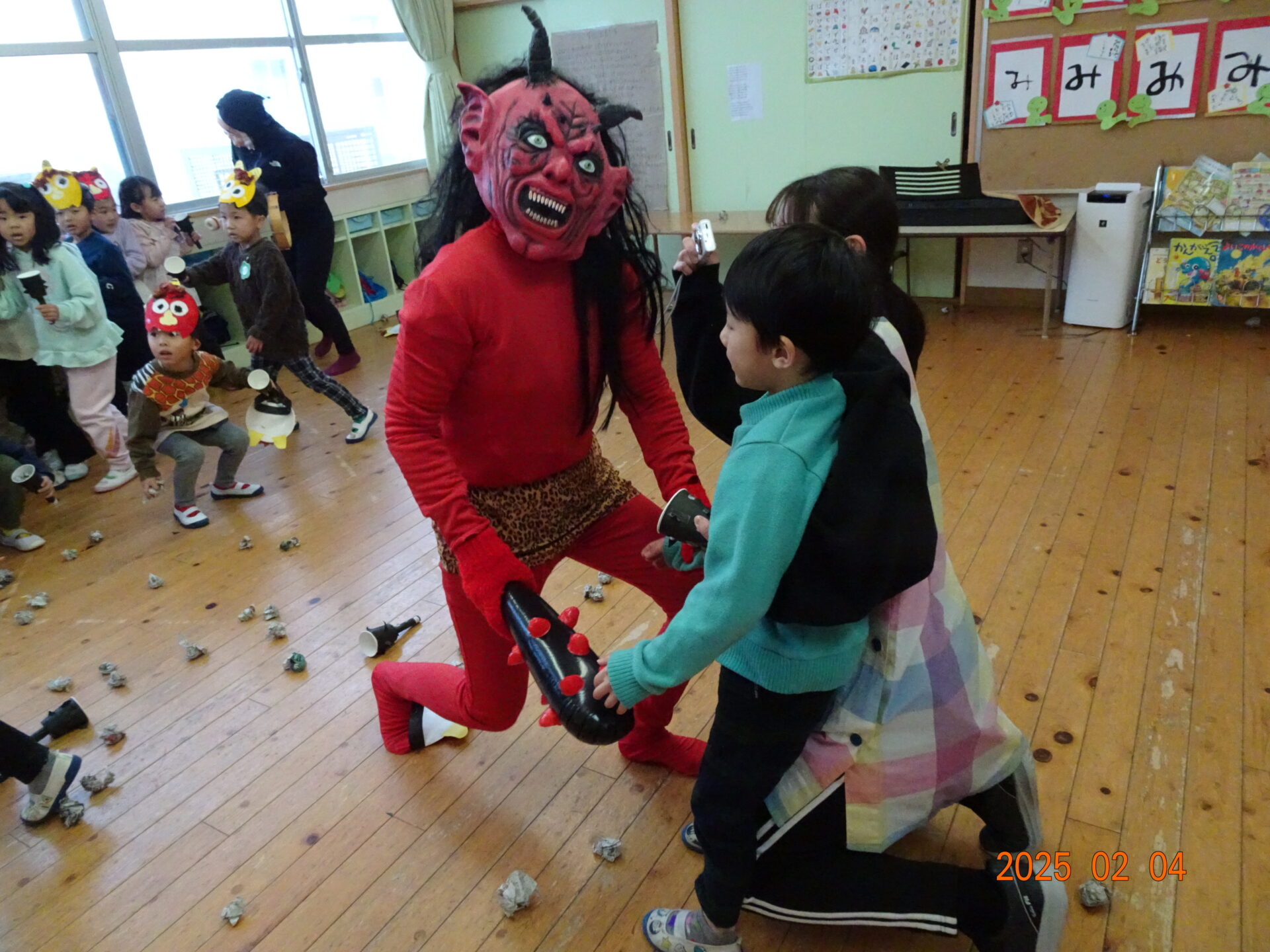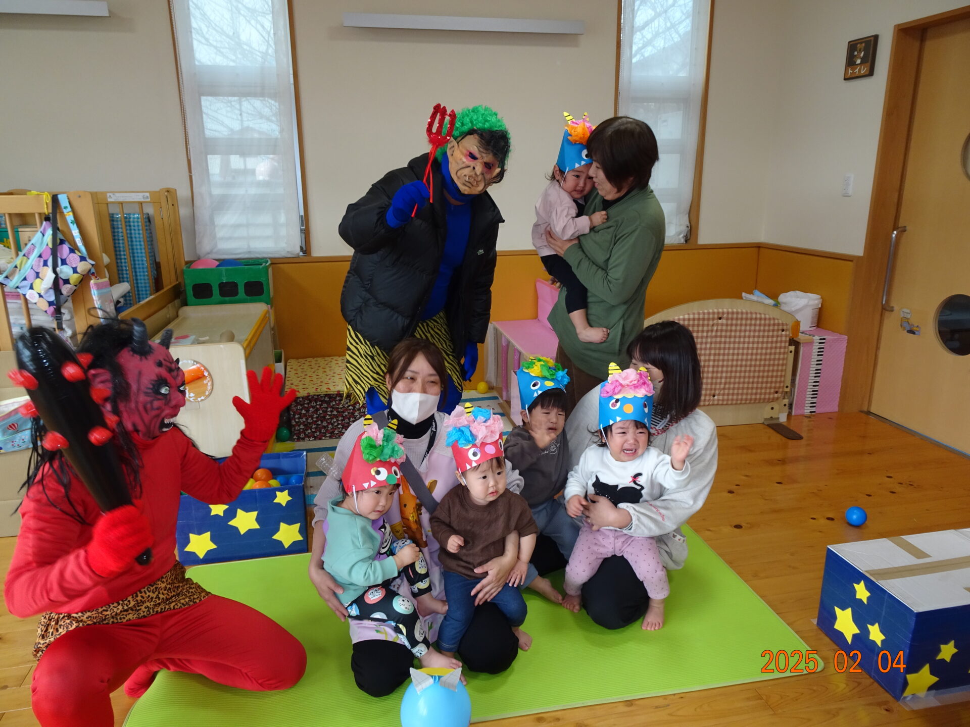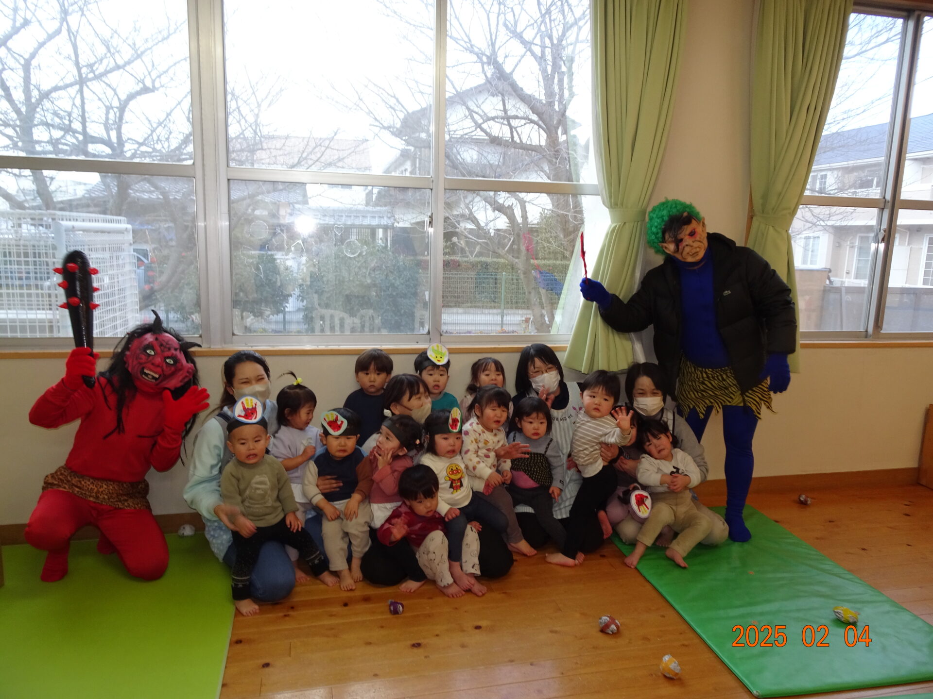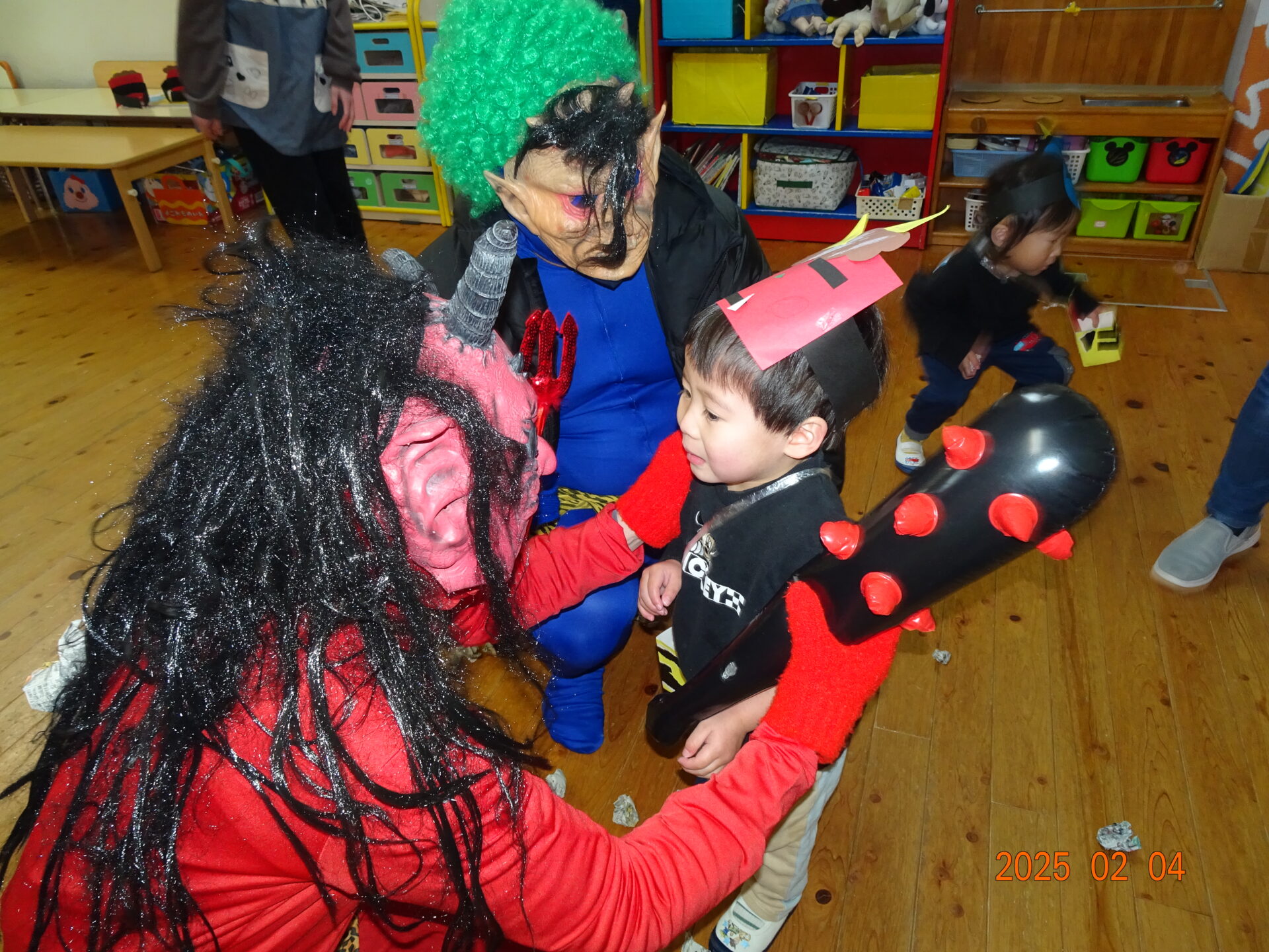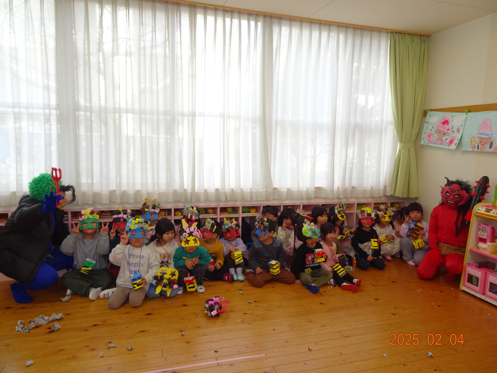 驚いて、泣いてしまいましたが、鬼さんと約束をして、最後は仲よく記念撮影をしました。心の中の悪い鬼をやっつけて、みんな、すがすがしい笑顔です。今年一年、元気で、楽しく過ごせるね。
