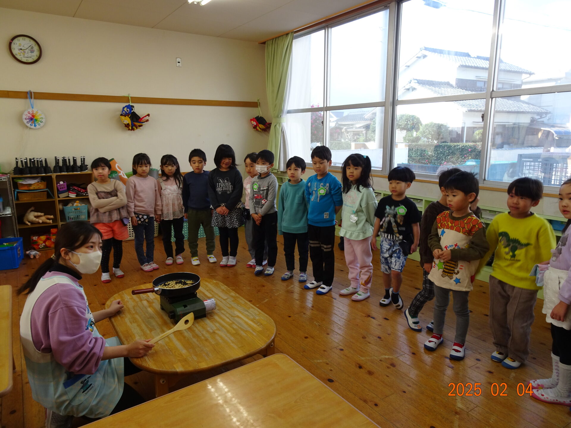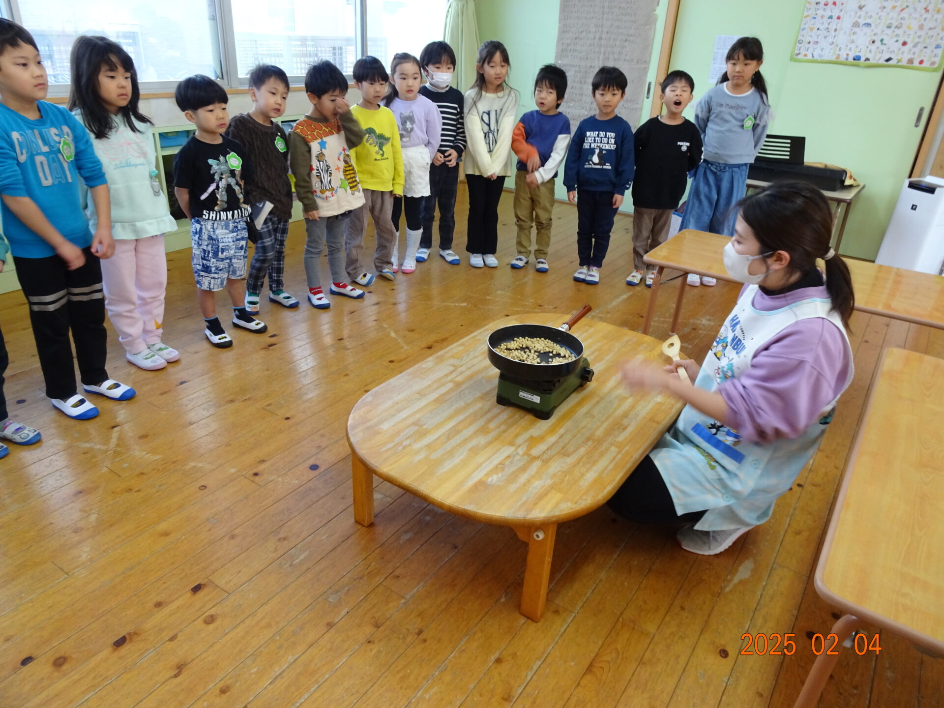 実は、この日、くじらチーム(年長:5歳児)さんは、誕生会の前に先生が豆を炒る様子を見せてもらっていました。