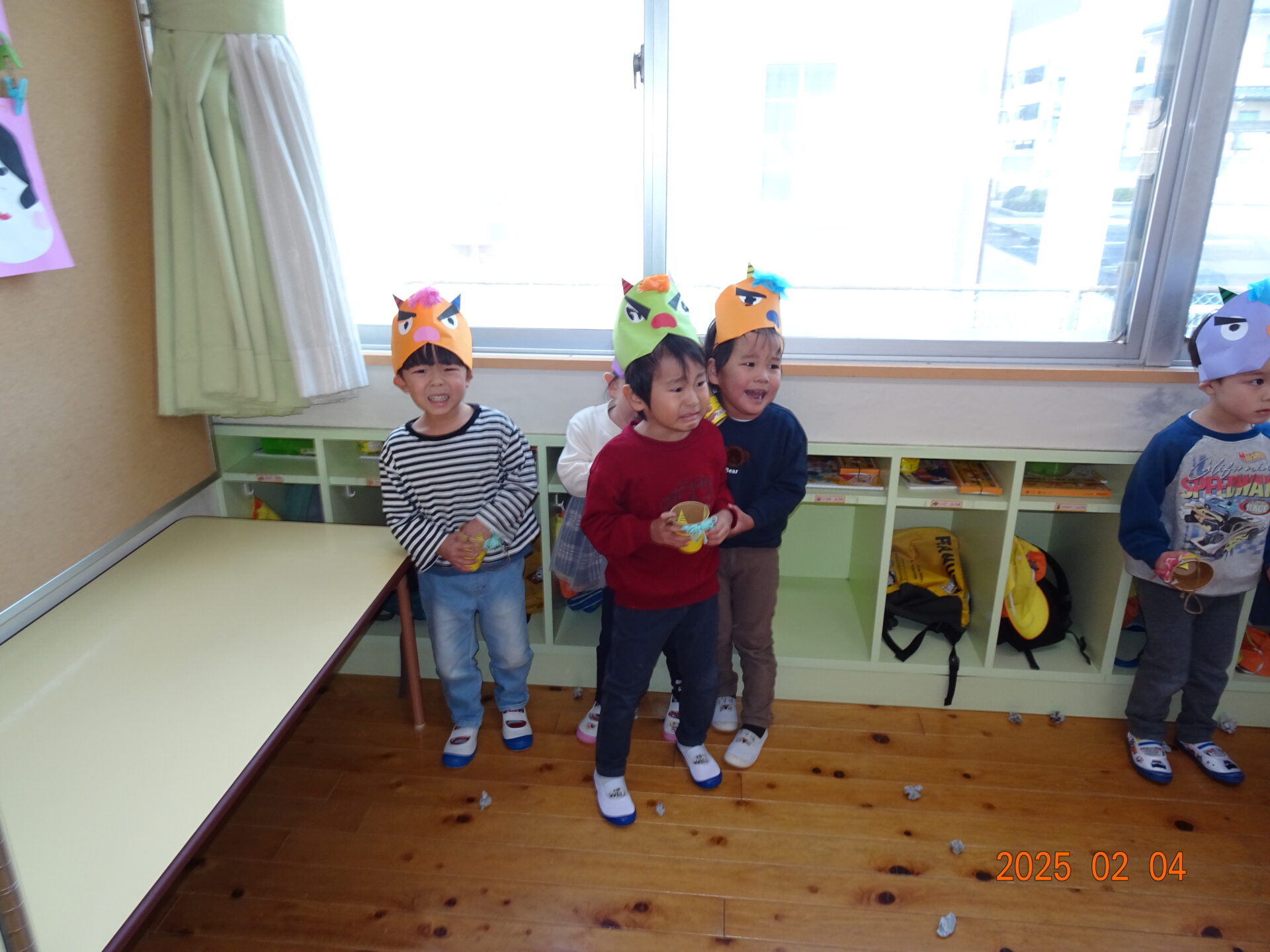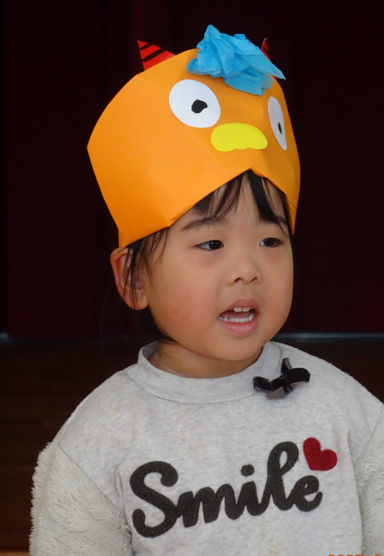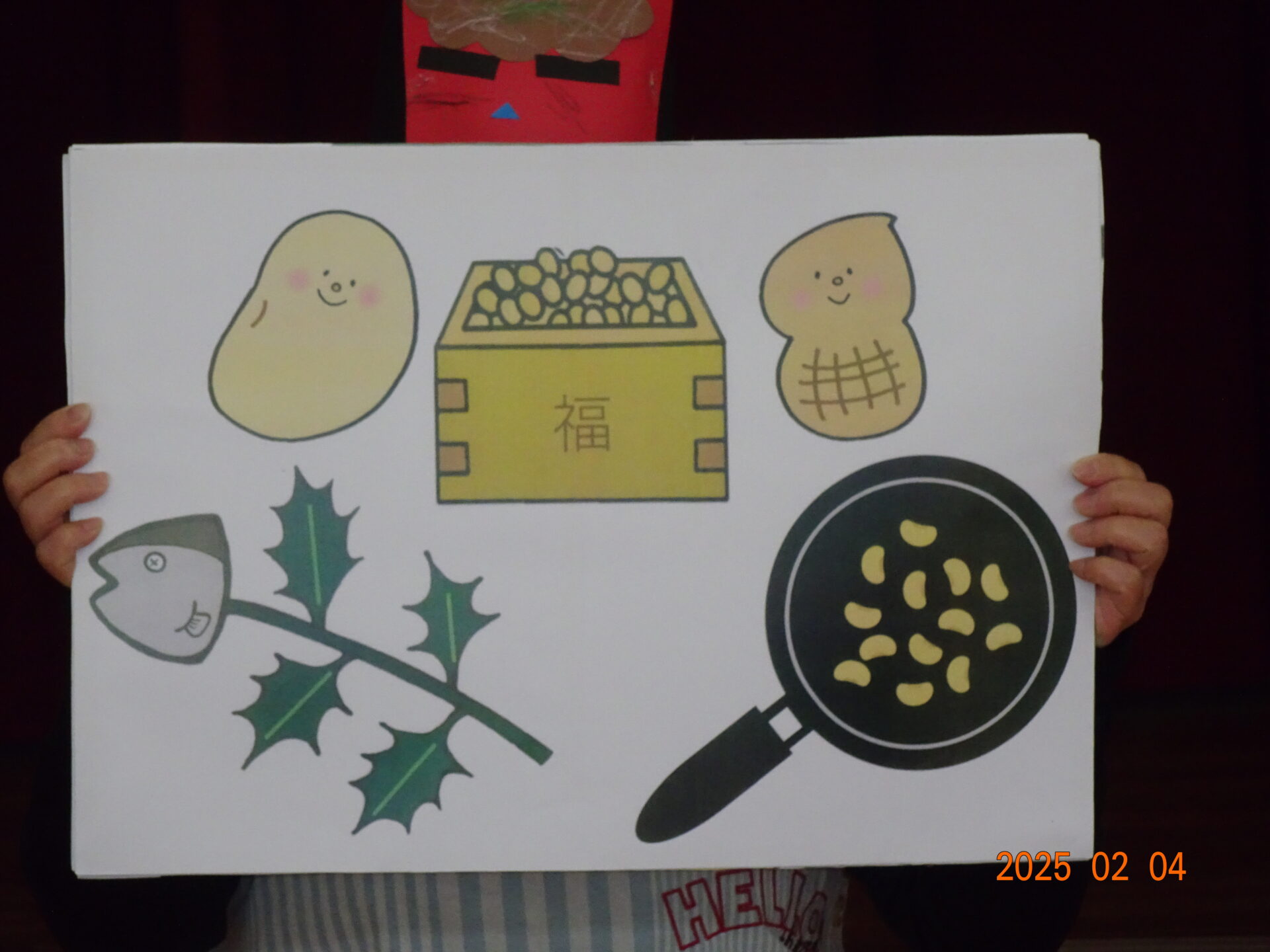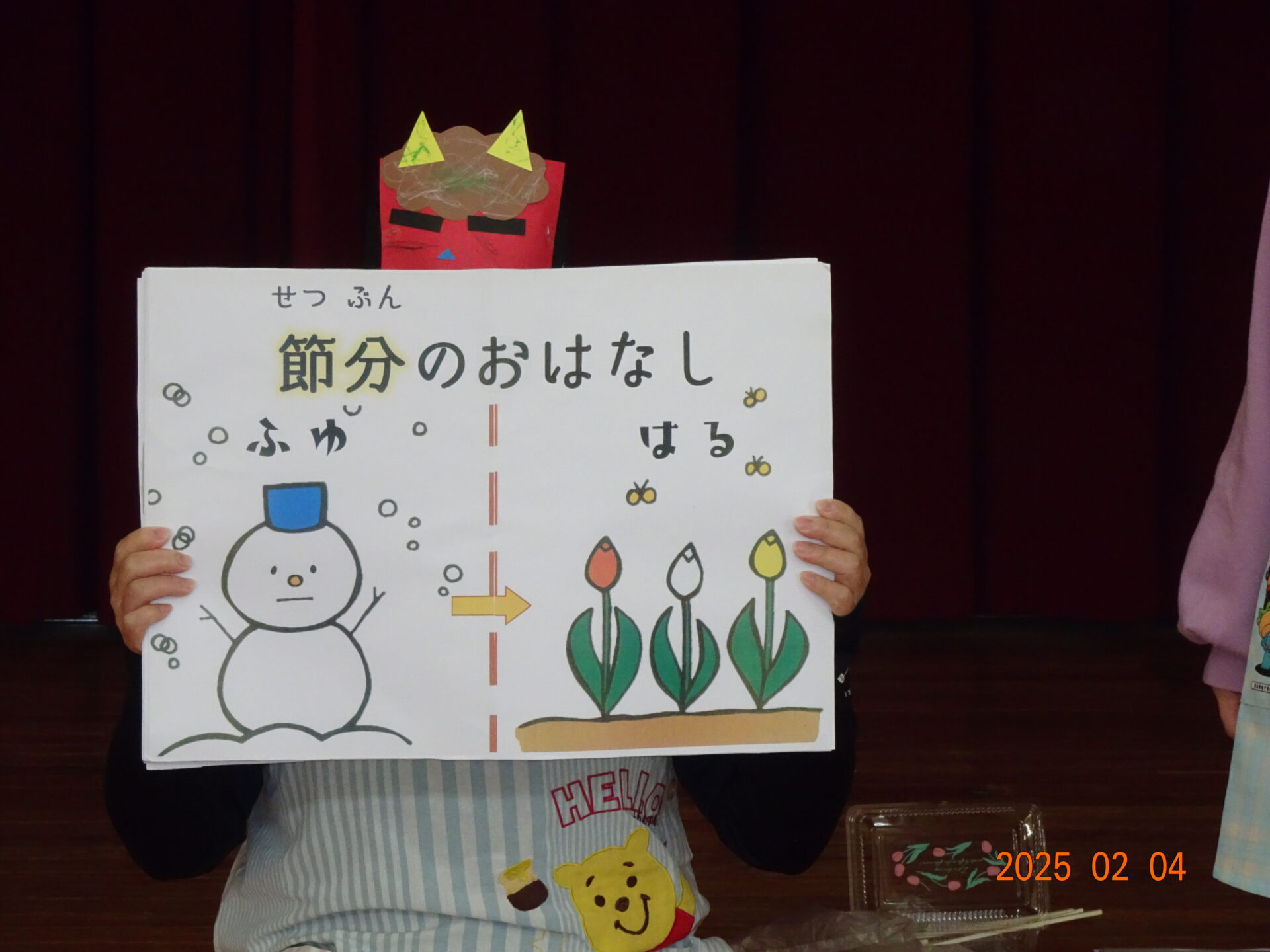 その後は、節分についてのお話を聞きました。節分のいわれや、鬼の嫌いな物、どうして豆まきをするのかのお話を聞きました。
