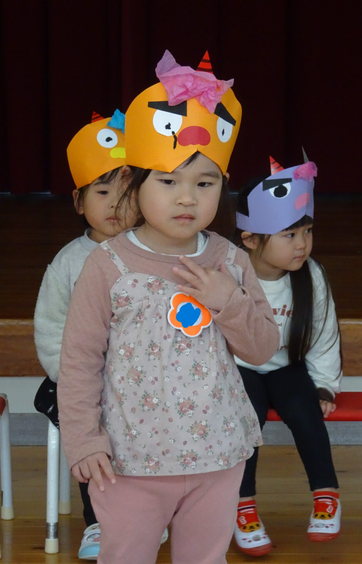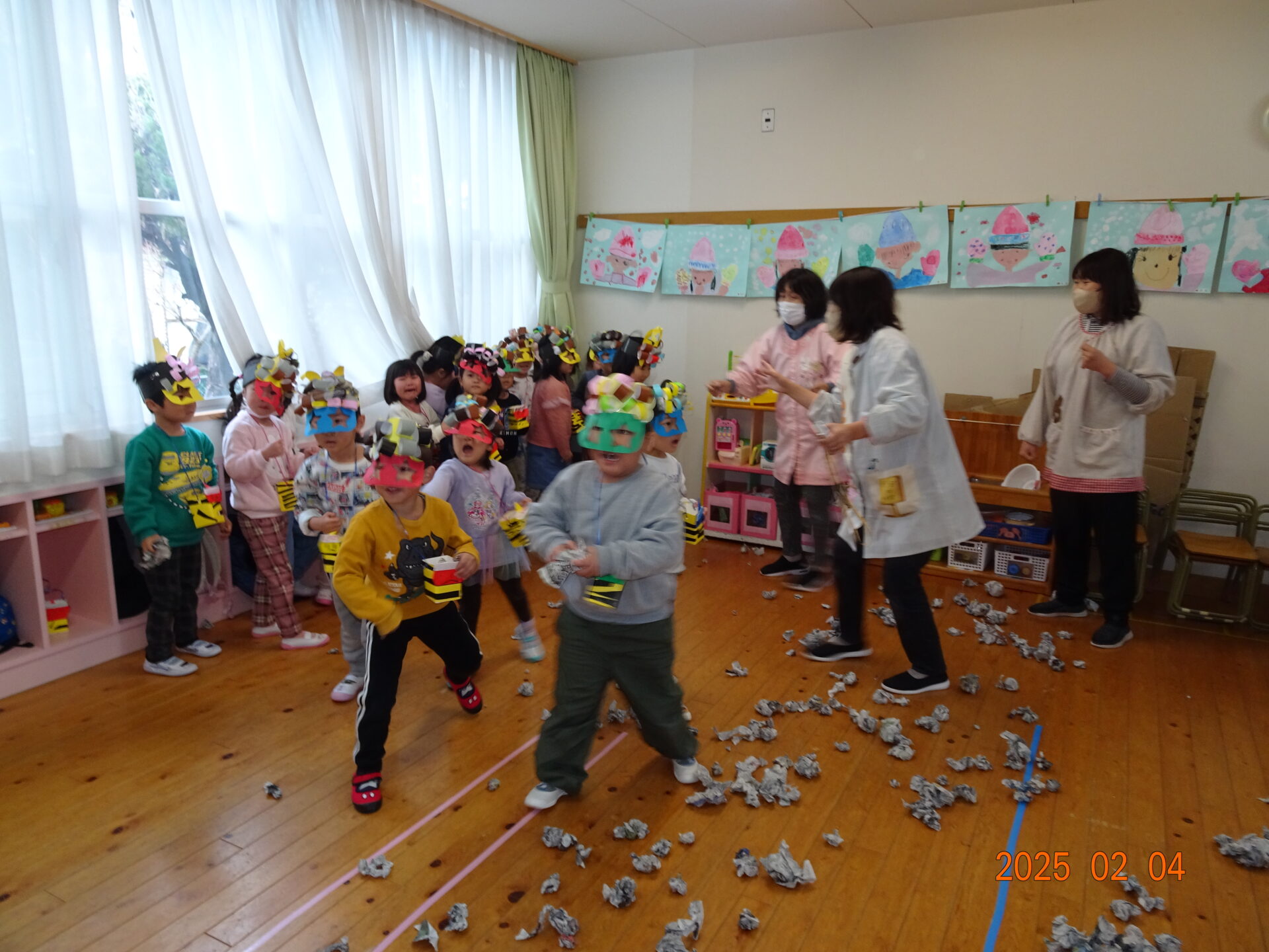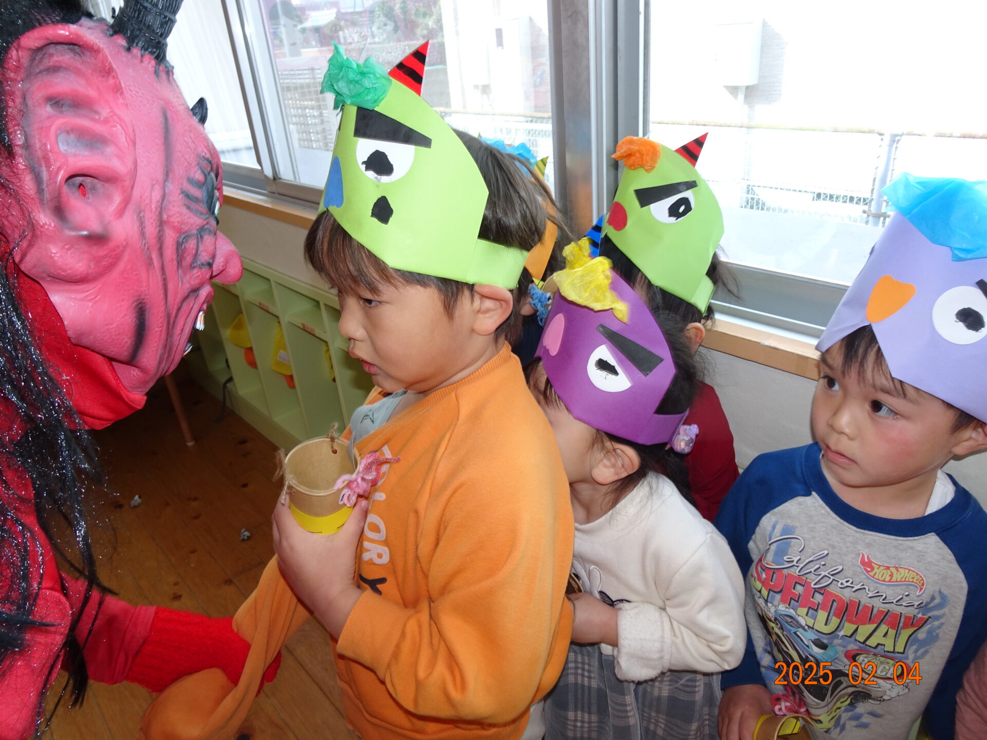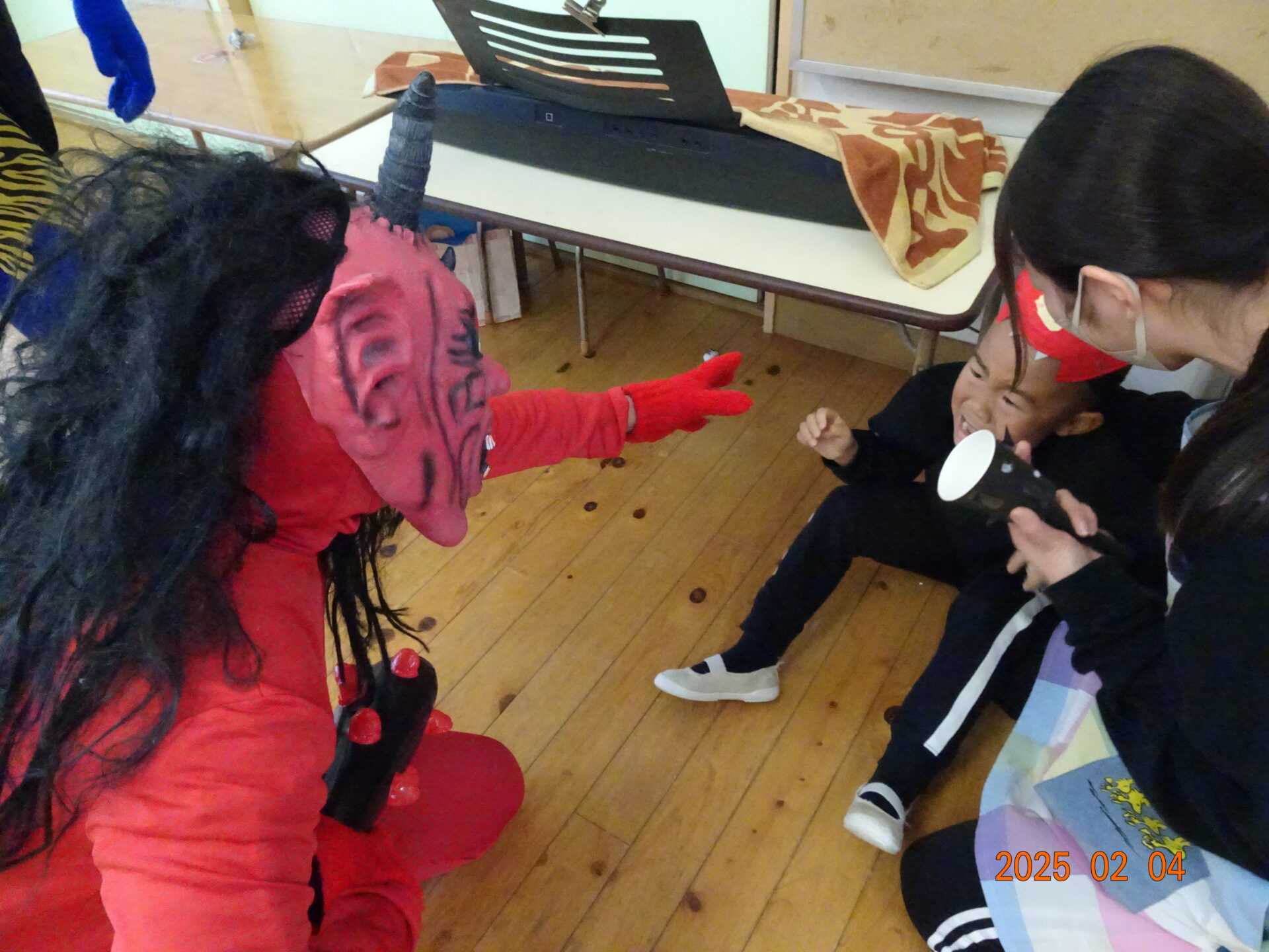 その後は、節分についてのお話を聞きました。節分のいわれや、鬼の嫌いな物、どうして豆まきをするのかのお話を聞きました。