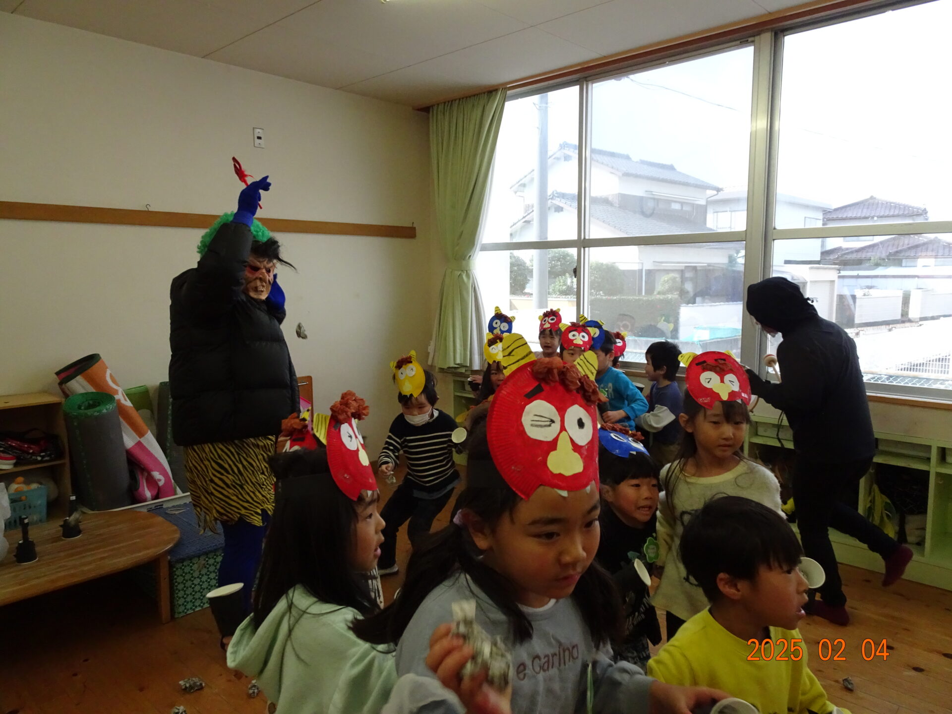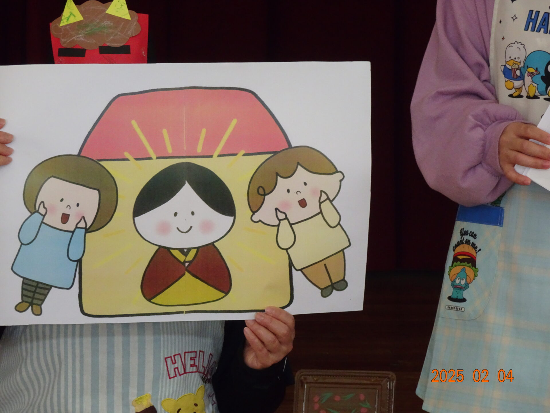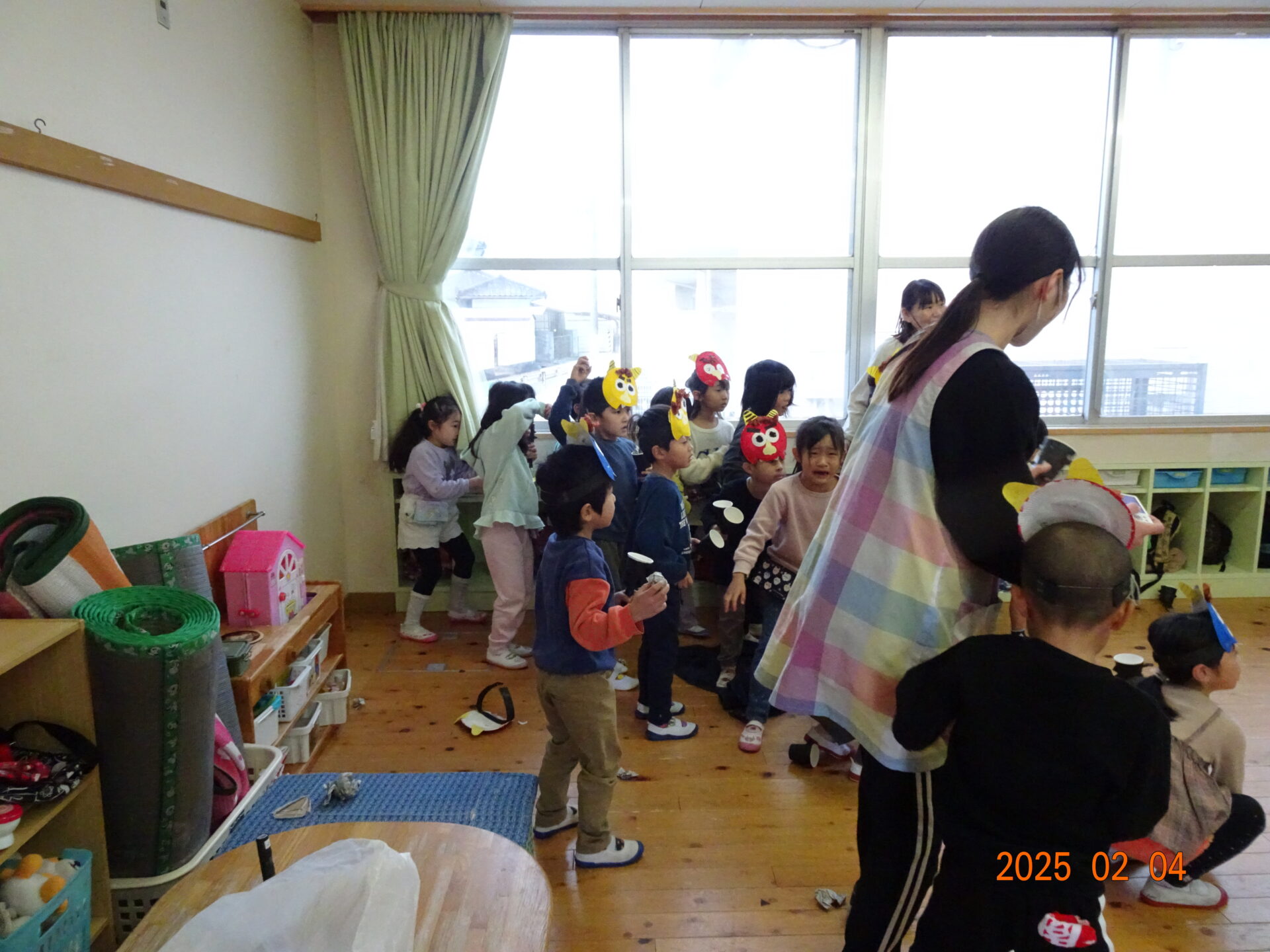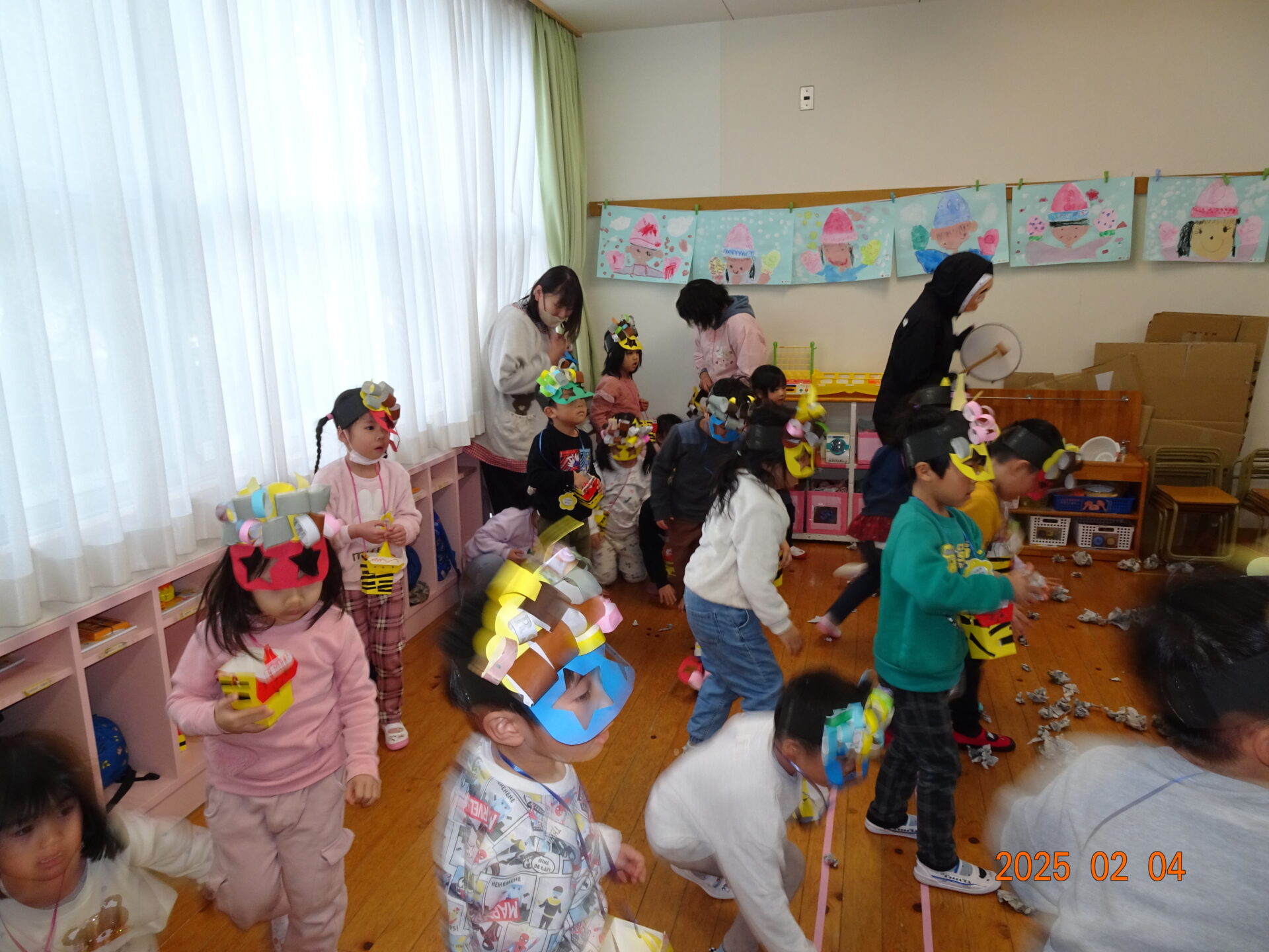 その後は、節分についてのお話を聞きました。節分のいわれや、鬼の嫌いな物、どうして豆まきをするのかのお話を聞きました。