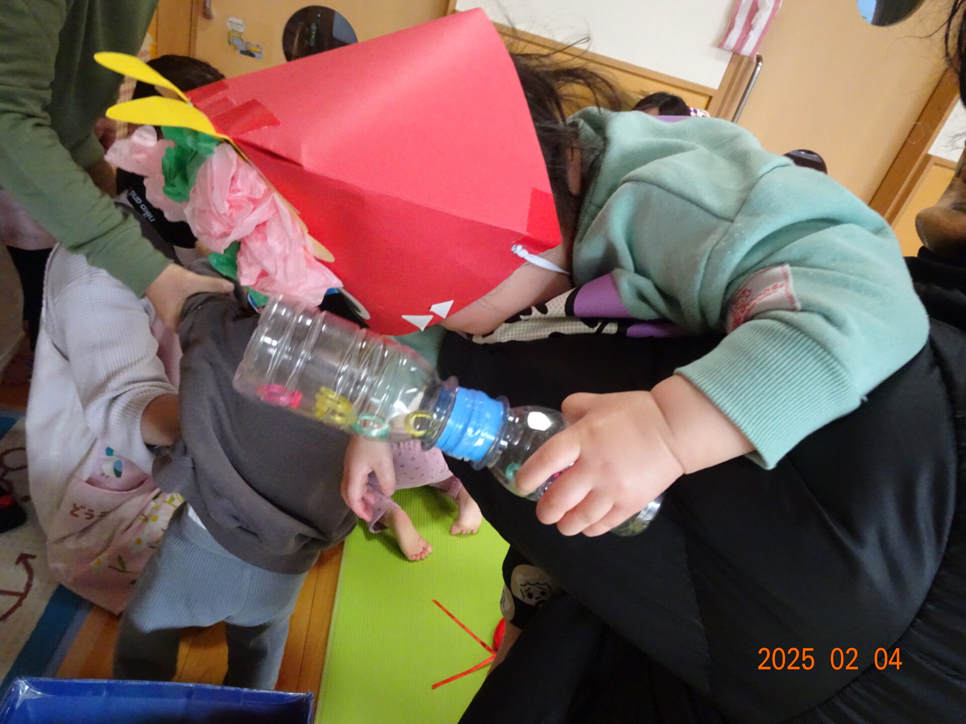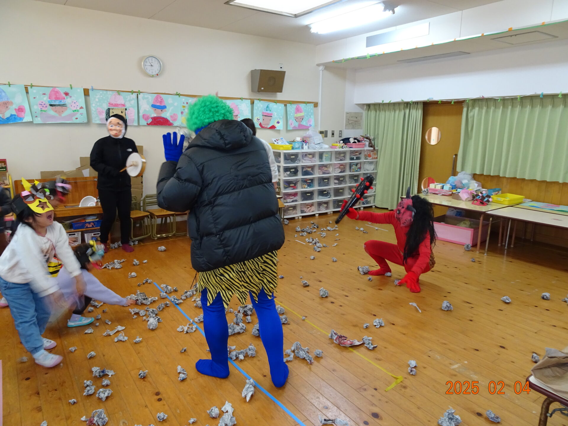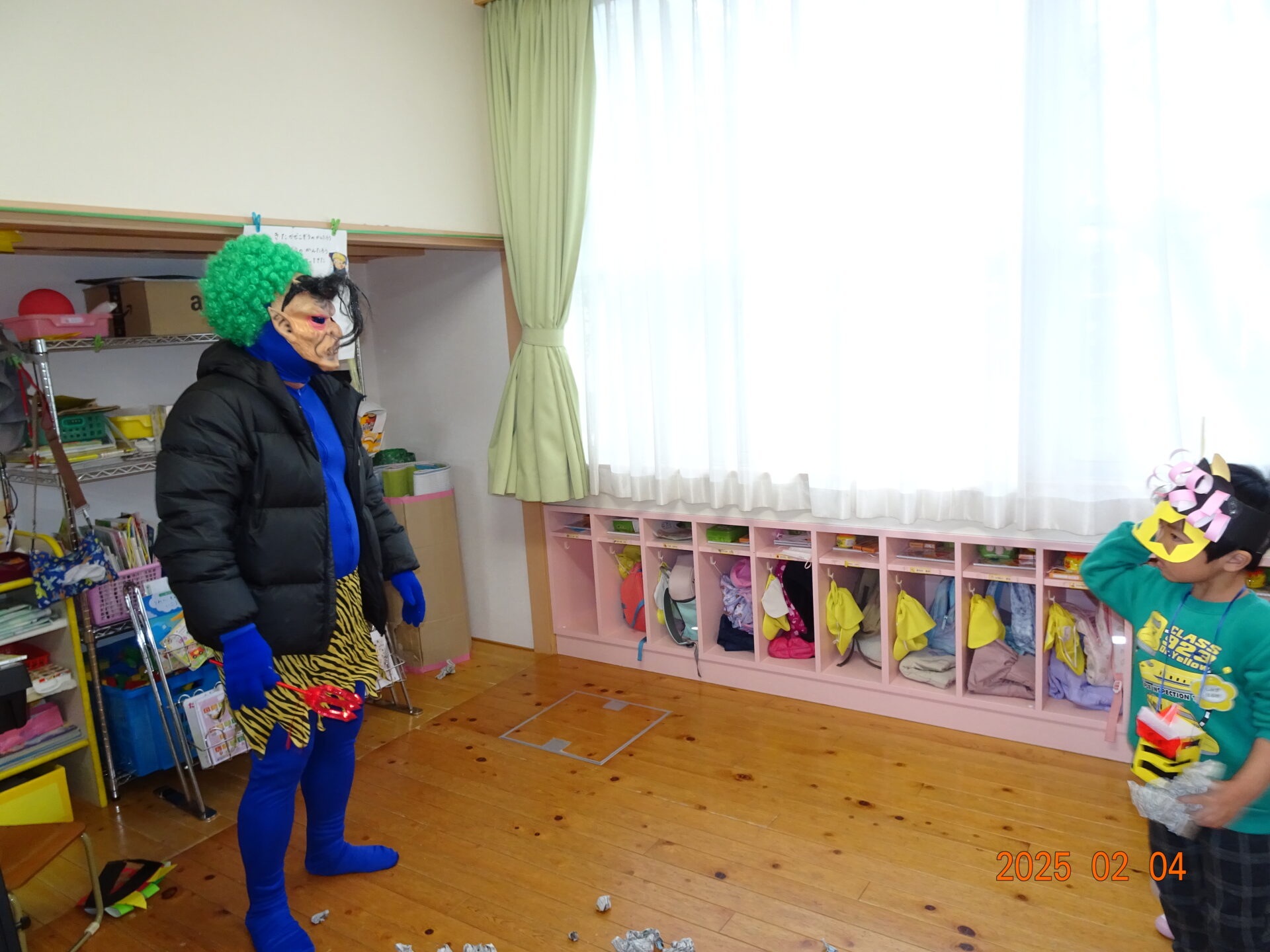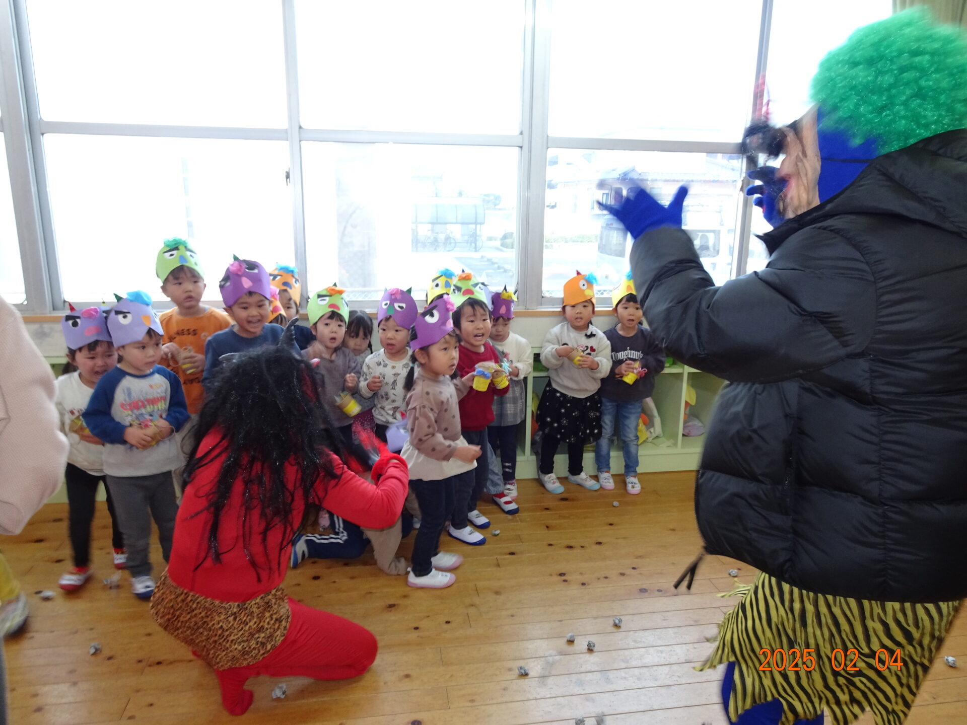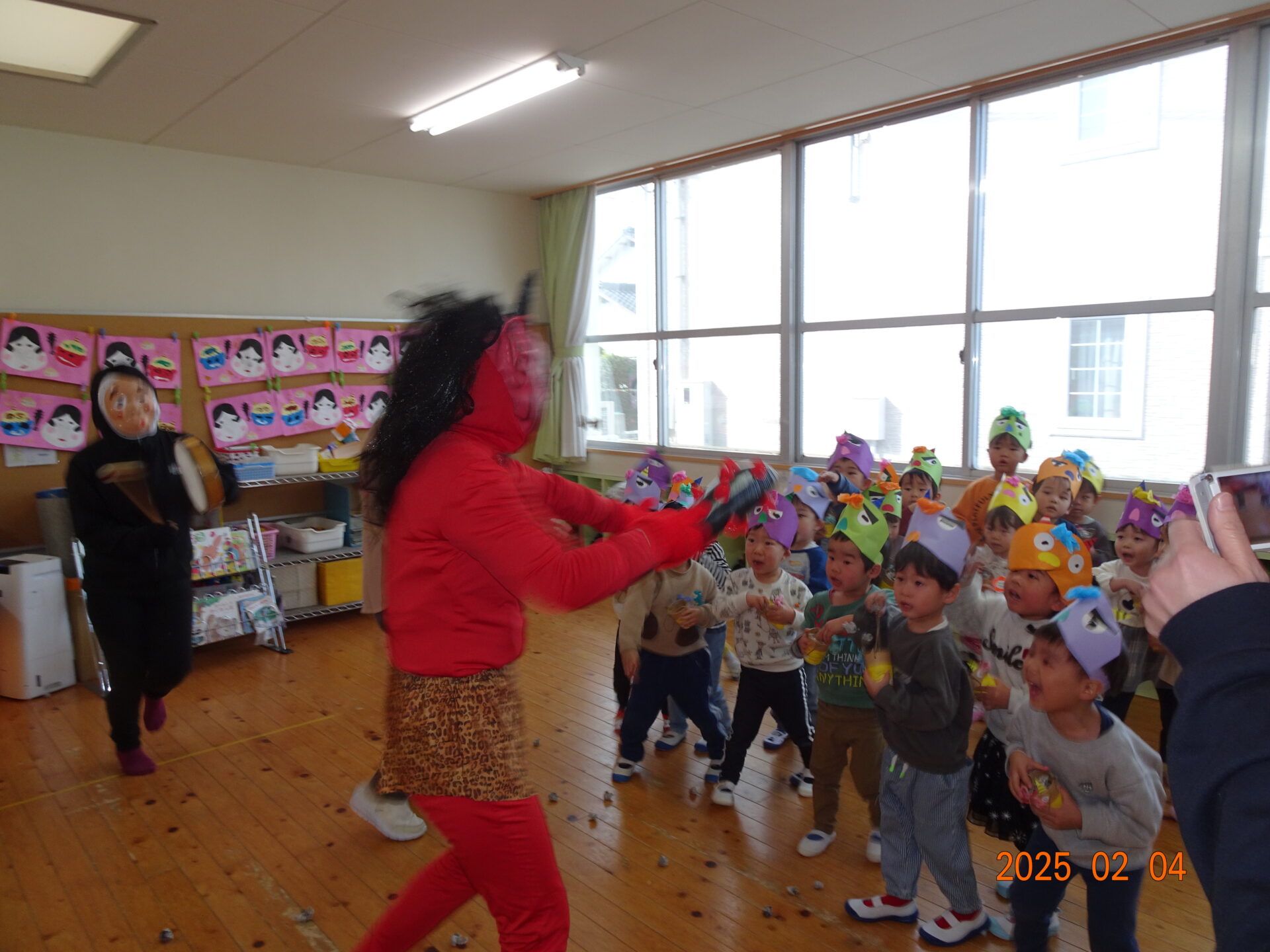 無事にお誕生会&節分集会が終わって、ホット一息ついたころ・・・保育園に不法侵入者が訪れました。ひょっとこさんが軽快な音楽に合わせて、やって来ただけかと思ったら、大間違いでした💦