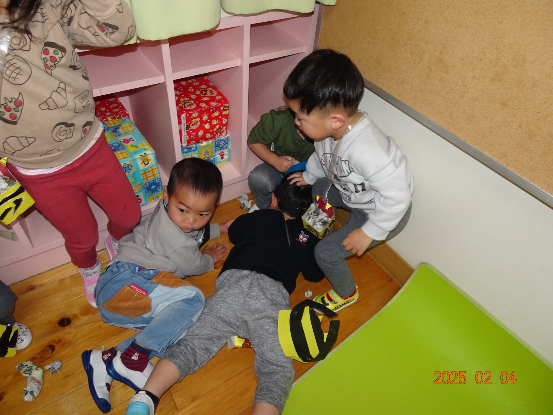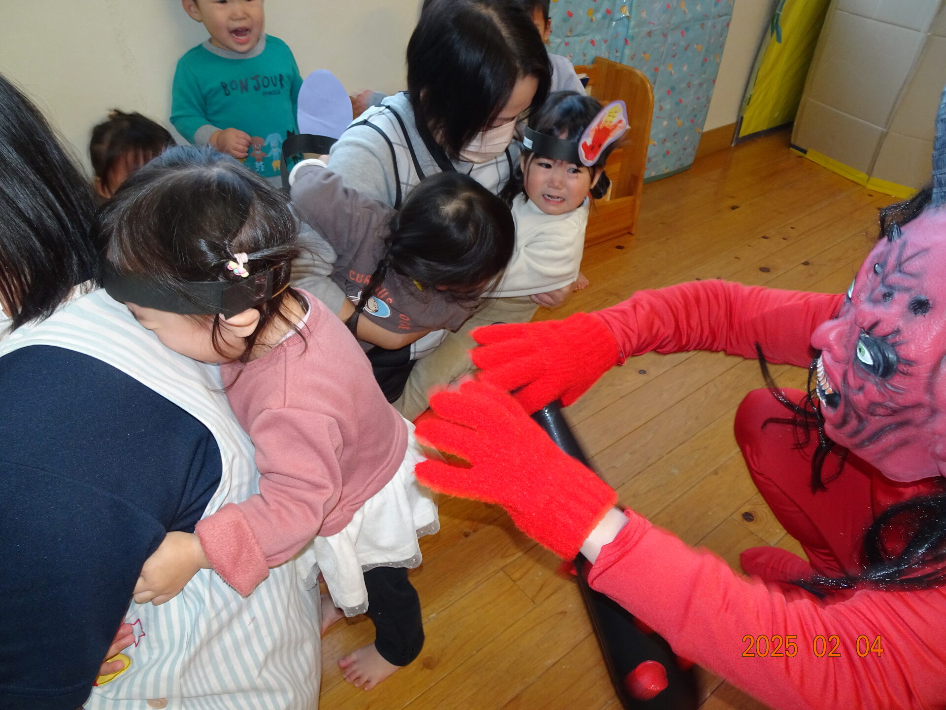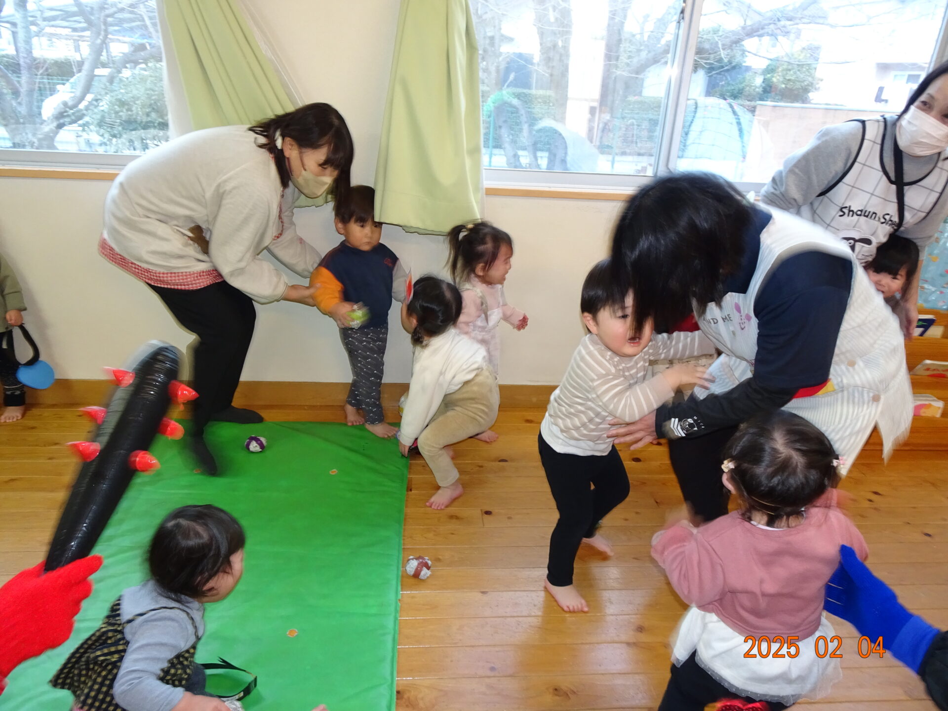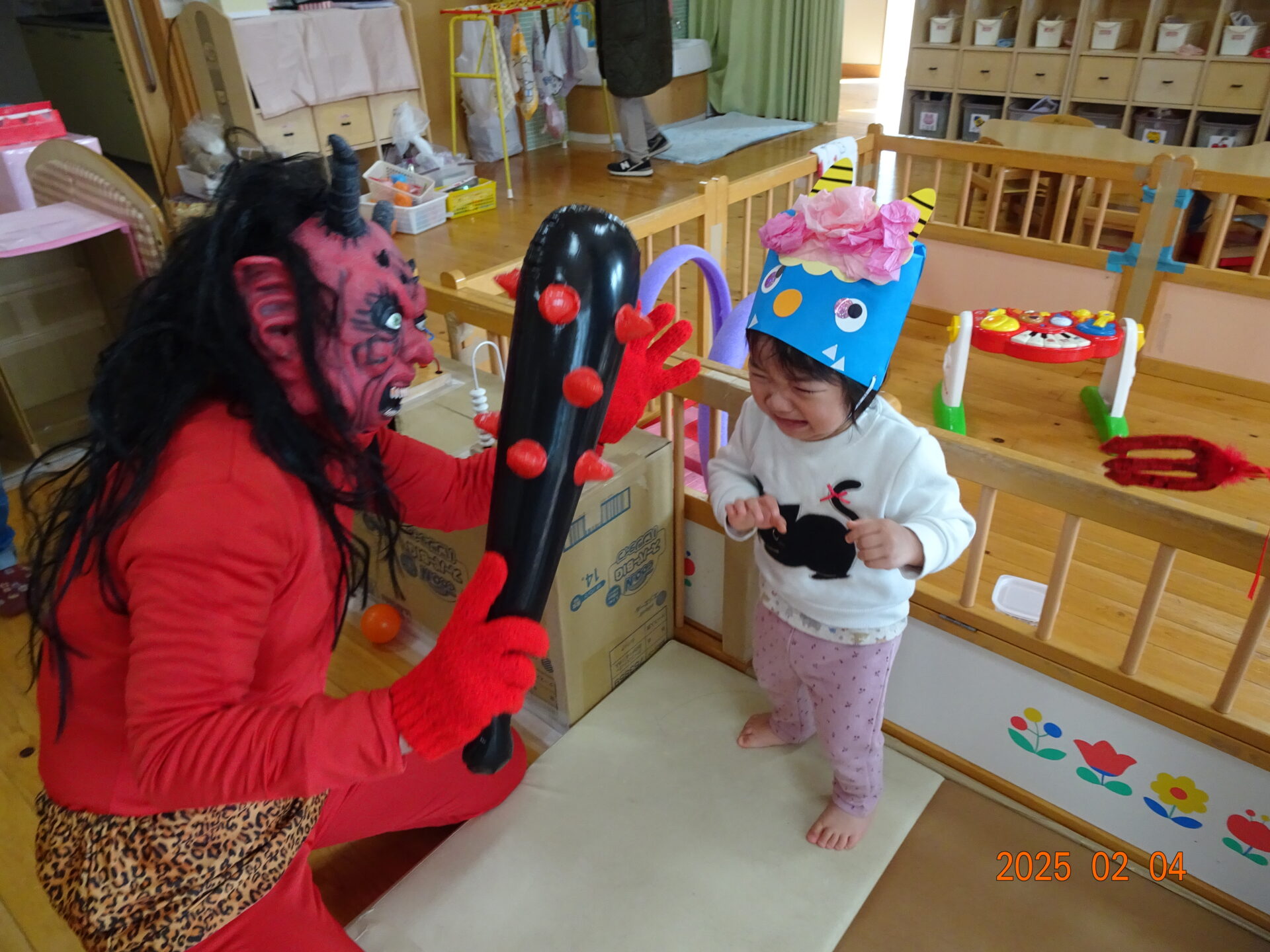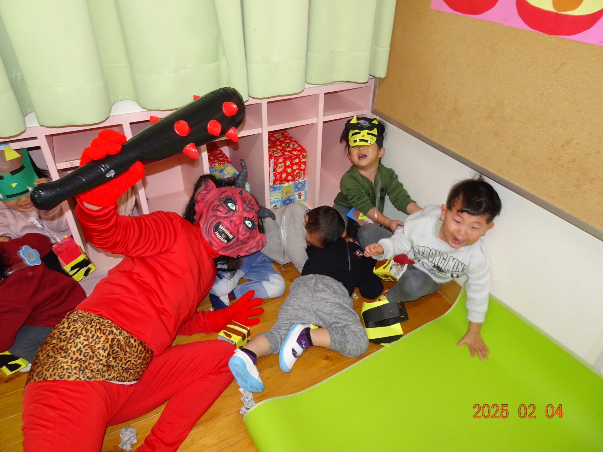 無事にお誕生会&節分集会が終わって、ホット一息ついたころ・・・保育園に不法侵入者が訪れました。ひょっとこさんが軽快な音楽に合わせて、やって来ただけかと思ったら、大間違いでした💦