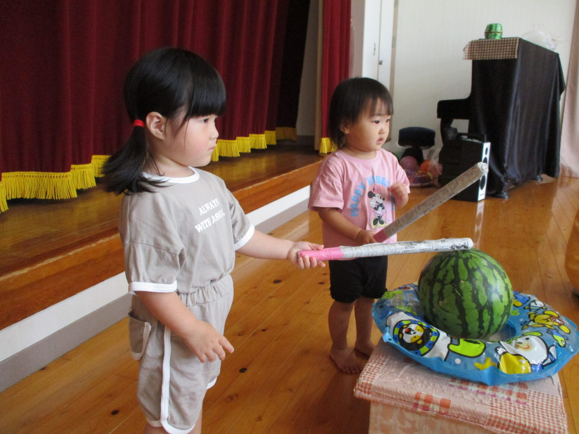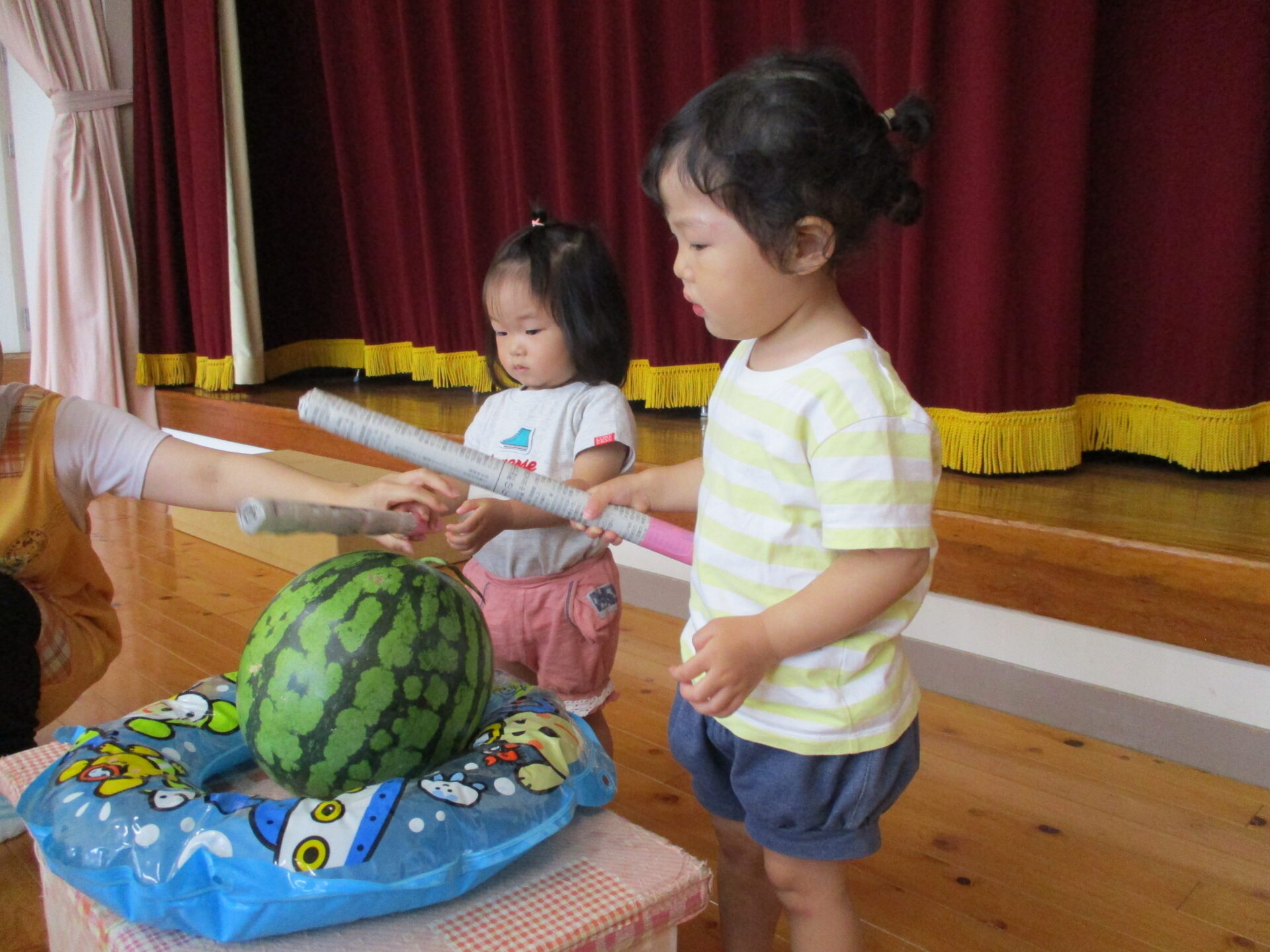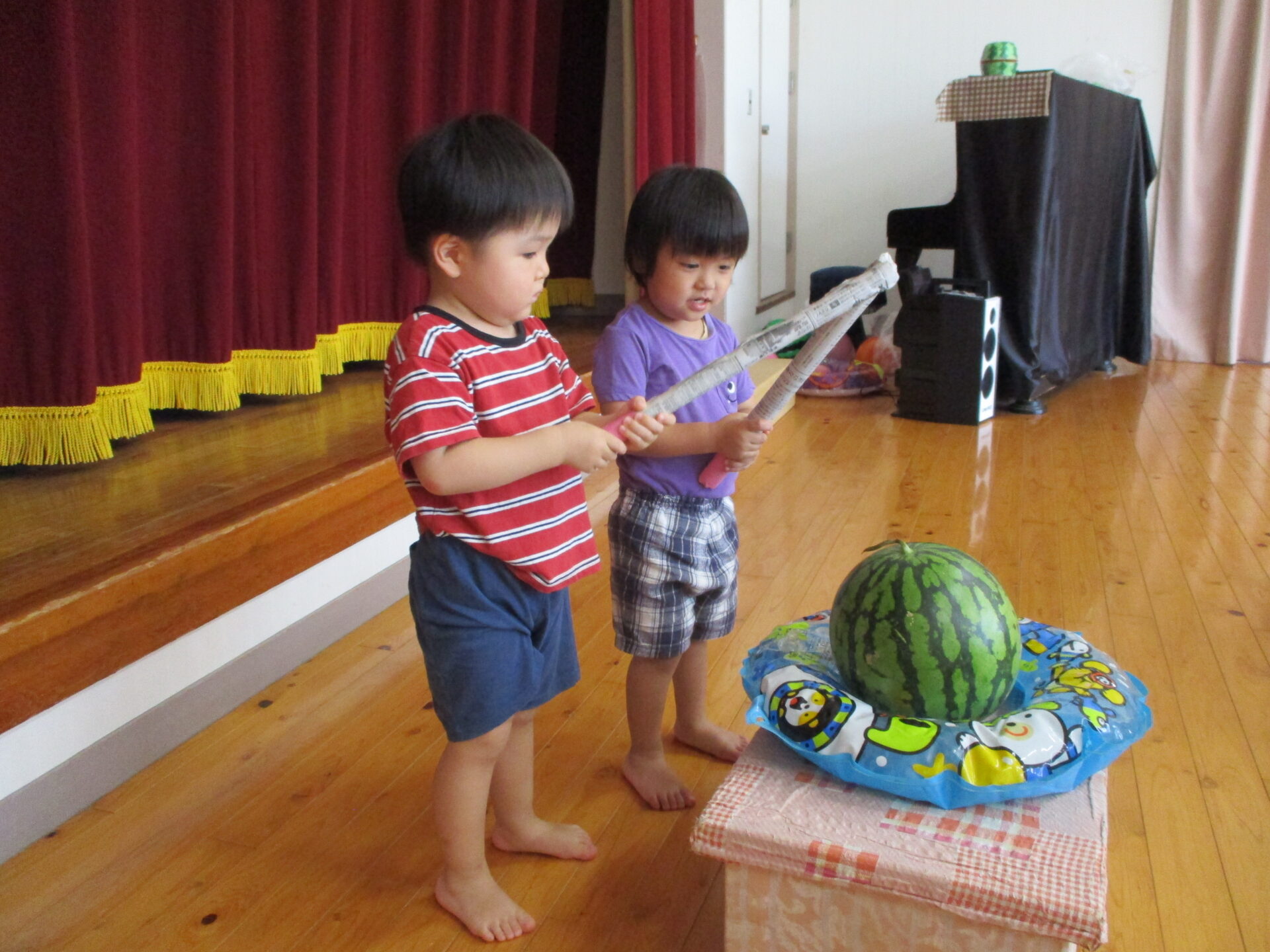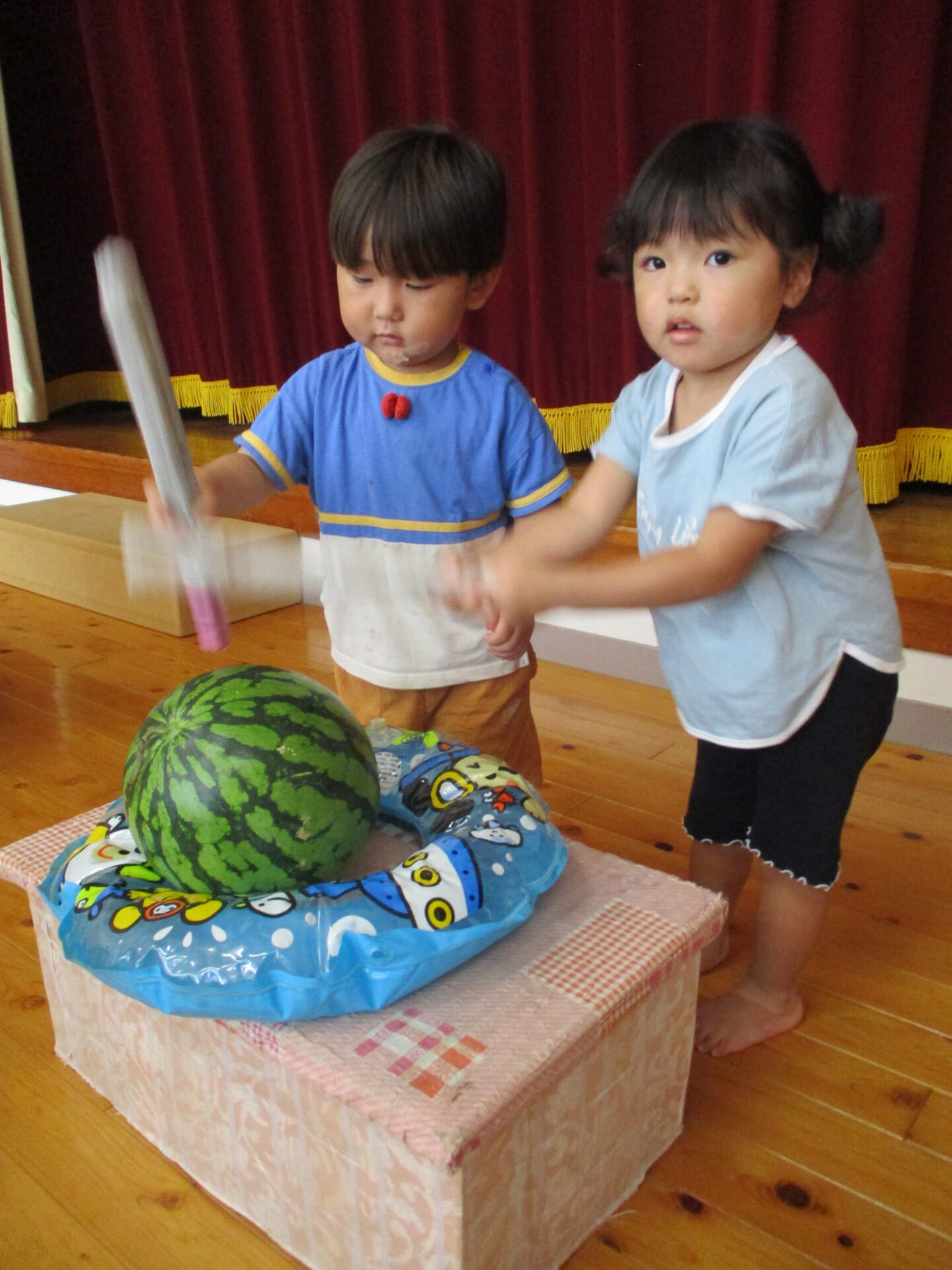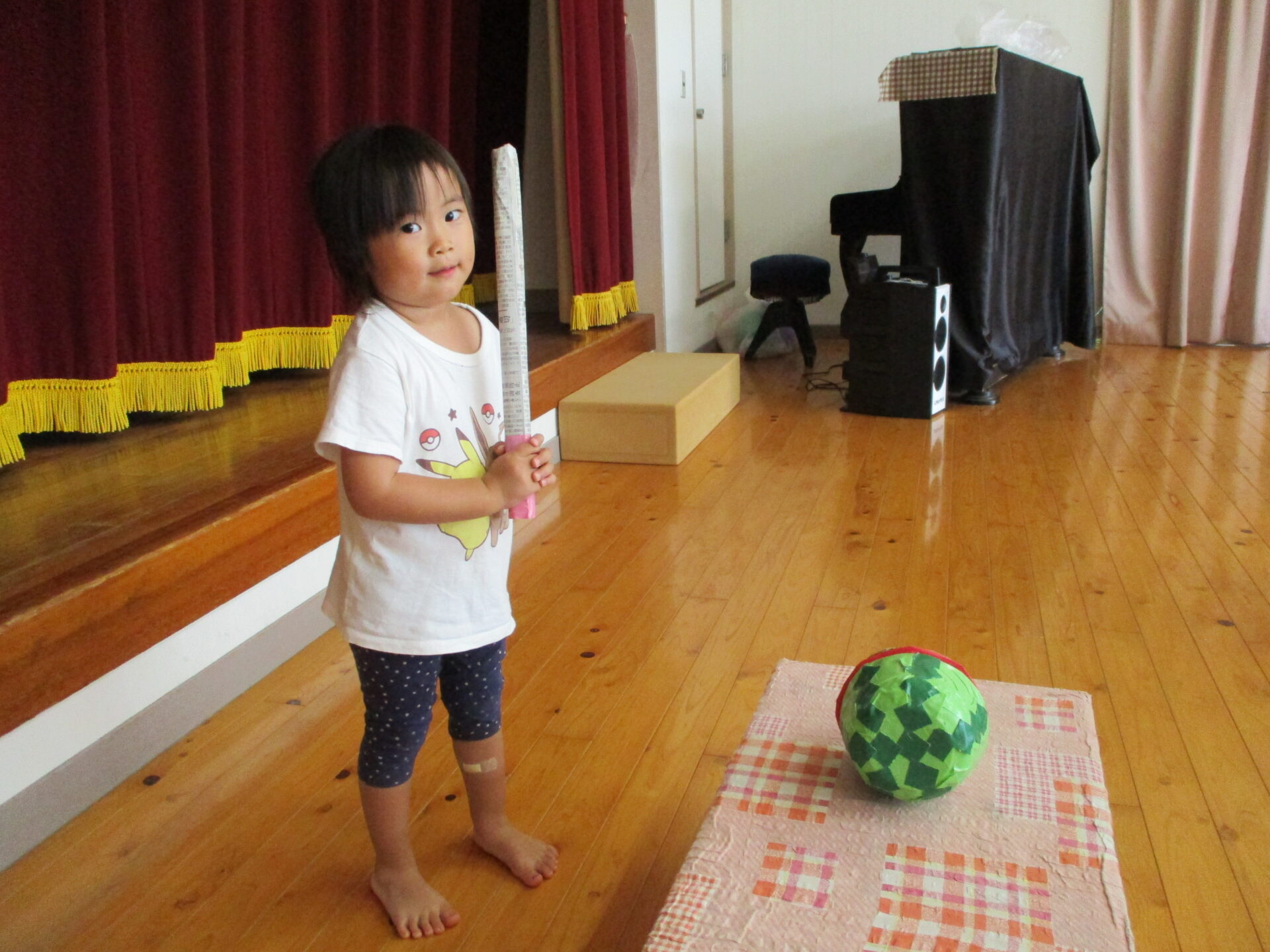 先日のお誕生日会で、『すいか割り』の様子をみた、あめチーム(2歳児)さんとだいちチーム(1歳児)さんが、どうやら、すいか割りの魅力にとりつかれたようで、すいか割りをしていました。最初は、手作りのすいかでした。