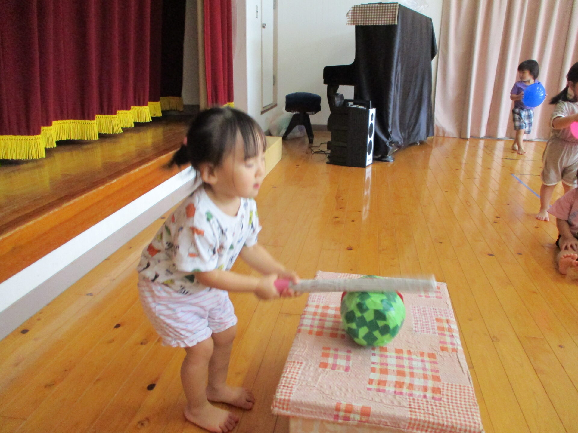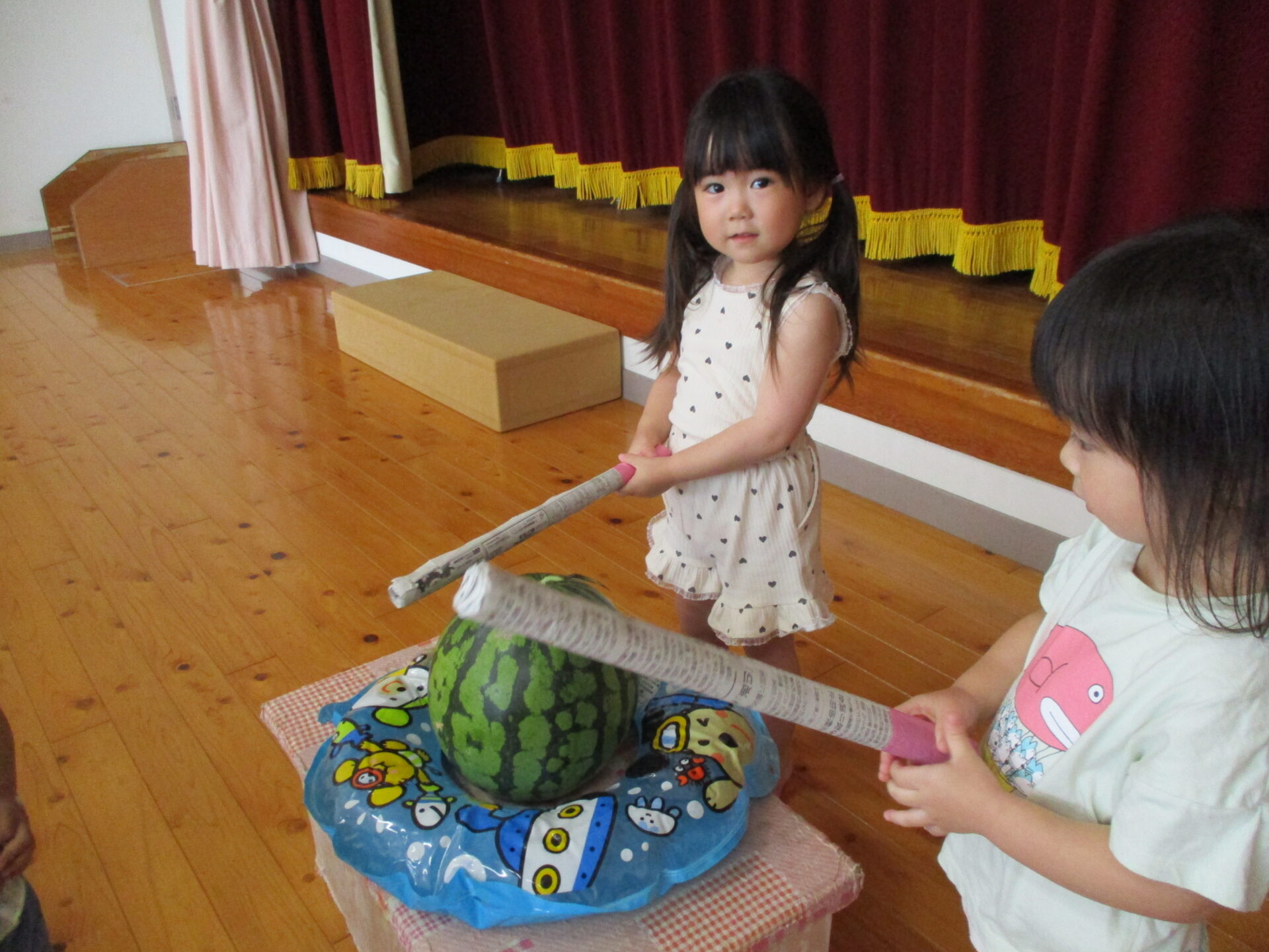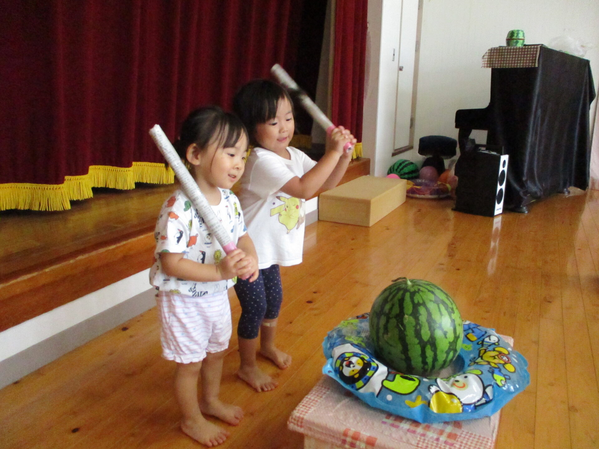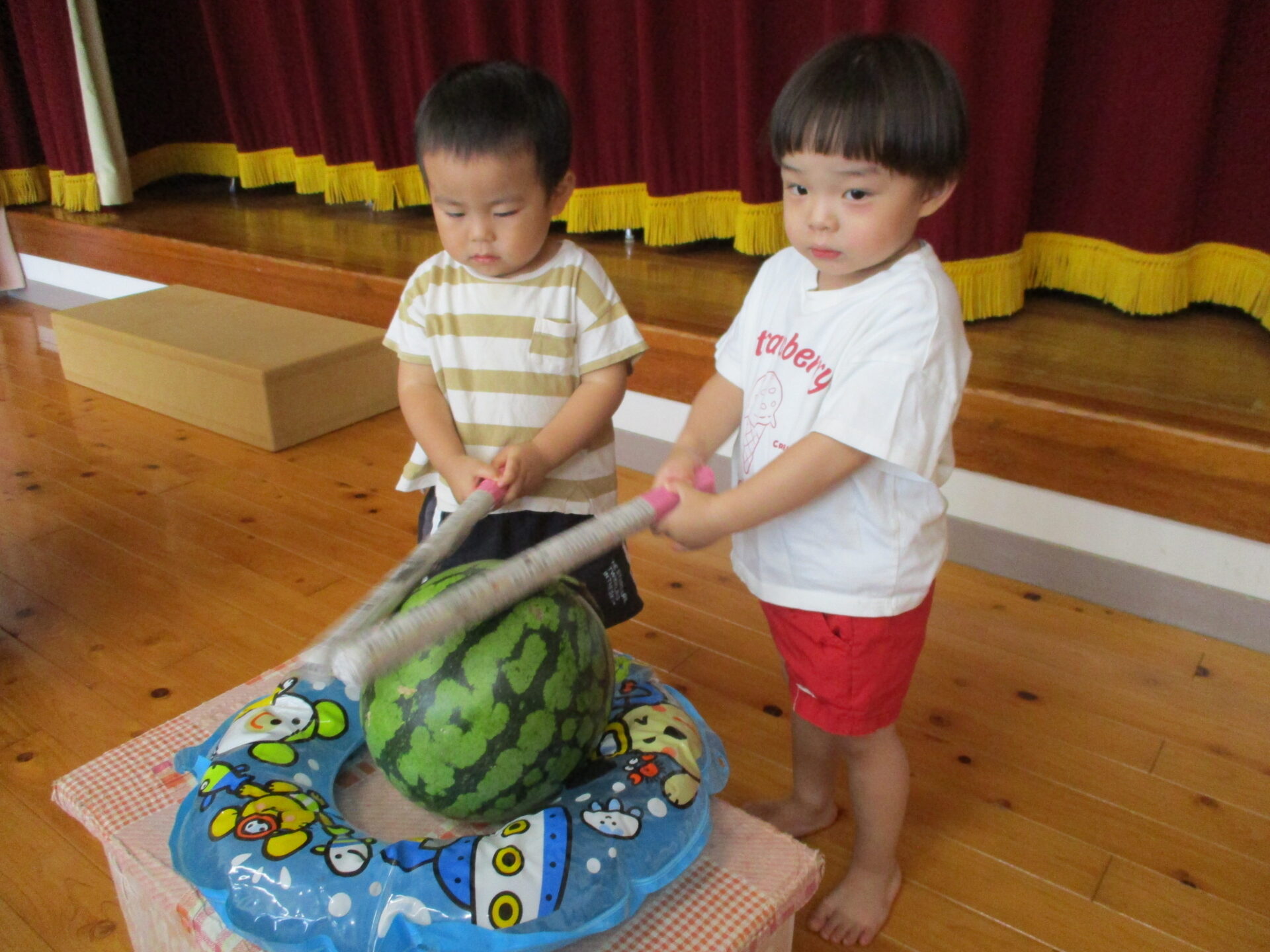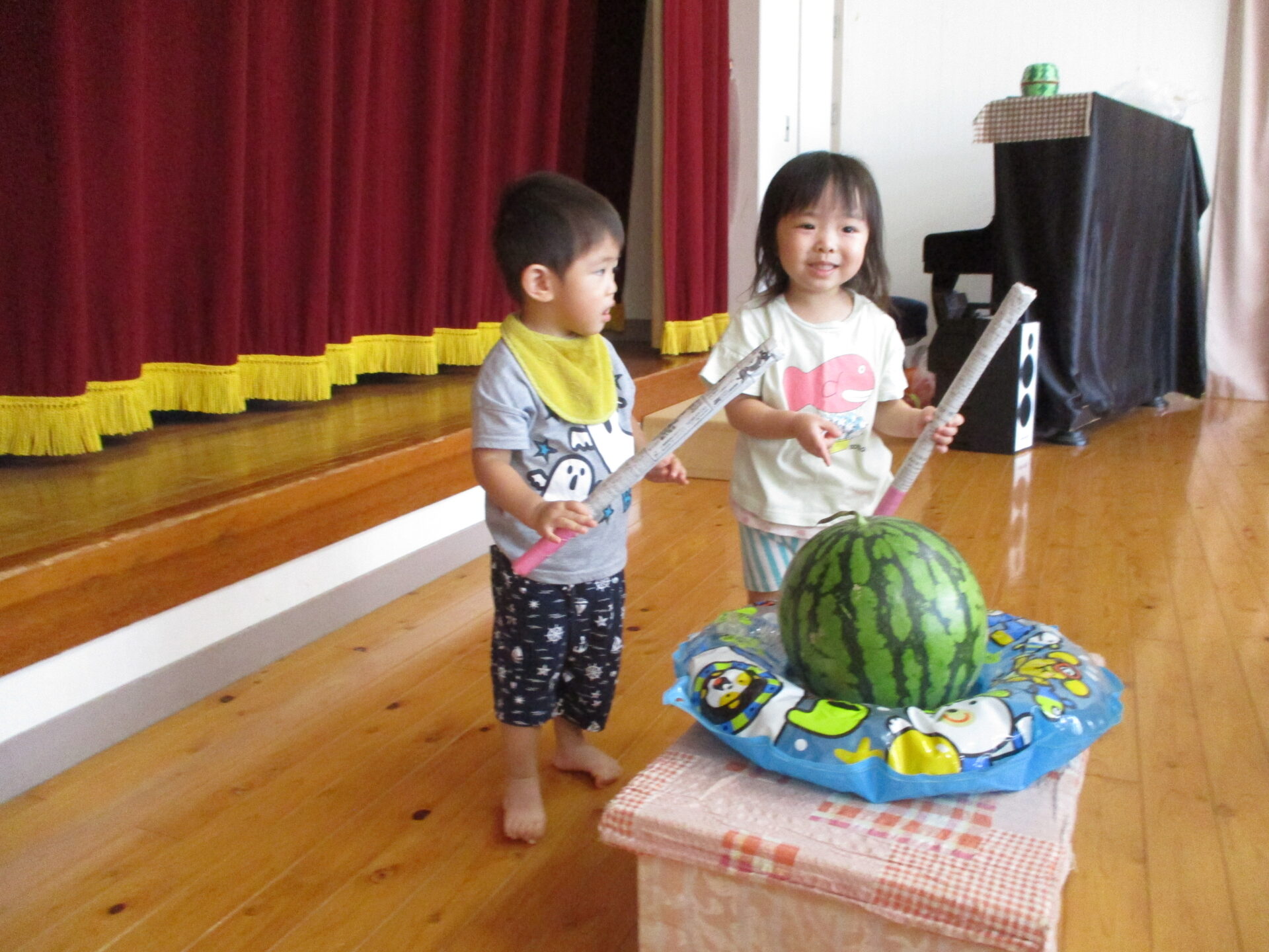 先日のお誕生日会で、『すいか割り』の様子をみた、あめチーム(2歳児)さんとだいちチーム(1歳児)さんが、どうやら、すいか割りの魅力にとりつかれたようで、すいか割りをしていました。最初は、手作りのすいかでした。