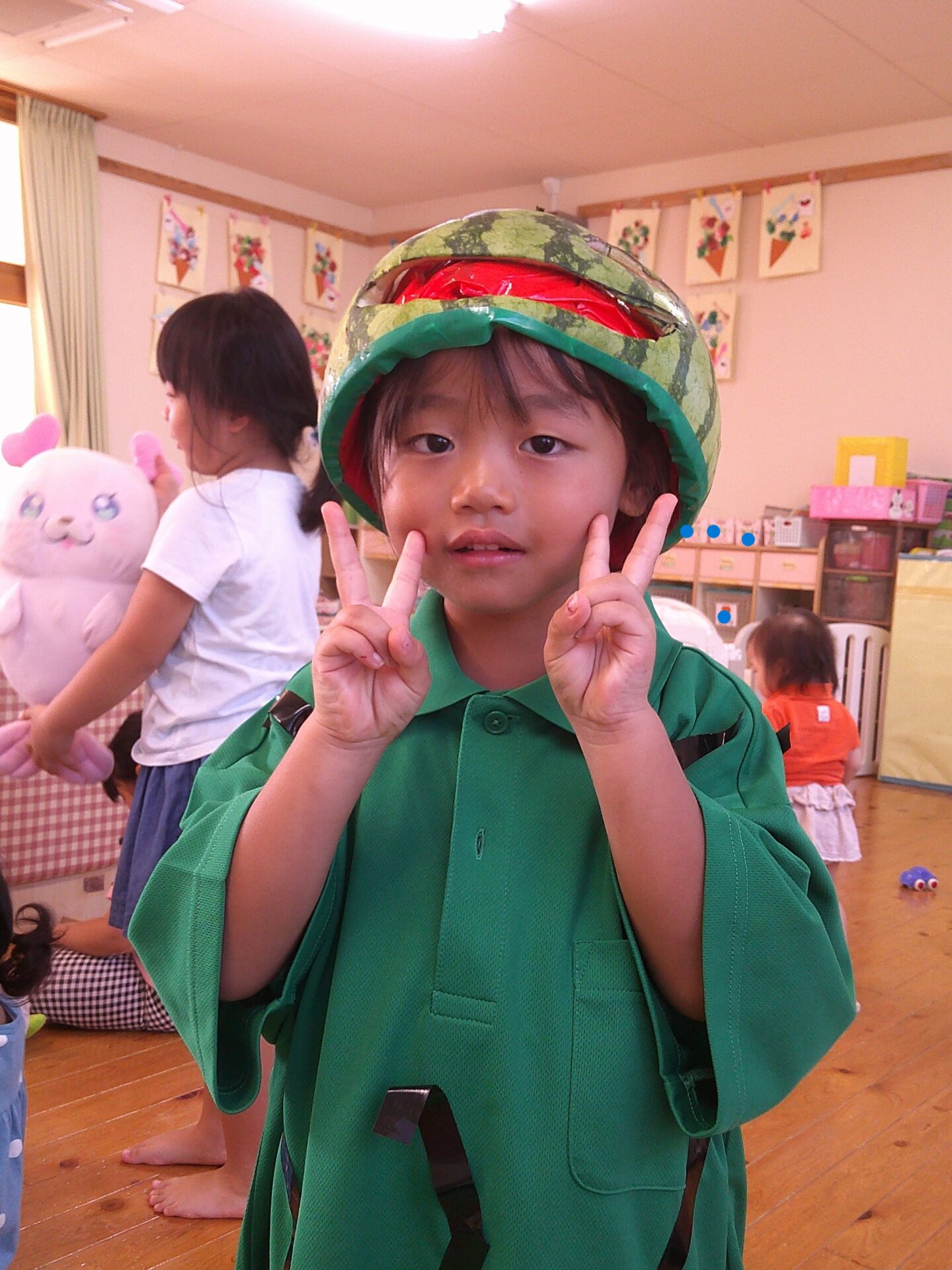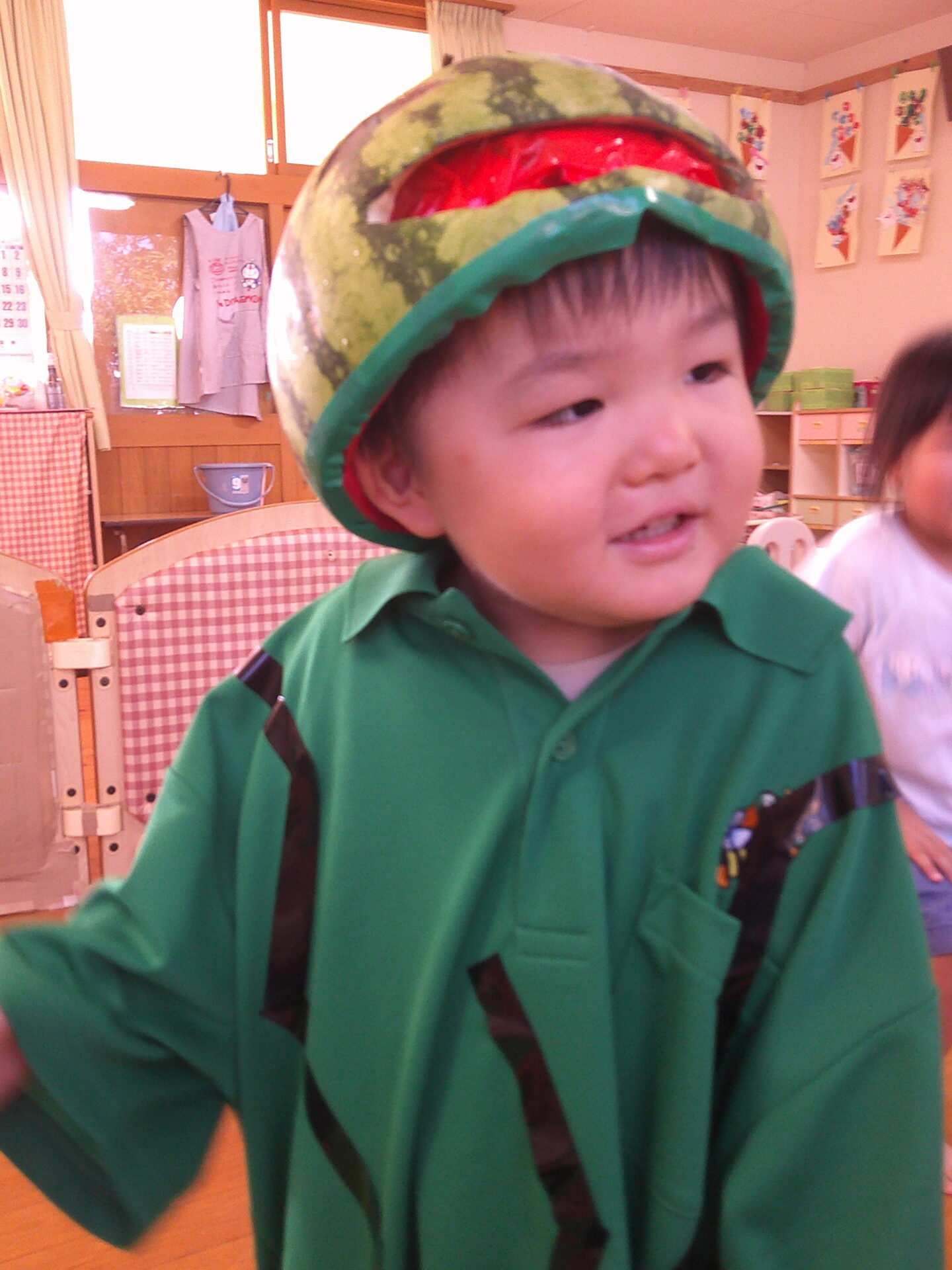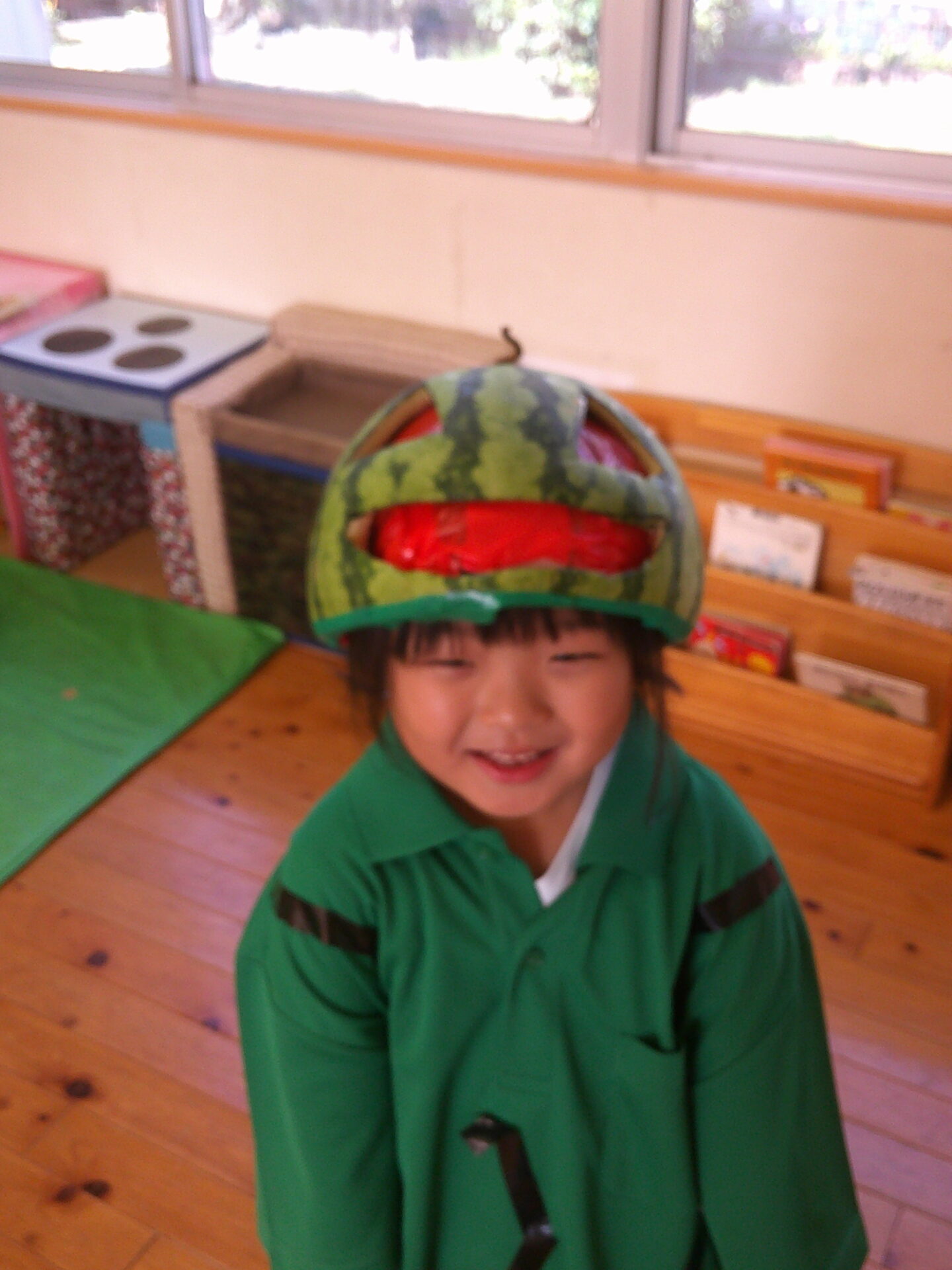 お誕生会、1.2歳児のすいか割りに引き続き、本日もすいかネタです。スイカをくりぬき、顔にしました。驚いたお友だちもいましたが、『かぶる~』と言ったお友だちも何人かいました。子どもにとっては、少し、重いようでしたが、しっかりと変身できていました😀