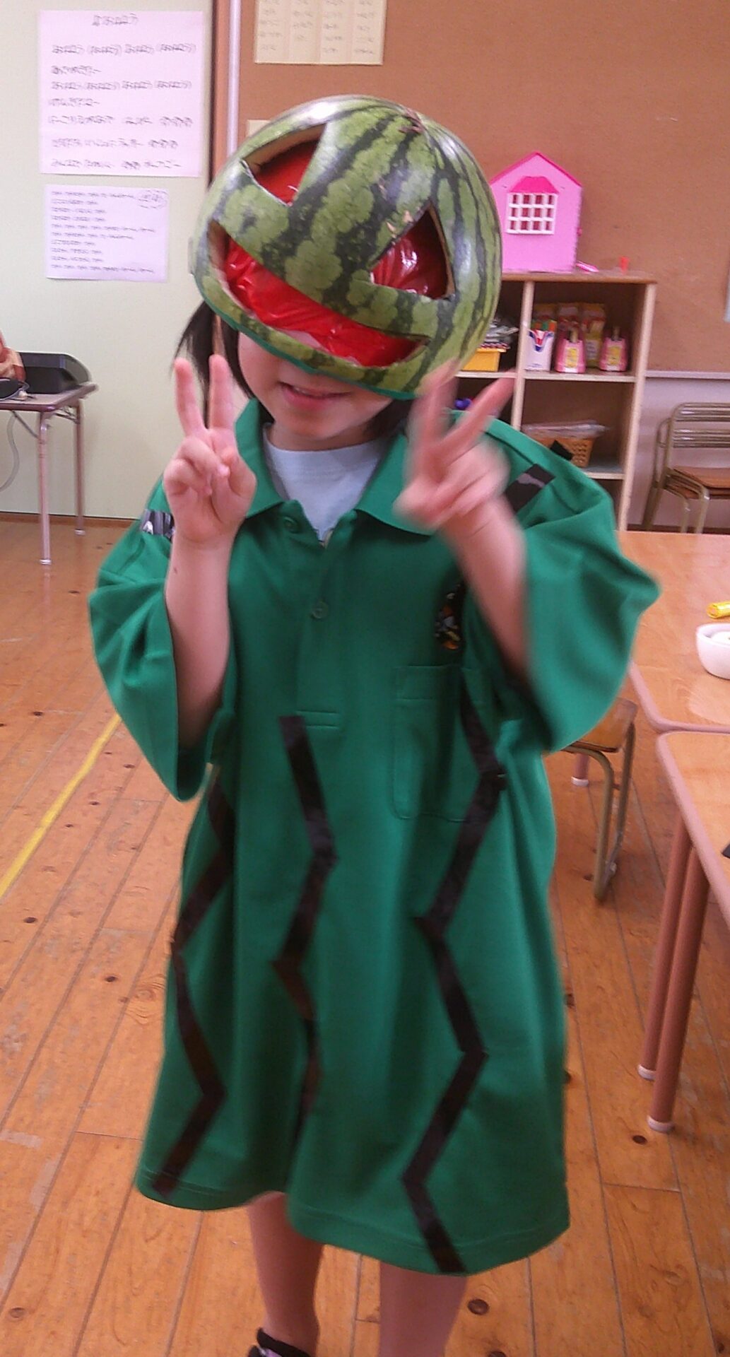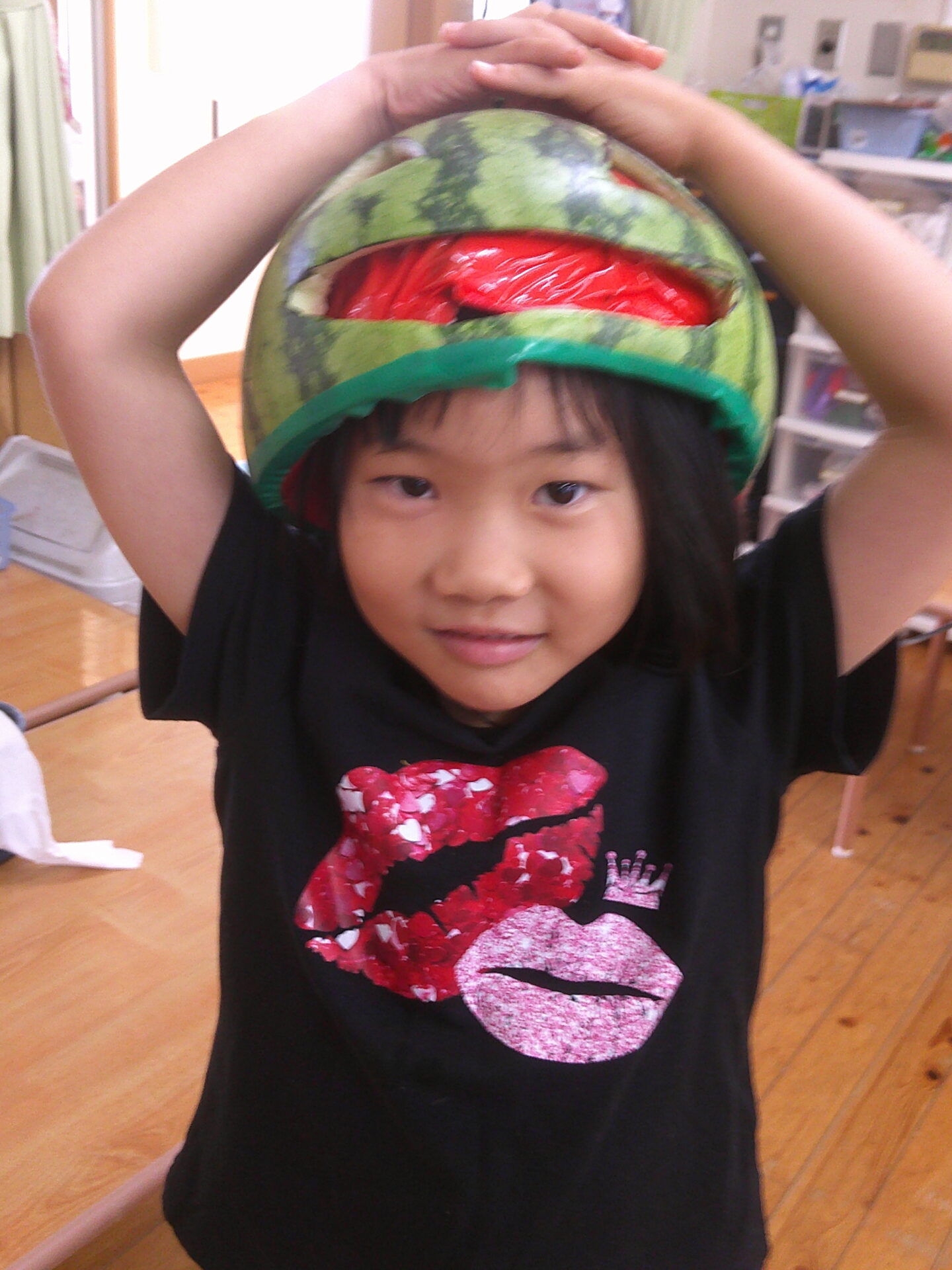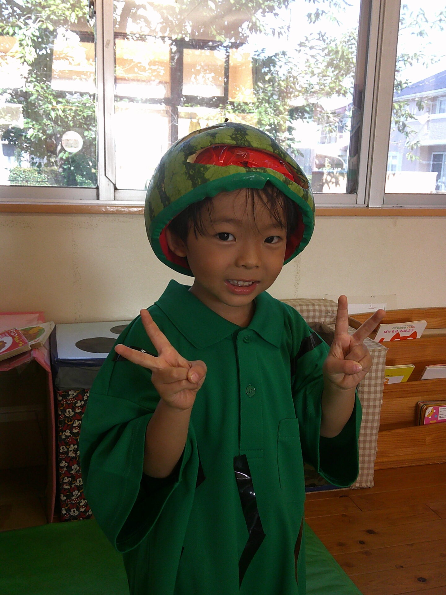 お誕生会、1.2歳児のすいか割りに引き続き、本日もすいかネタです。スイカをくりぬき、顔にしました。驚いたお友だちもいましたが、『かぶる~』と言ったお友だちも何人かいました。子どもにとっては、少し、重いようでしたが、しっかりと変身できていました😀