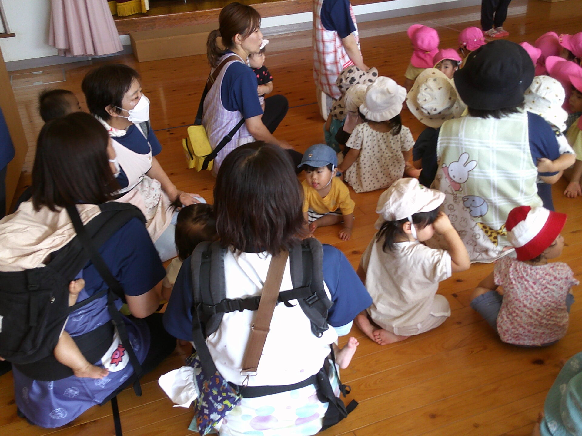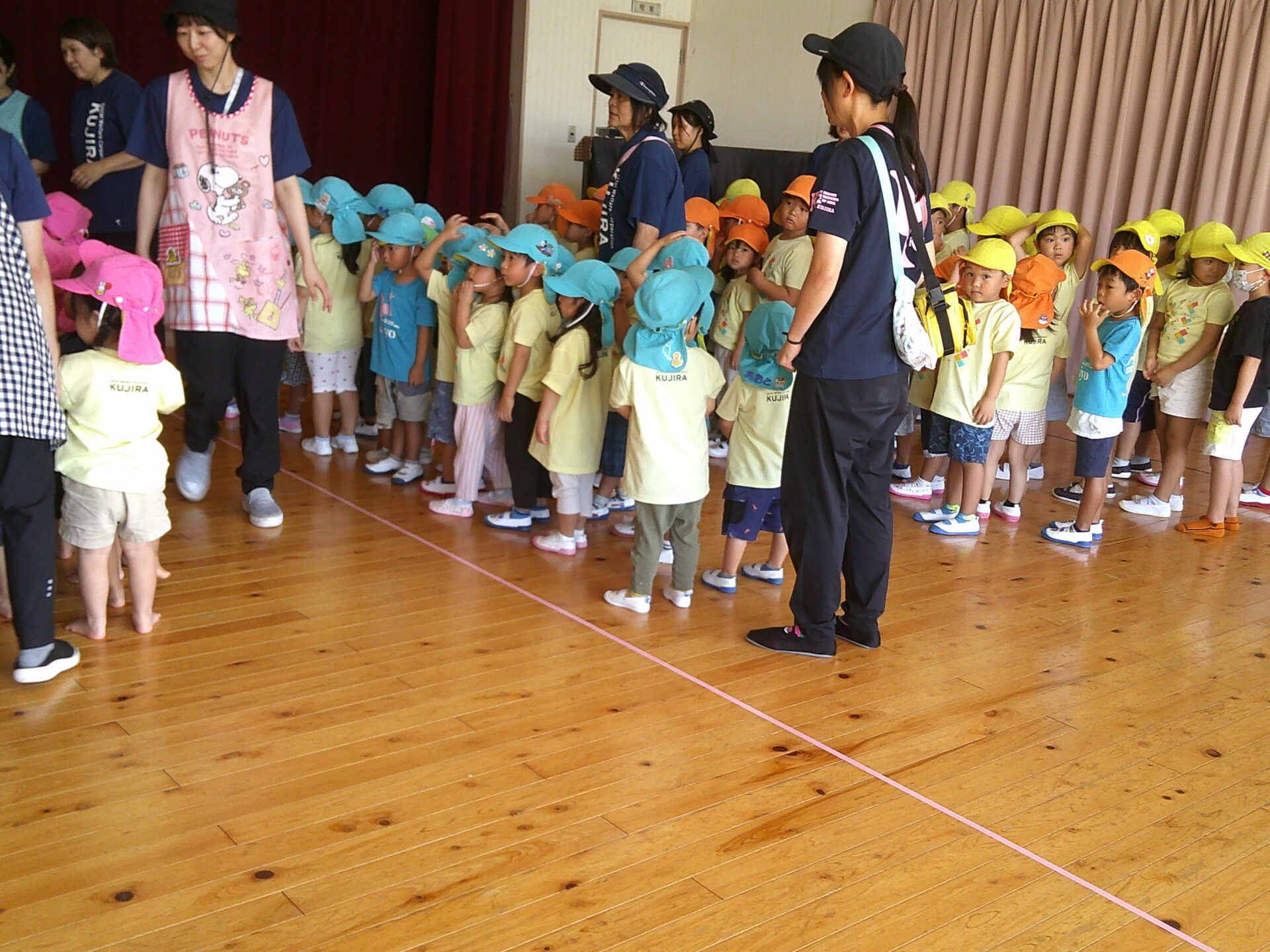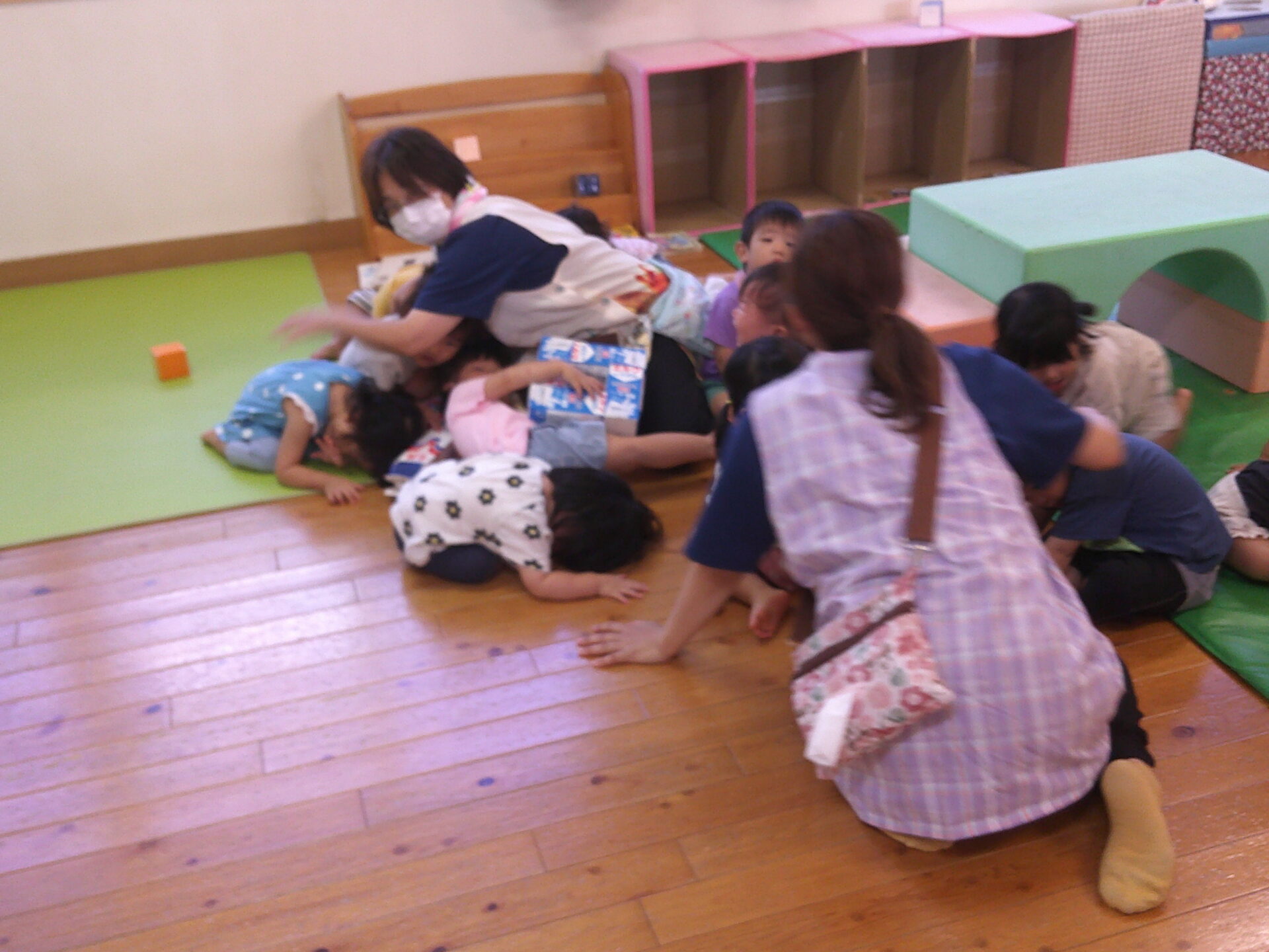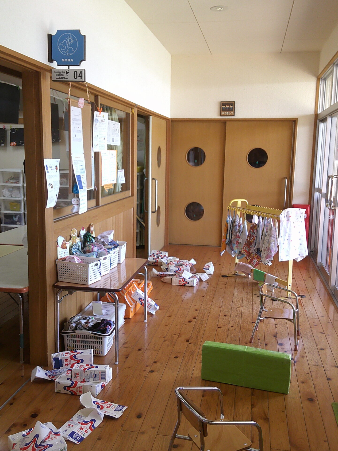 「ダンゴムシのポーズです。」「動かないでください」と言う放送をよく聞いて、みんな自分の命を守るためにしっかりと避難出来ていました。少しして、揺れが収まり、ホールへの避難指示が出ました。しかし、地震の影響で、廊下はスムーズに歩けそうにありませんでした。足元にガラス片等が落ちていてもいけないので、慎重に歩いていました。うみチーム(0歳児)さんと、だいちチーム(1歳児)さんは避難車でホールに向かいました。