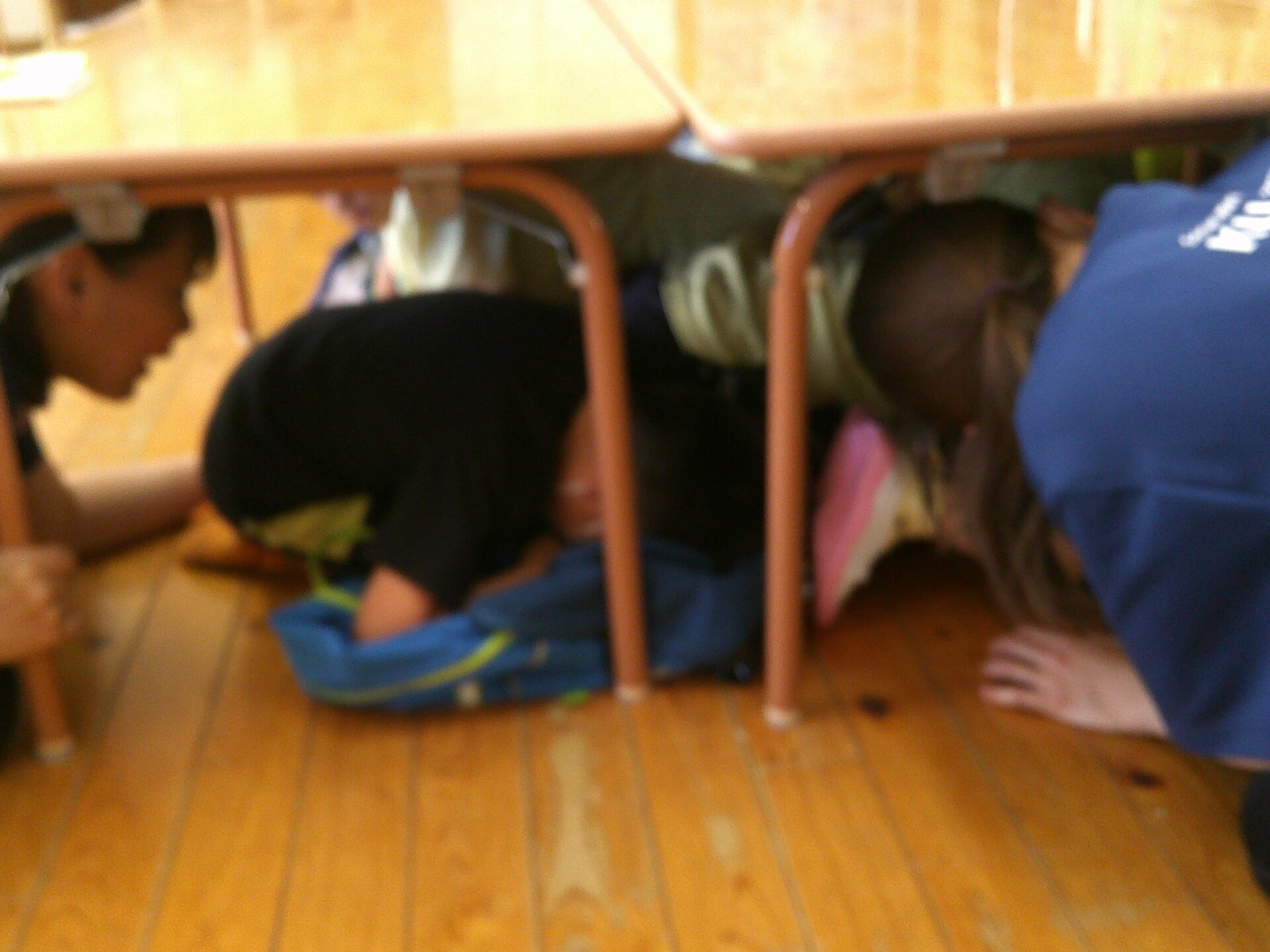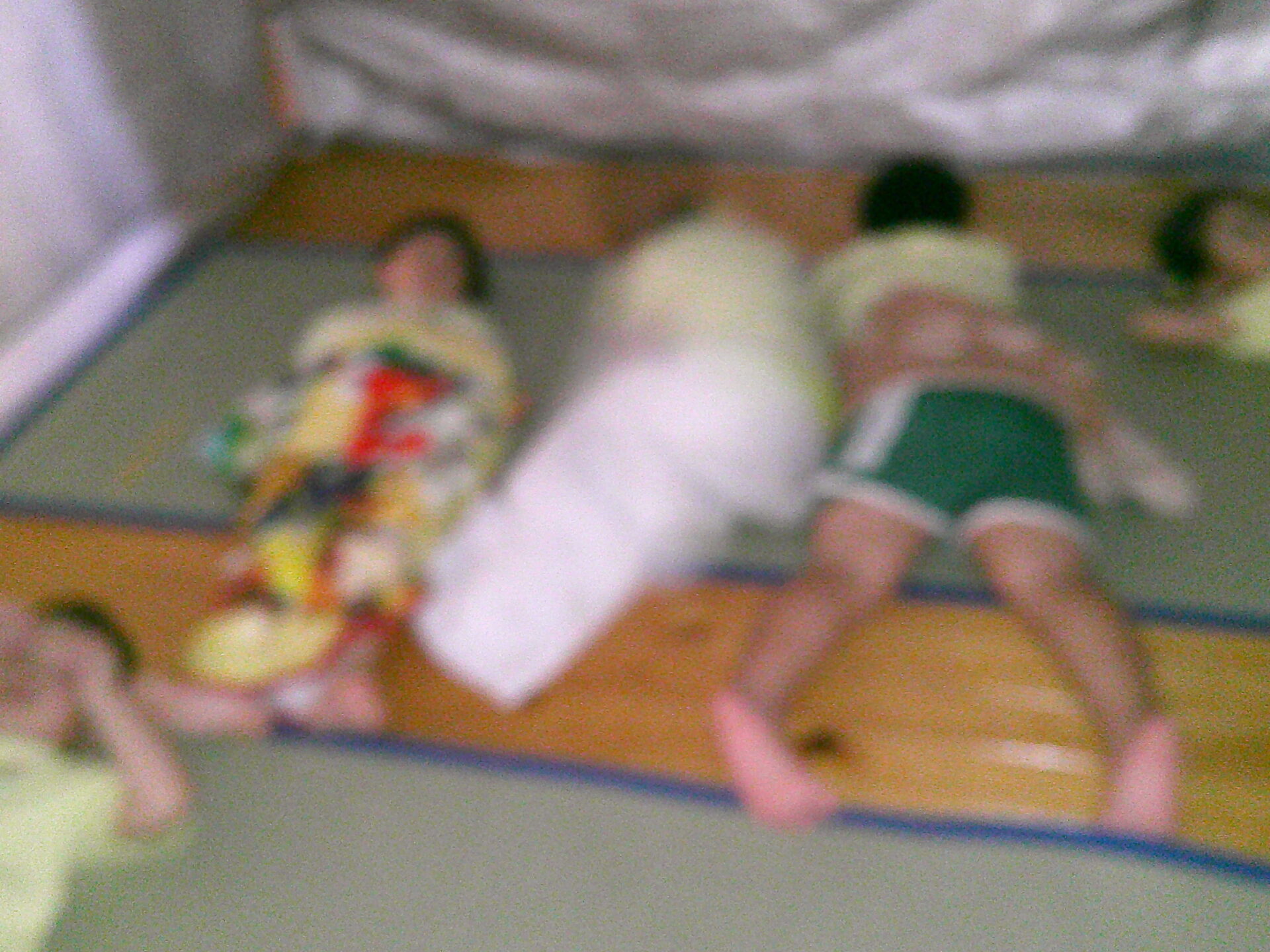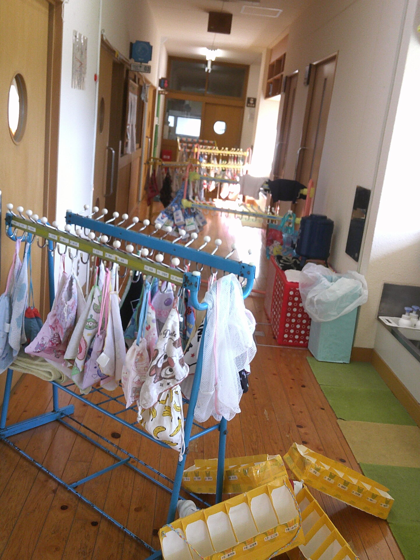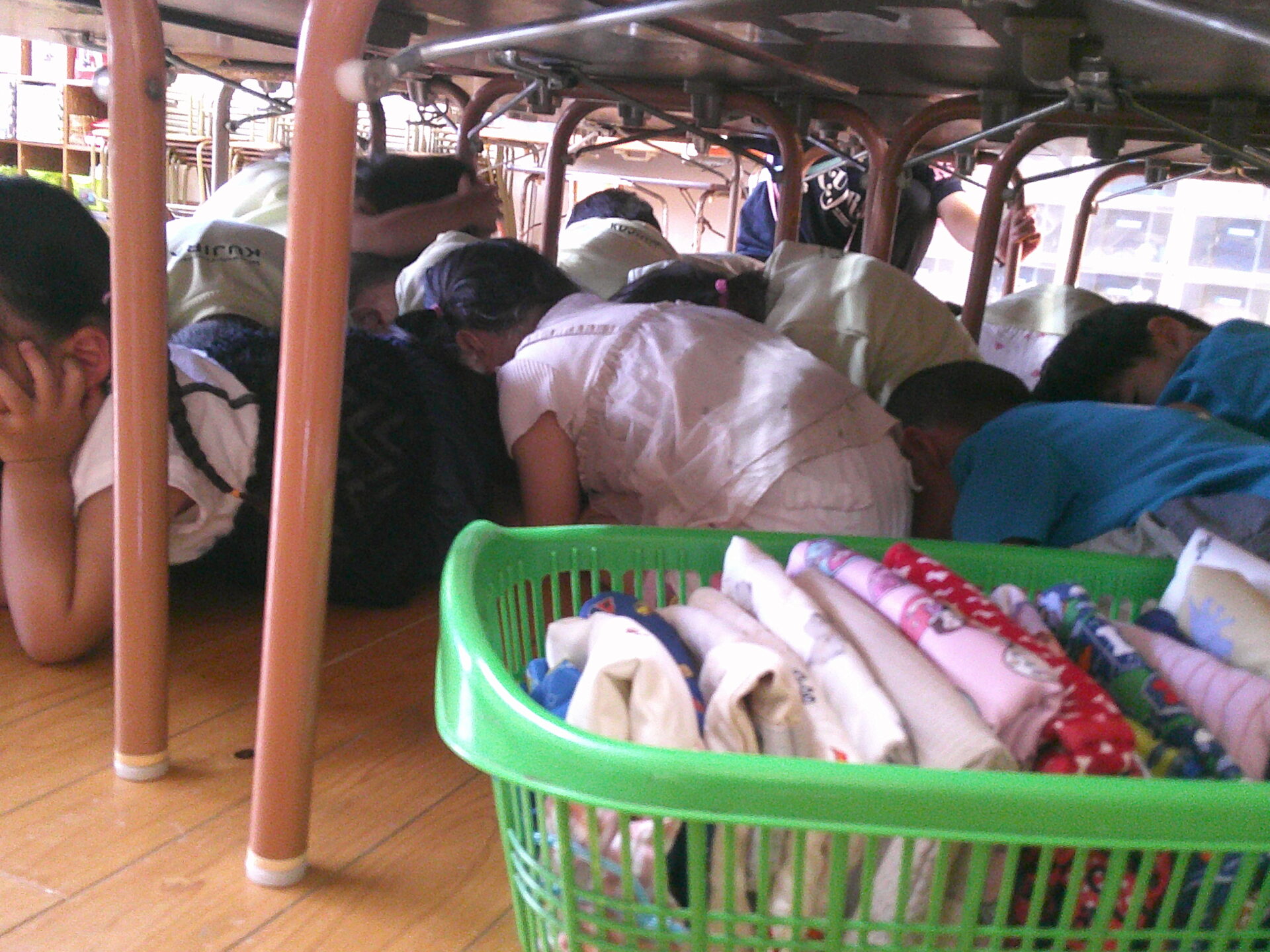 「ダンゴムシのポーズです。」「動かないでください」と言う放送をよく聞いて、みんな自分の命を守るためにしっかりと避難出来ていました。少しして、揺れが収まり、ホールへの避難指示が出ました。しかし、地震の影響で、廊下はスムーズに歩けそうにありませんでした。足元にガラス片等が落ちていてもいけないので、慎重に歩いていました。うみチーム(0歳児)さんと、だいちチーム(1歳児)さんは避難車でホールに向かいました。