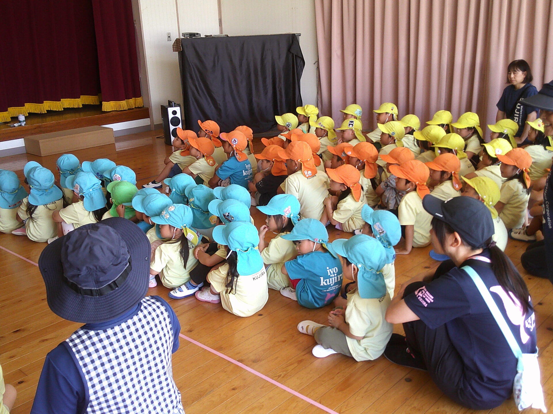 ホールでは、避難の仕方の振り返りや、「今日の給食は、非常食を食べるよ」と言うお話を聞きました。