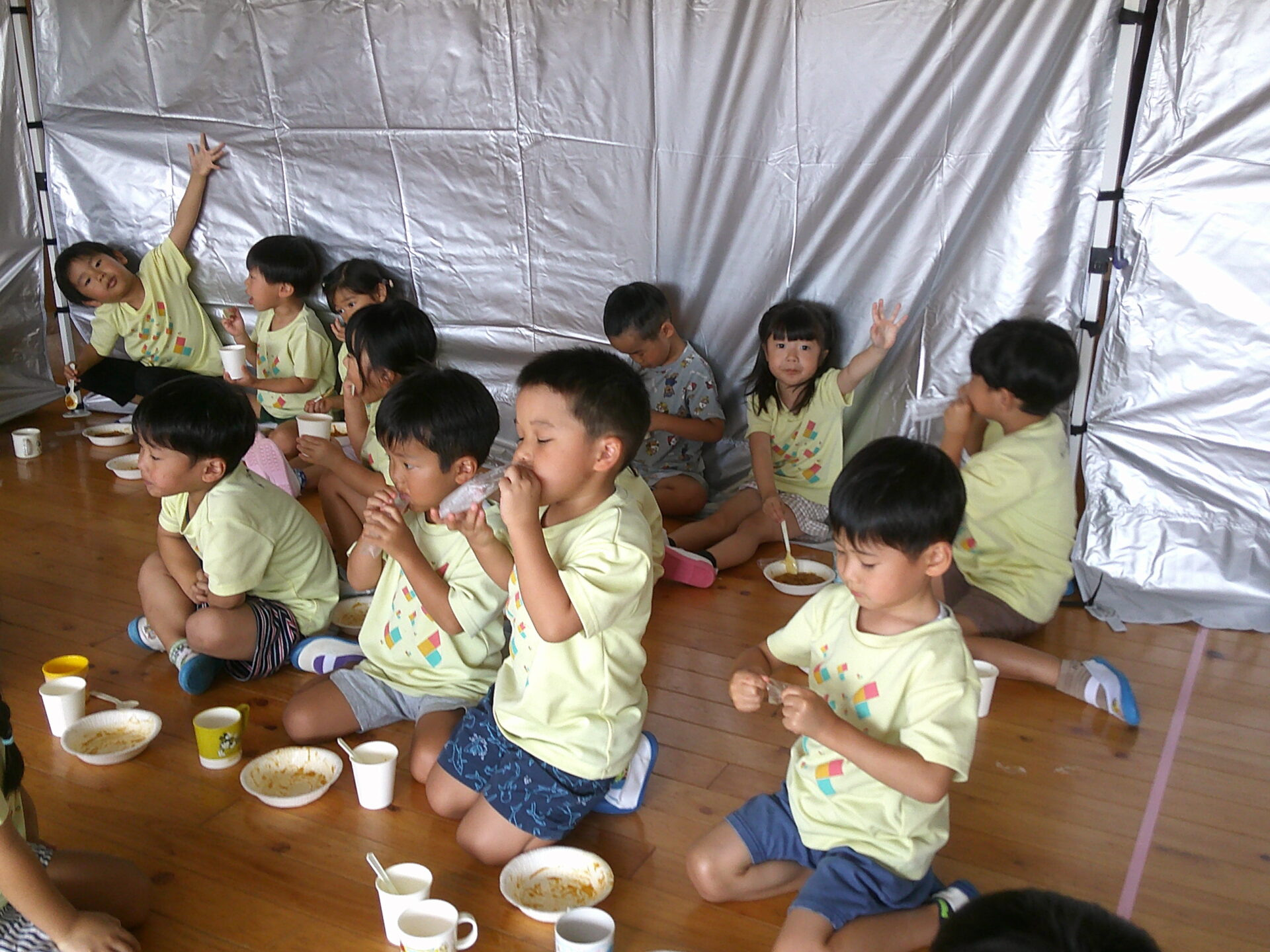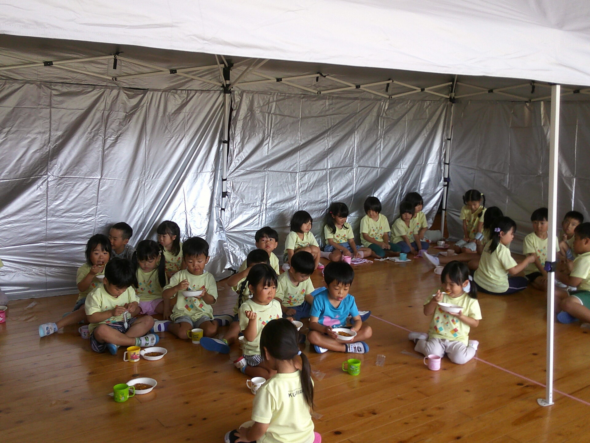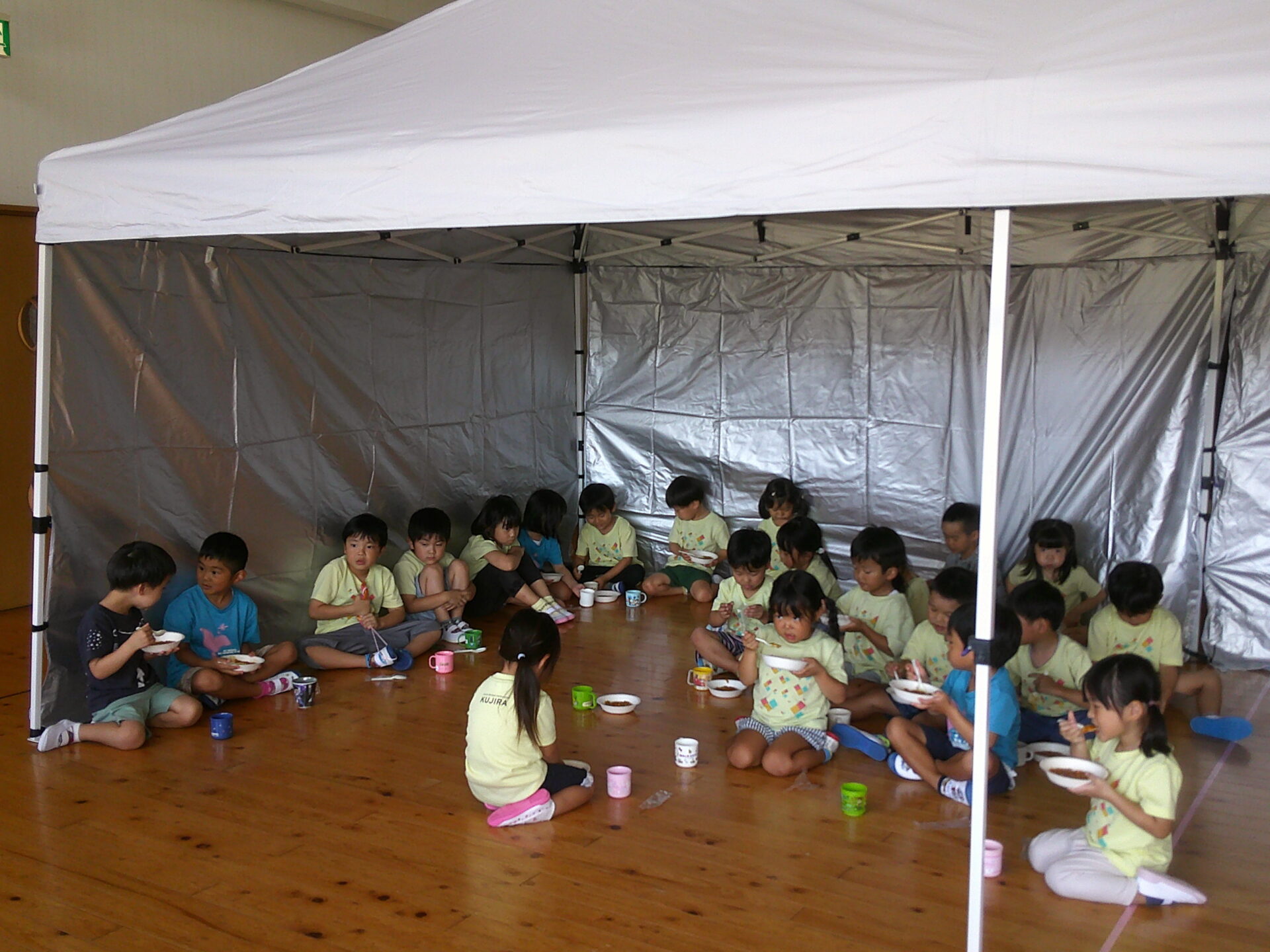 そらチーム(4歳児)さんとくじらチーム(5歳児)さんは避難用テントの中で、非常食(カレー・みかん缶・水)を食べました。実際に災害が起きたら、電気も付かないという事で、少々暗い中での食事でした。