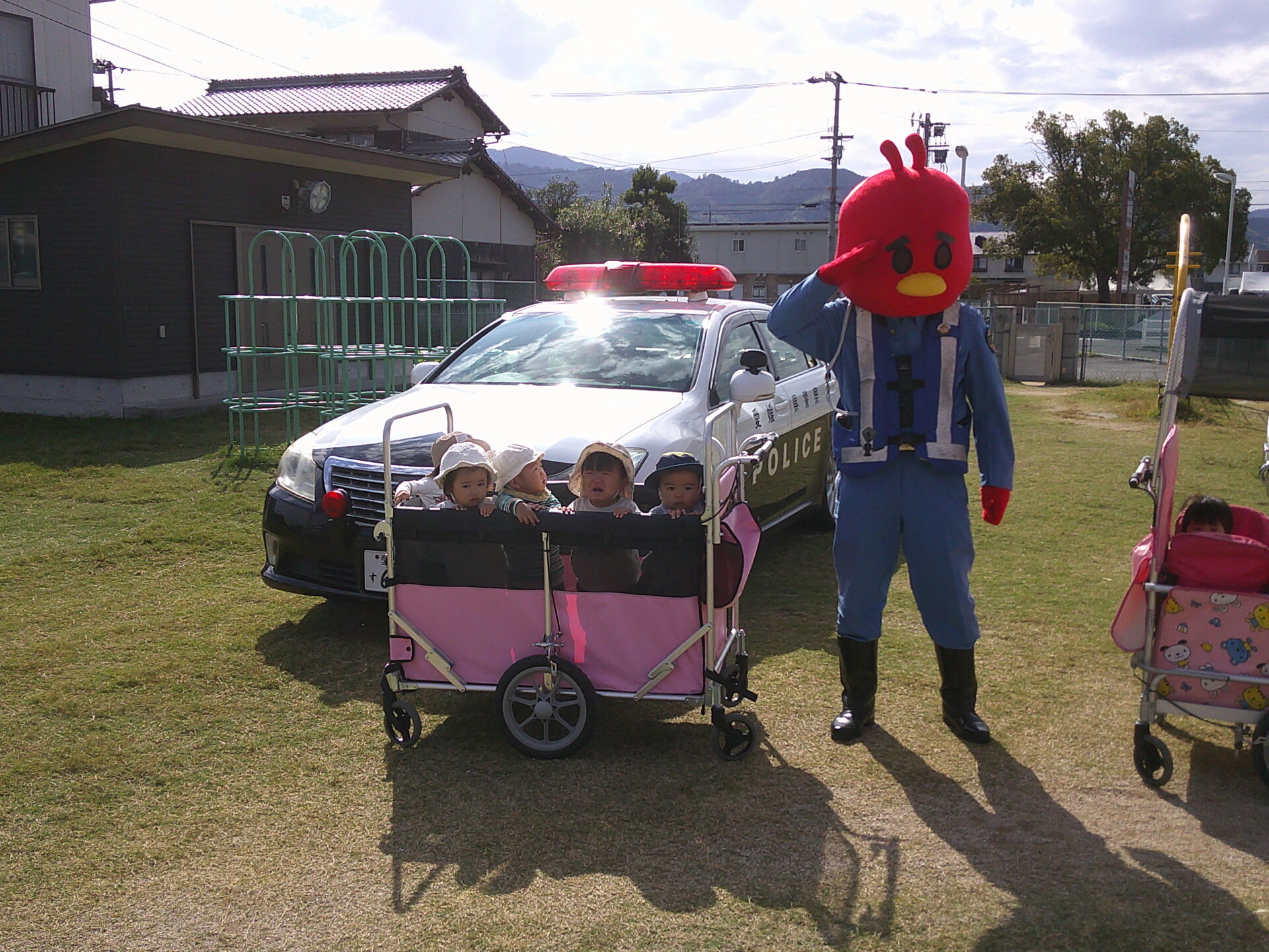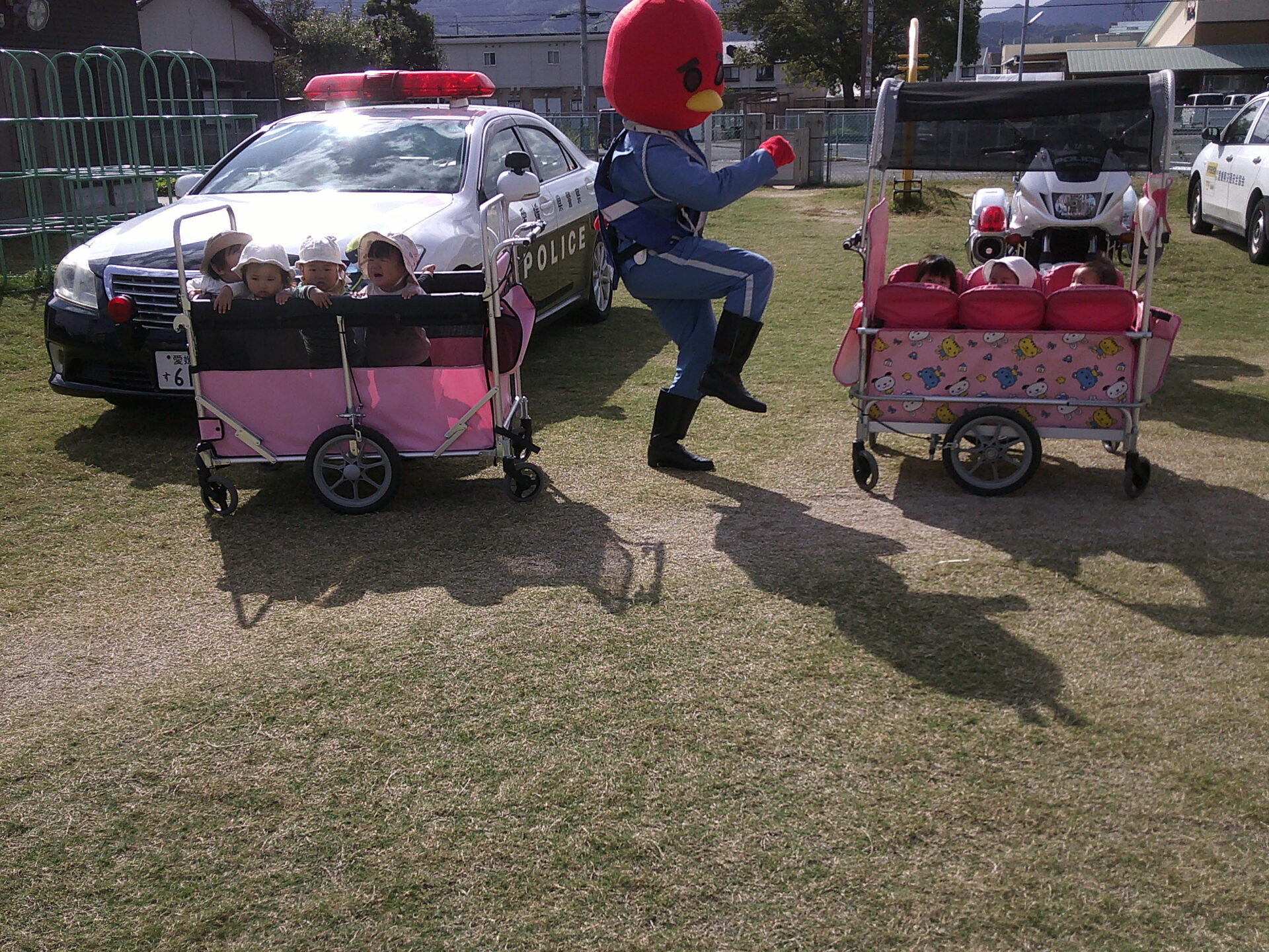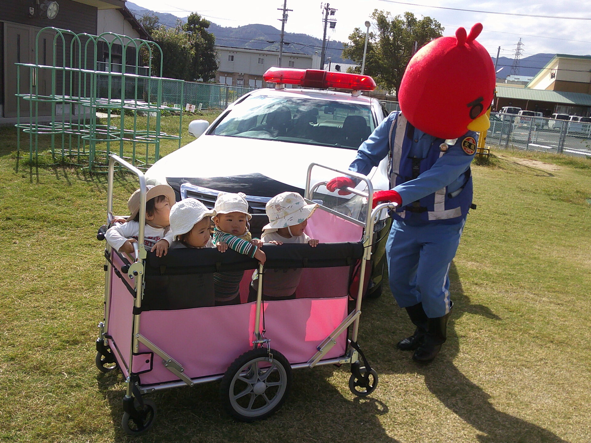 とりのきくじら保育園が立地している所轄署(伊予署)にお願いをし、『交通安全教室』を実施していただきました。最初に視聴覚教材にて、交通ルールを守る事の大切さ、交通事故の怖さを知りました。そして、外に出て、信号機のある横断歩道の渡り方の実践をしました。その後は、お楽しみの記念撮影会。パトカーや白バイと一緒に写真を撮り、みんなニコニコでした。警察署のマスコット『ぴよちゃん』も一緒に来てくださり、仲よくお勉強をしました。