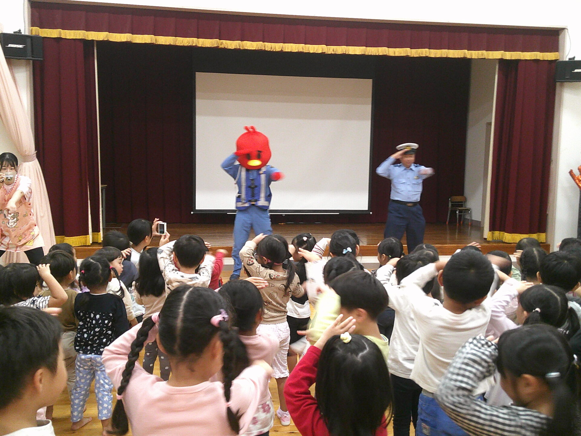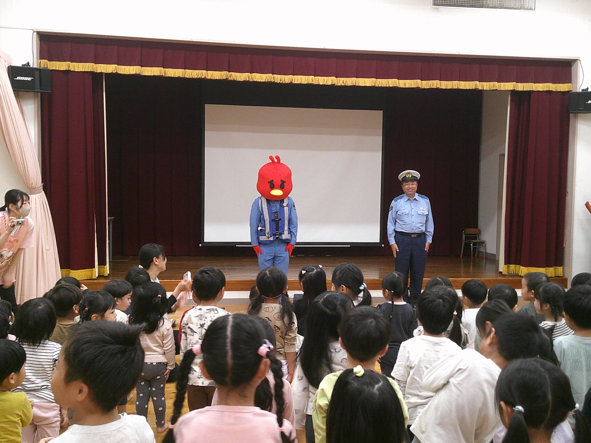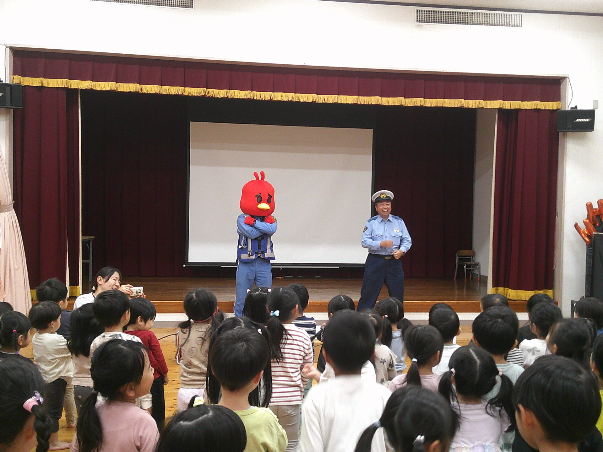 とりのきくじら保育園が立地している所轄署(伊予署)にお願いをし、『交通安全教室』を実施していただきました。最初に視聴覚教材にて、交通ルールを守る事の大切さ、交通事故の怖さを知りました。そして、外に出て、信号機のある横断歩道の渡り方の実践をしました。その後は、お楽しみの記念撮影会。パトカーや白バイと一緒に写真を撮り、みんなニコニコでした。警察署のマスコット『ぴよちゃん』も一緒に来てくださり、仲よくお勉強をしました。