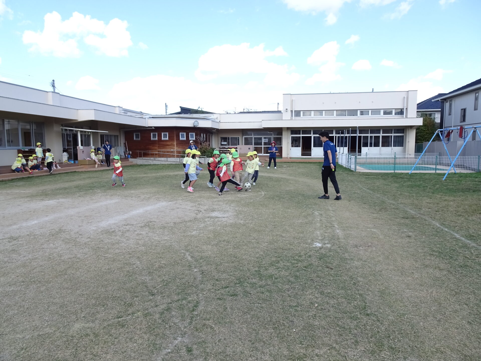 福岡県にある、『大宰府くじら保育園』から、先生が来られ、くじらチーム(5歳児)の子どもたちと一緒にボール遊び(主にサッカーです)を楽しみました。前日、とりのきくじら保育園だけで、練習をし、翌日は、『伊予くじら認定こども園』のくじらチーム(5歳児)と交流戦をしました。