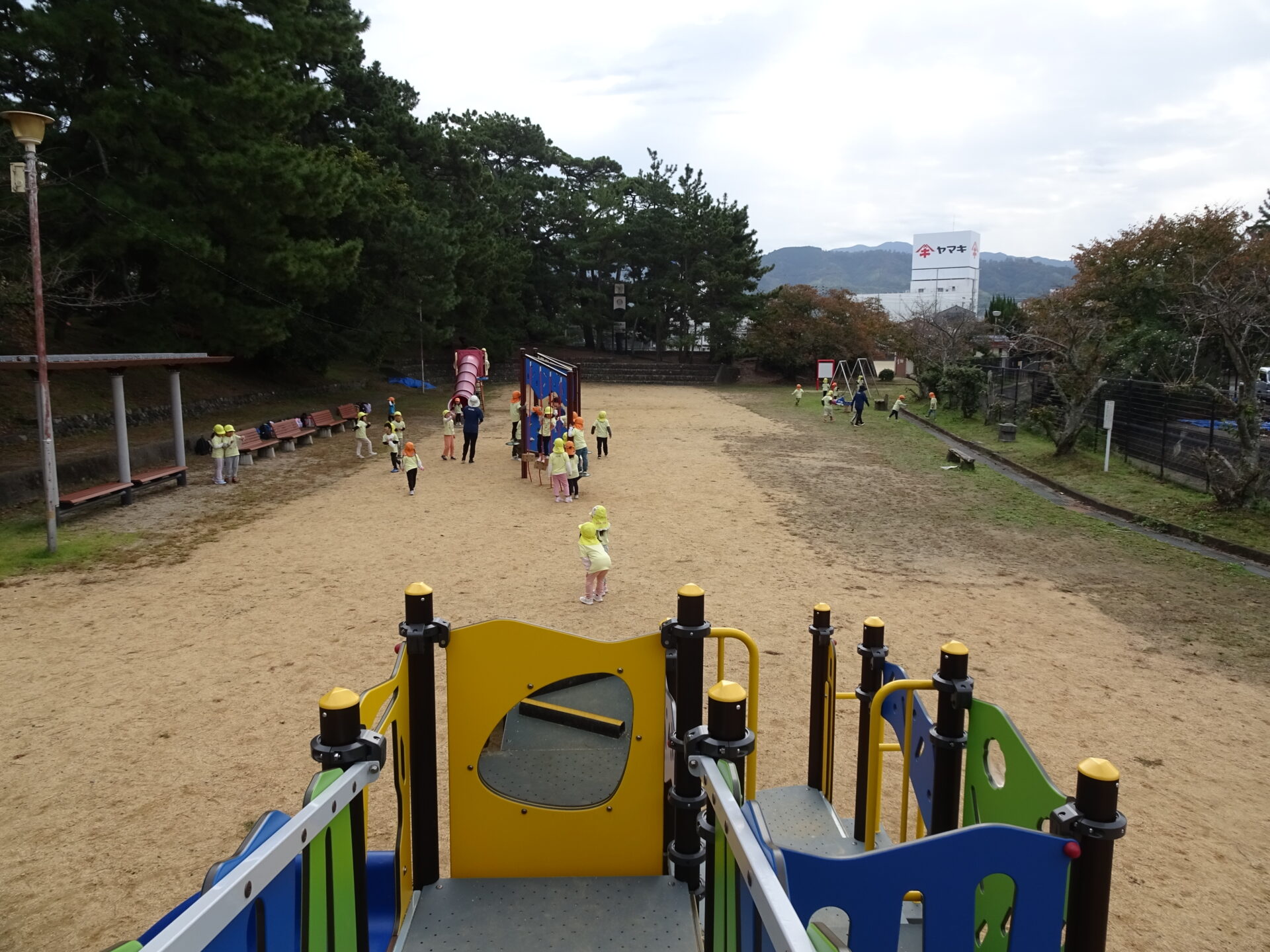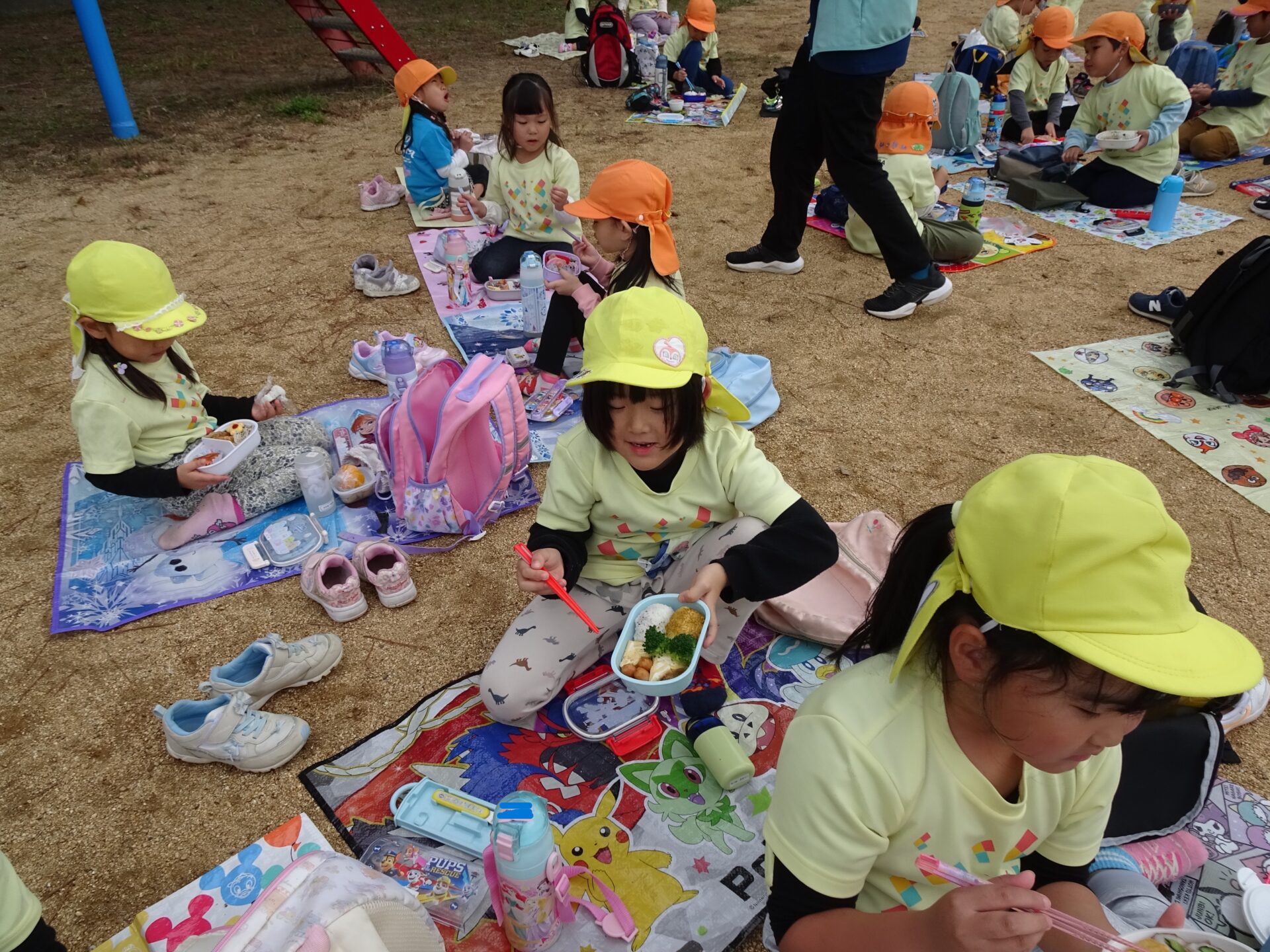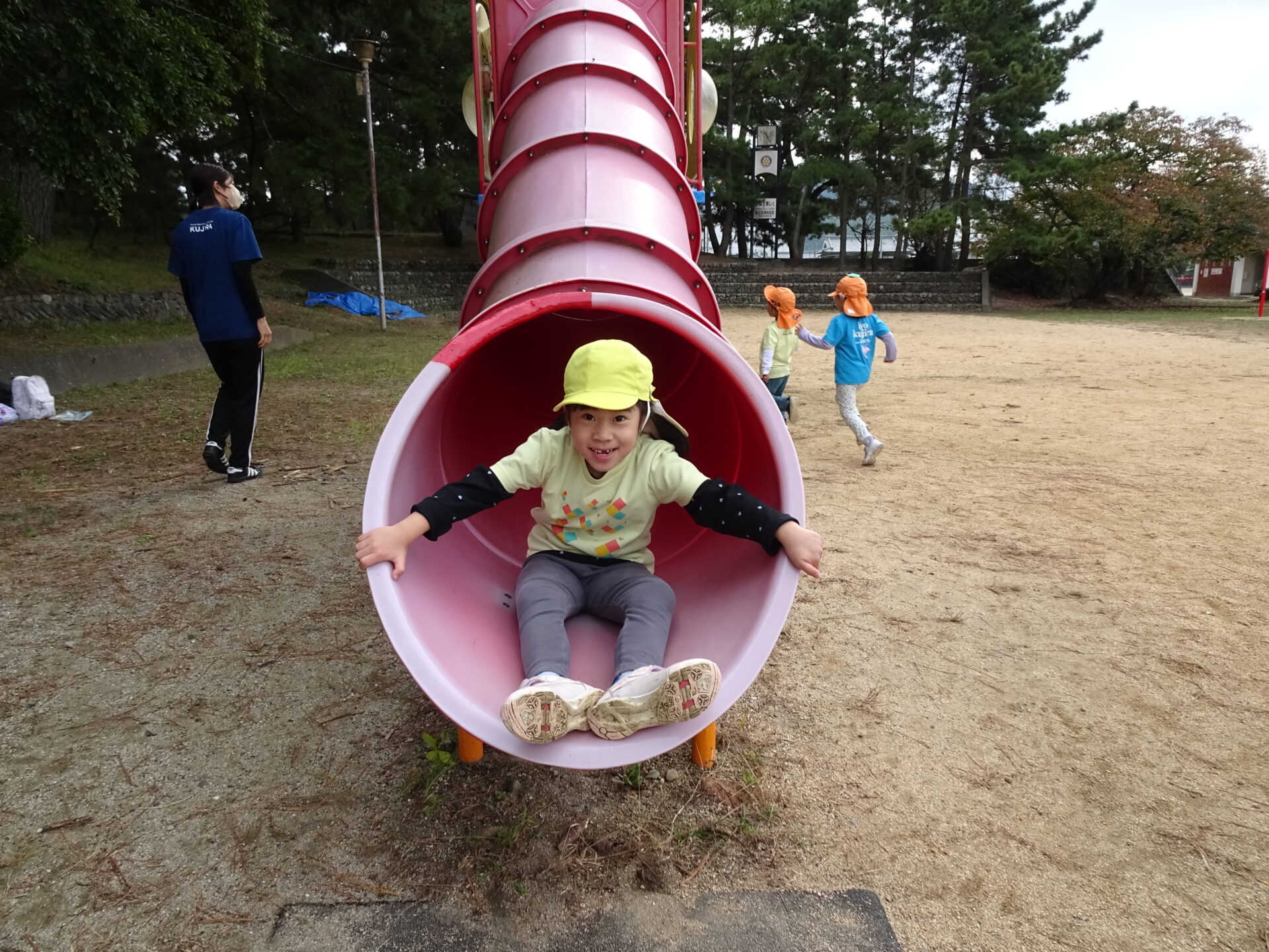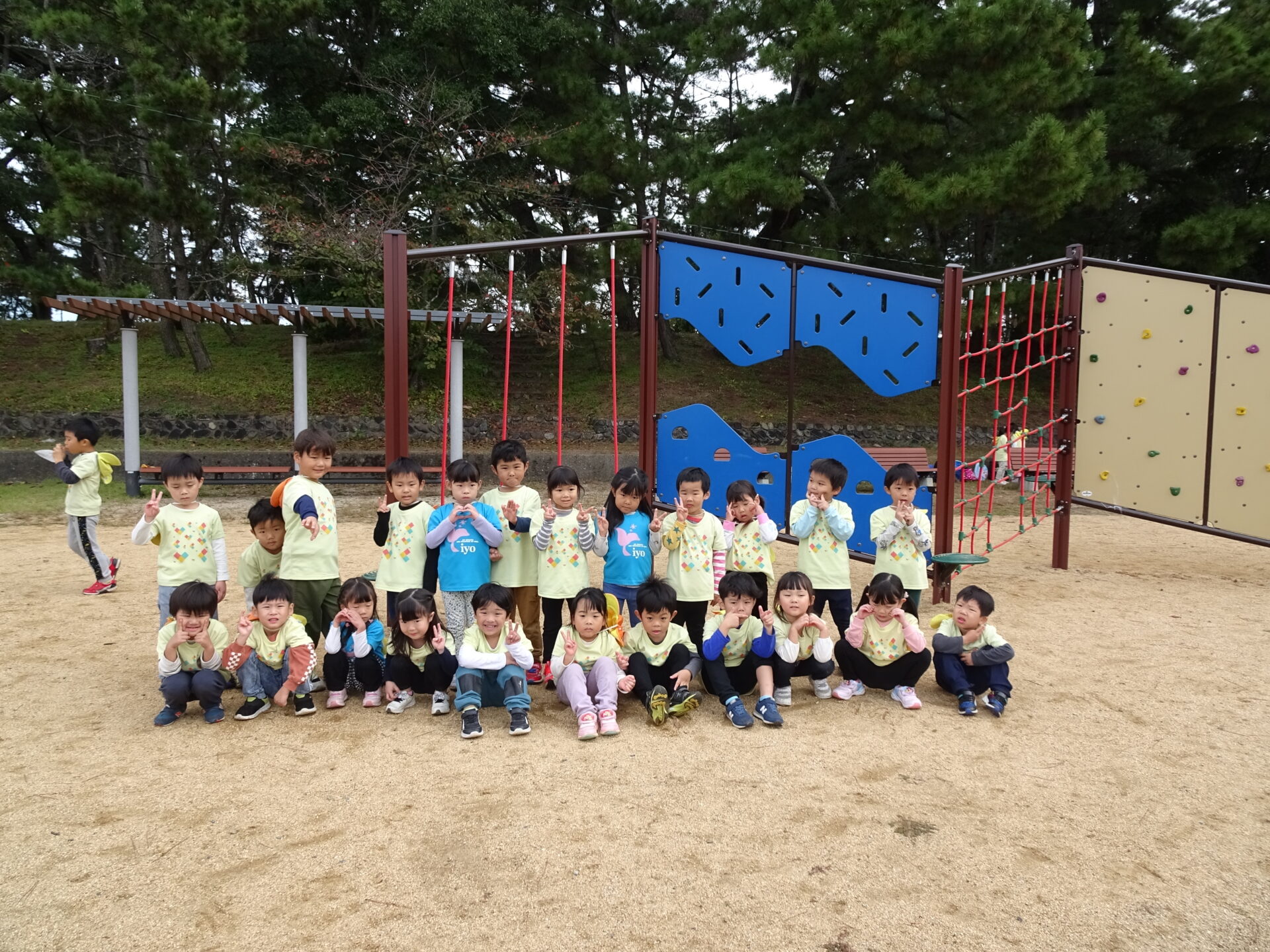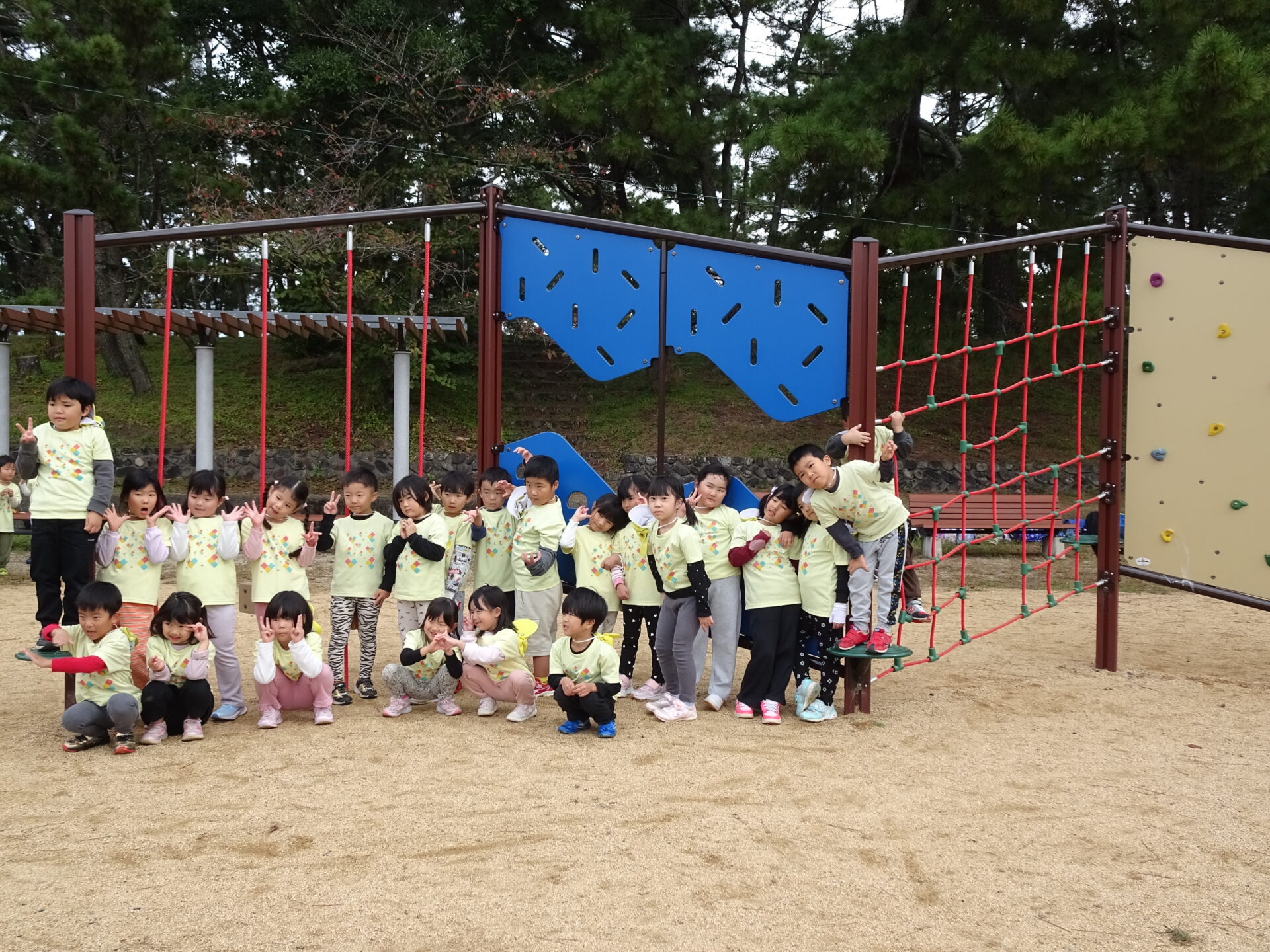 待ちに待った秋の遠足。くじらチーム(5歳児)とそらチーム(4歳児)の目的地は『五色浜公園』でした。JRにも乗りましたよ。なんと、この時間、「みきゃん電車」で、喜びもひとしおでした。『五色浜』までの足取りもとても軽かったです。