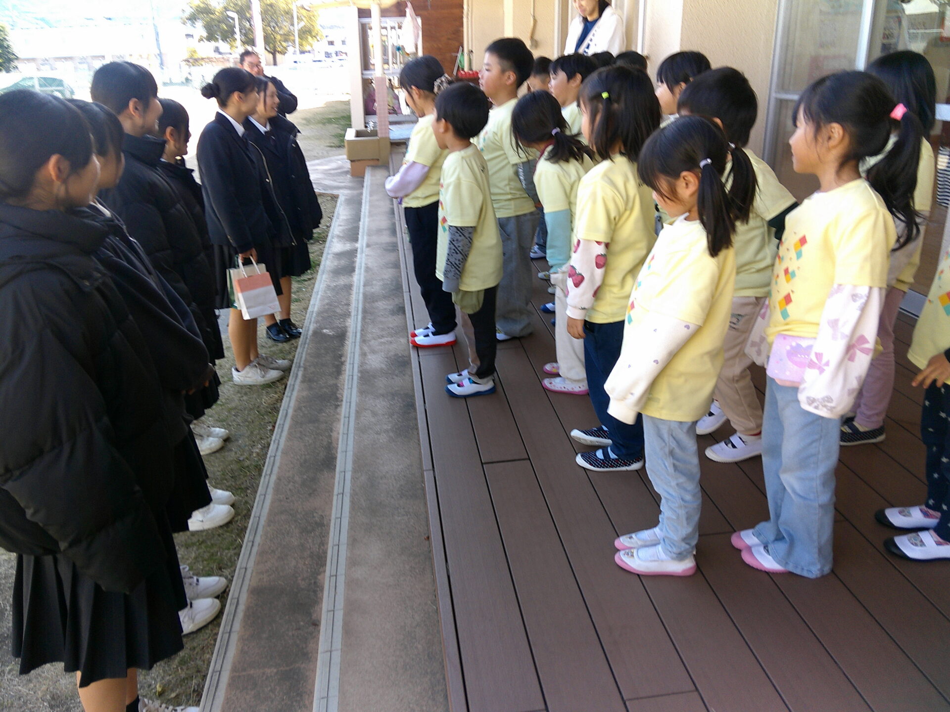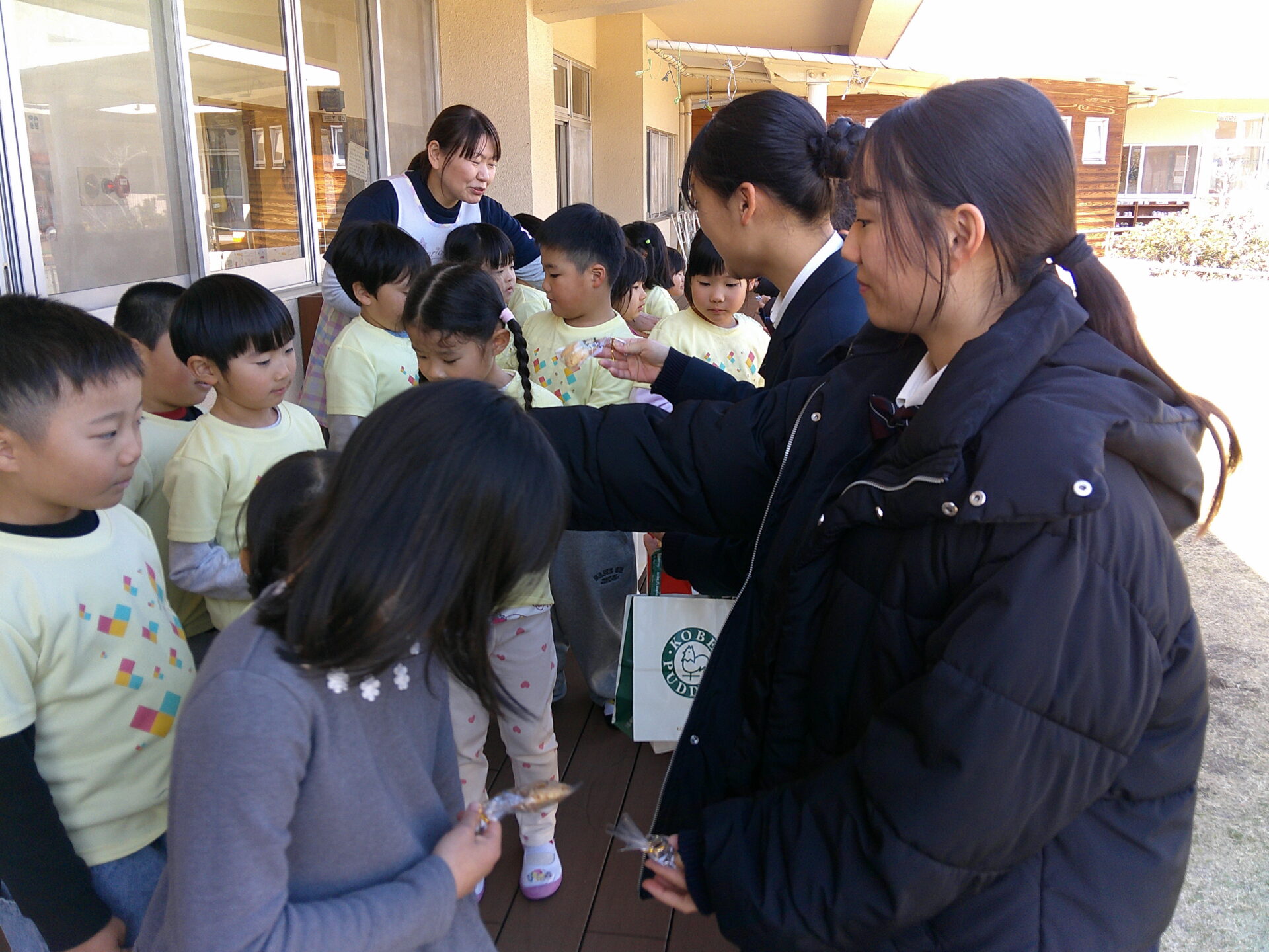 4月からくじらチームさん(5歳児)と一緒に食育交流をして下さった、近隣の伊予農業高校のお姉さん方。くじらチームさんが3月で卒園するのと同じで、お姉さん方も高校を卒業します。本日は、テスト期間中にも関わらず、お別れに来てくださいました。畑で育てた野菜(人参)を使ったクッキーを焼いて持って来てくださいました。ありがたいことです。くじらチームさんはお姉さんが大好き。すぐに跳んで行って、しがみついているお友だちもいました。夏野菜は、暑い中、草引きをし、畑の整備をし、育てたにもかかわらず、不作だったこと。反対に、冬野菜は、驚くような大きなジャガイモが採れたこと。お姉さんと一緒に、園庭を走り回って遊んだこと。くじらチームさんの心の中に、しっかりと刻まれました。本当にありがとうございました。またどこかでお会いした時は、声をかけてください。お姉さん方も、卒業後も、元気で、自分の信じた道を歩んでください✋🏻