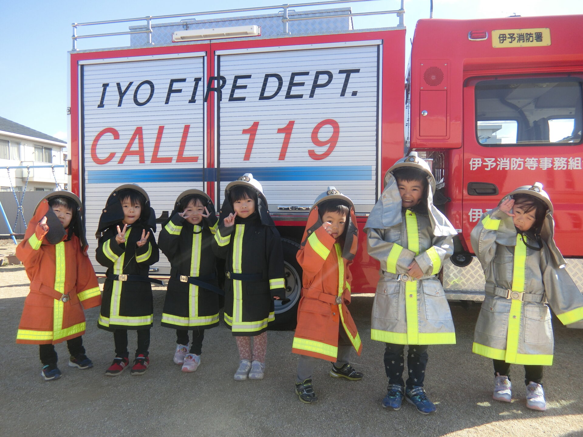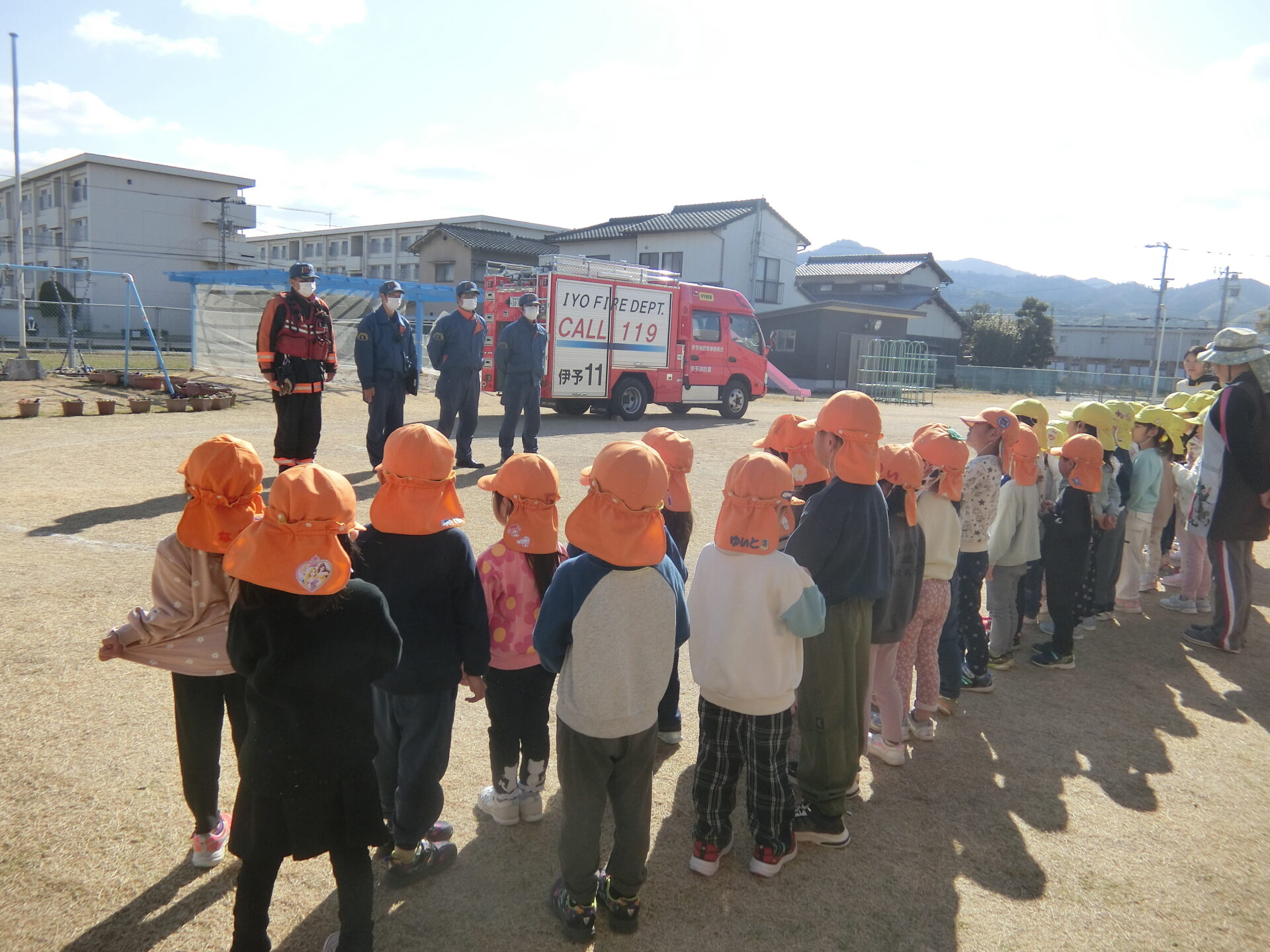 伊予消防署等事務組合の方、本日は、とりのきくじら保育園の『総合避難訓練』のために、お忙しい中来園していただき、ありがとうございました。今後もよろしくお願いいたします。