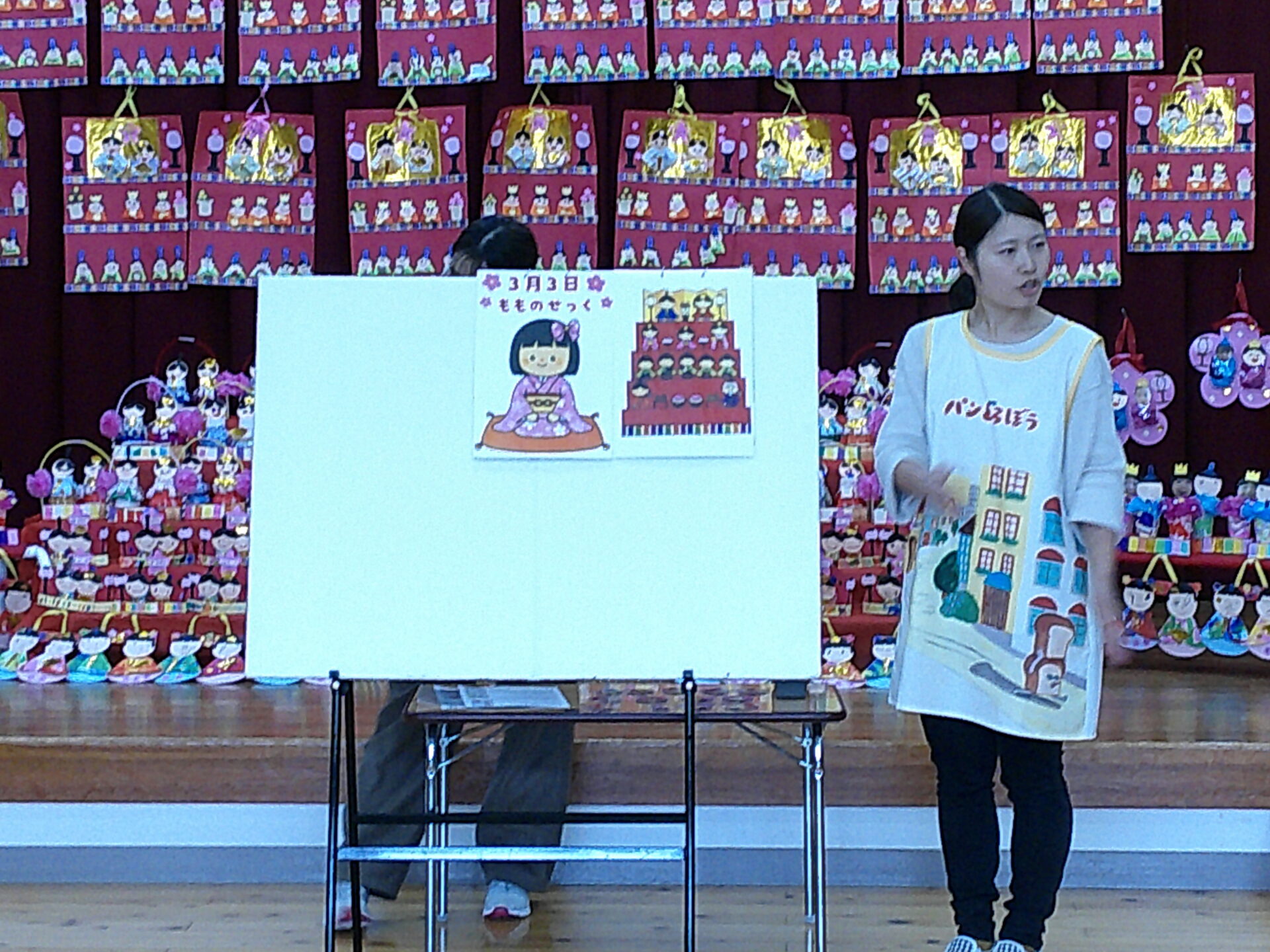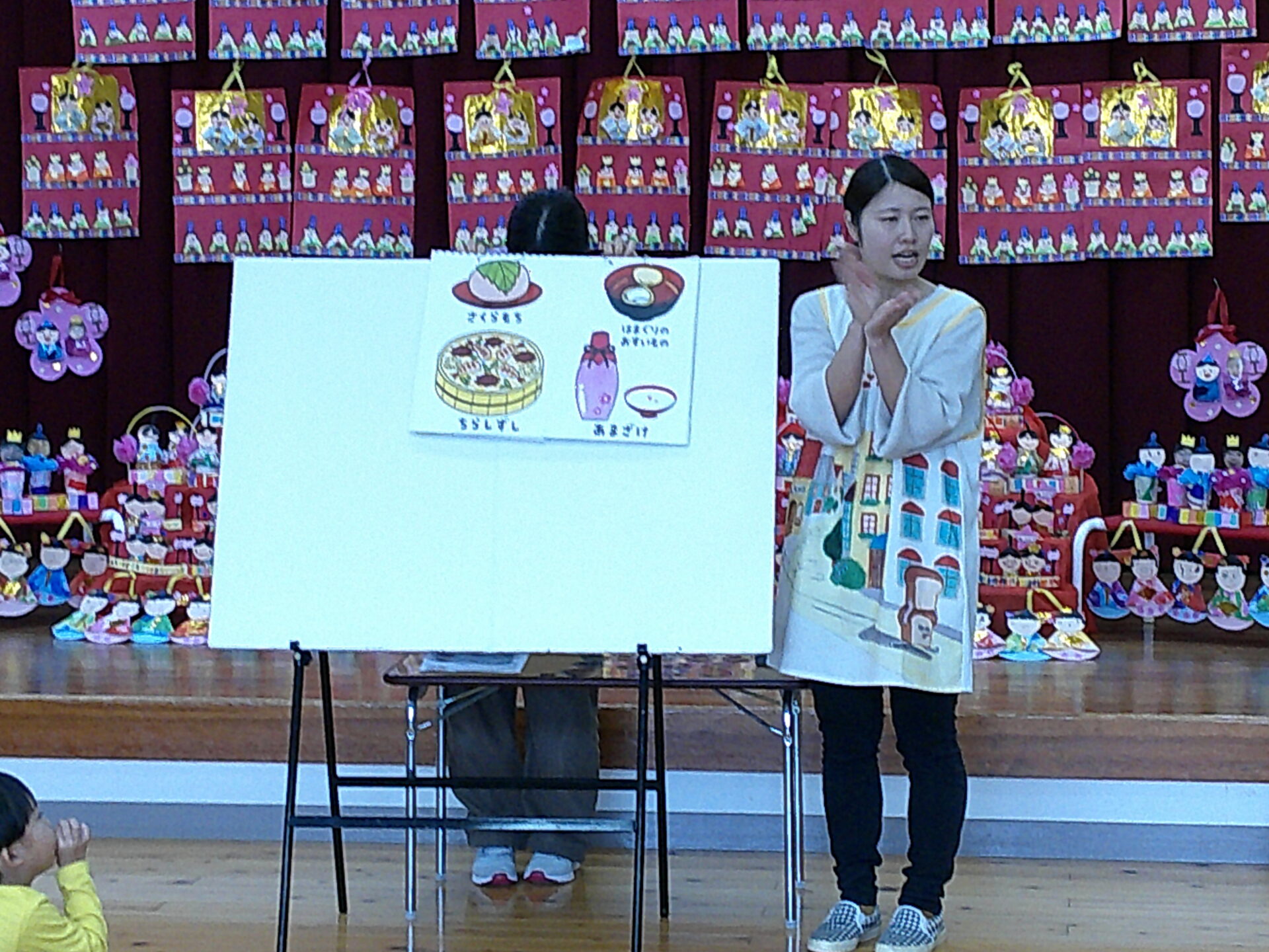 続いて、ひな祭り会が行われました。ひな祭りの風習や、ひな壇にいる人の名前、ひしもちや雛あられの色の意味を、説明してもらいました。絵を見ながら説明して下さったので、みんなよくわかった様子でした。