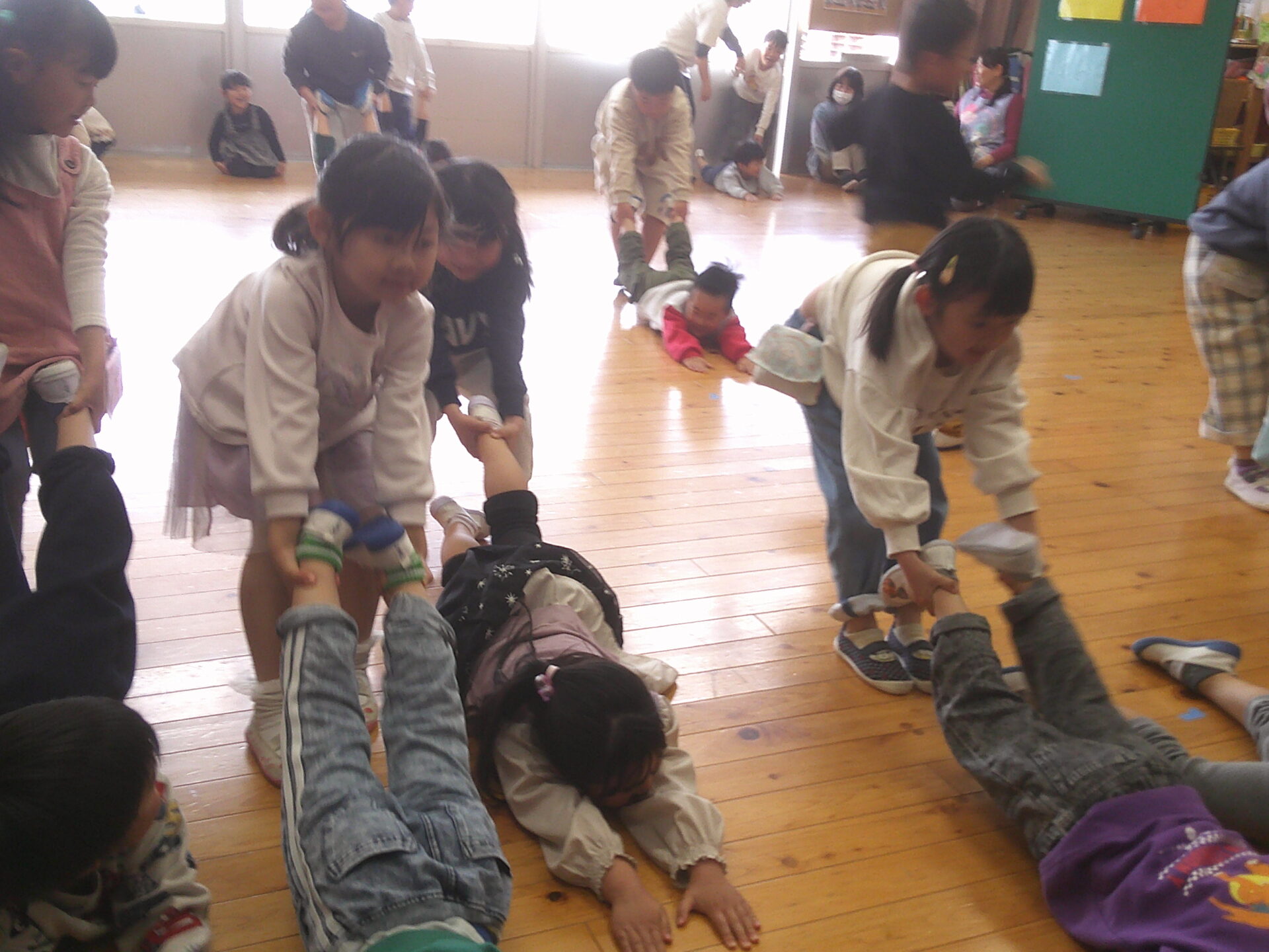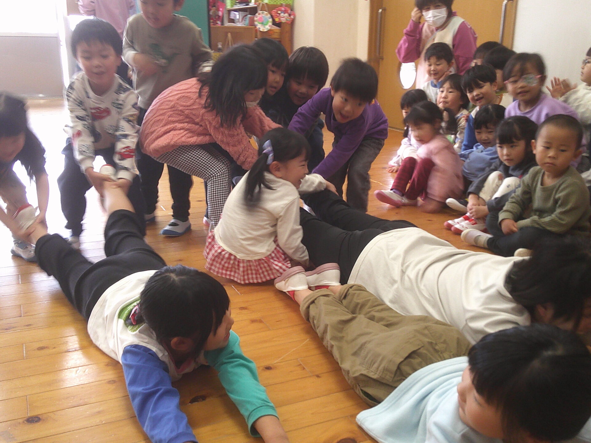 当日を、とても楽しみにしていたくじらチームさん。まず最初に、にじチーム・そらチーム・くじらチームの各チーム対抗で、『大根ぬき大会』をしました。大根になったお友達は、ぐっと力を入れて床にしがみつきます。一方大根をぬくお友だちは、お部屋の端っこまで、抜いて持って行かないと、勝つことが出来ません。