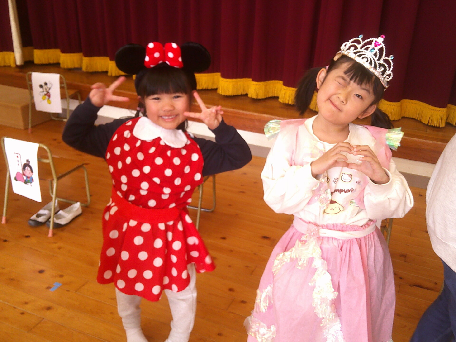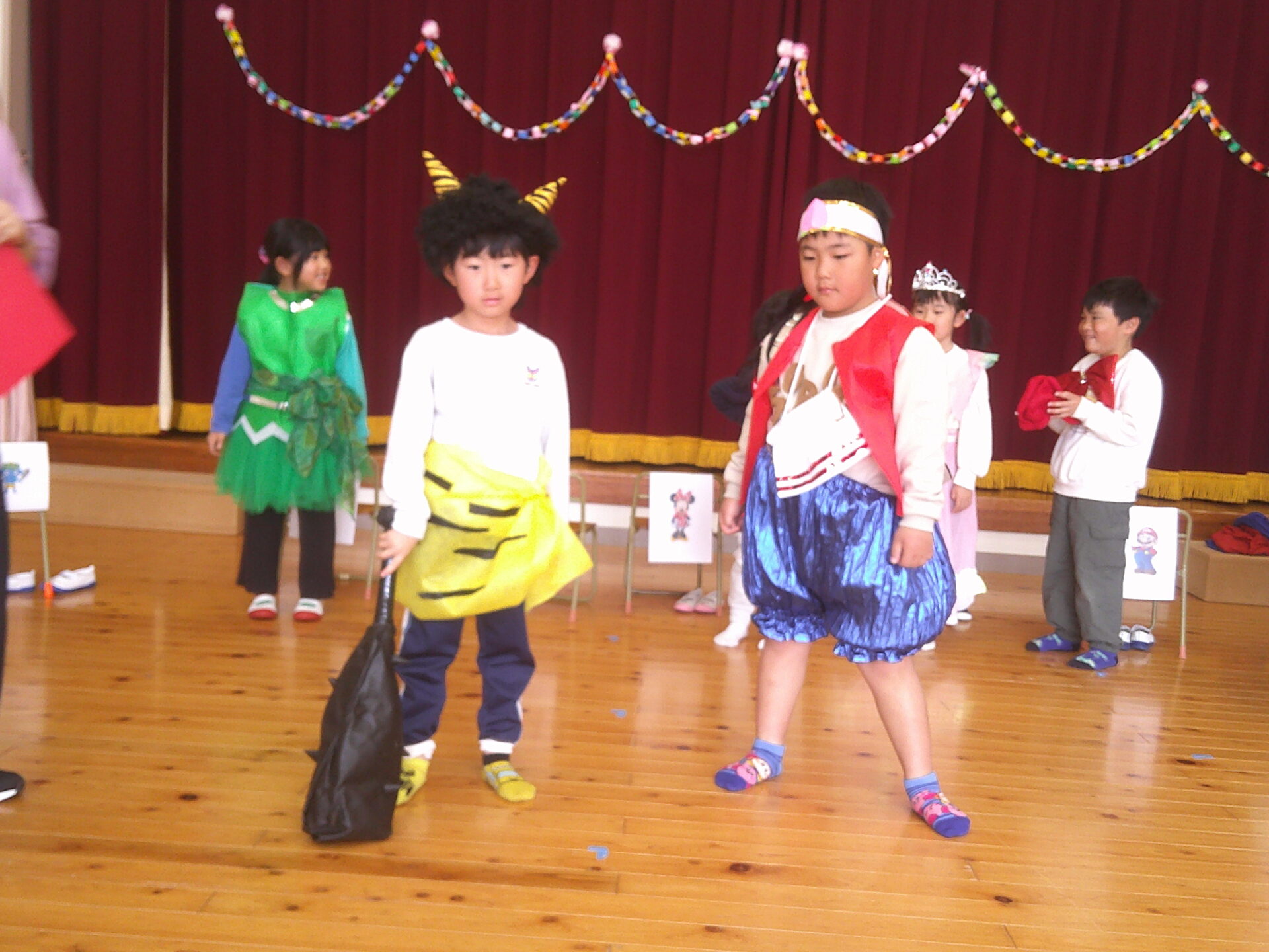 続いて、メインイベント!!異年齢でペアになって、くじらチーム一人一人を変身させるというゲーム。ミニーちゃんやピーチ姫、マリオやティンカーベル…たくさんの衣装の中から、そのキャラクターの身に付けている衣装を見つけて、一枚ずつ着せていきます。