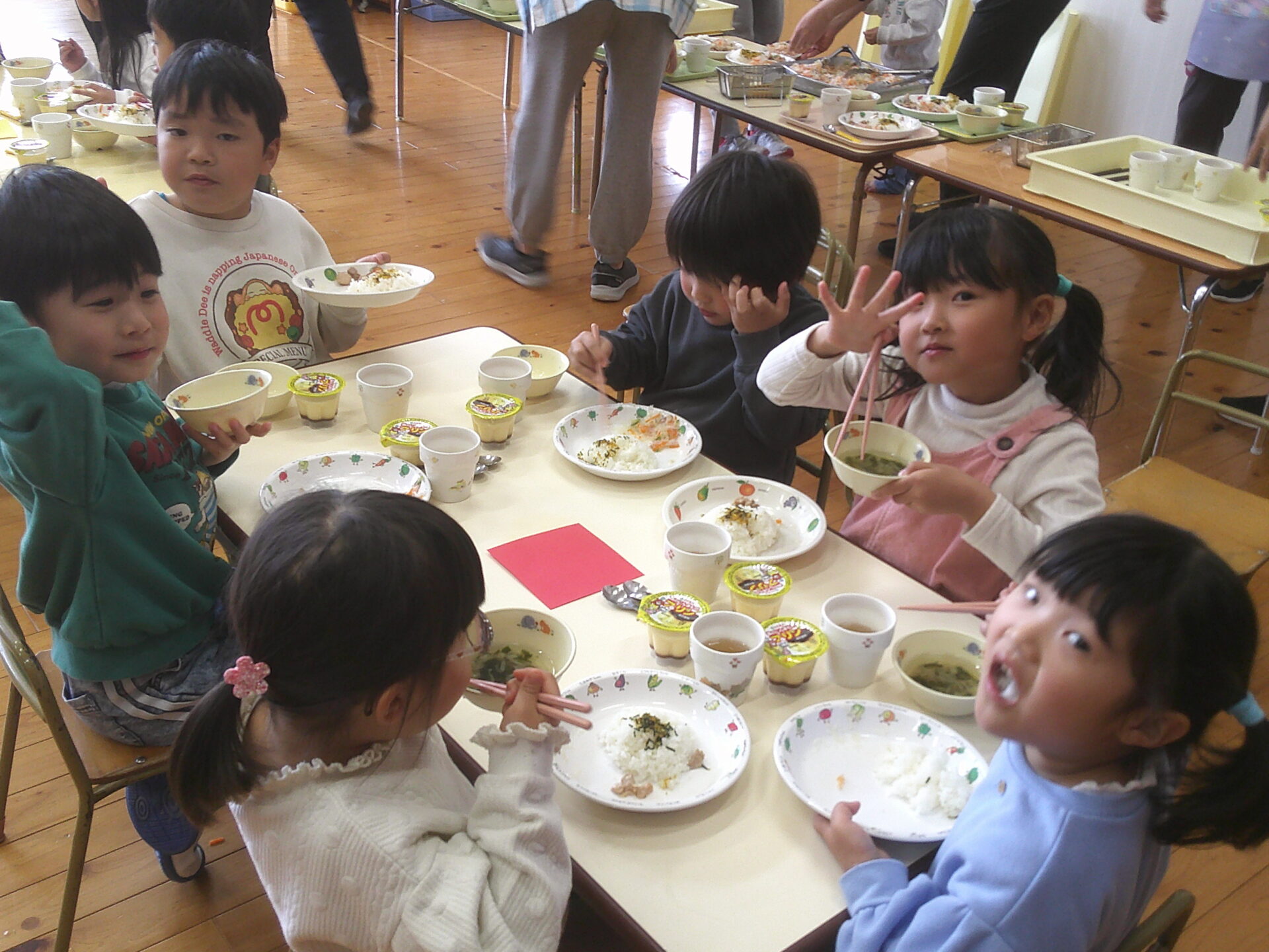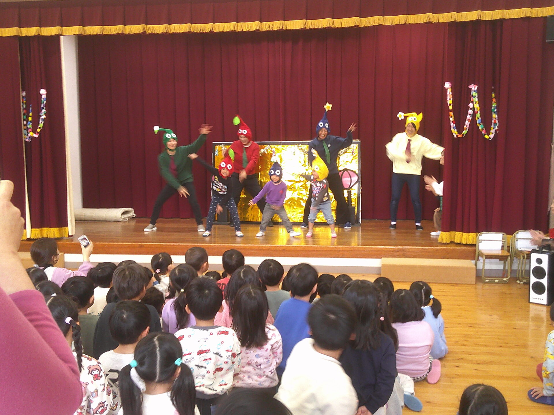 そして最後は、先生たちからの劇のプレゼントです。実は、くじらチームが12月の発表会の時に、演じた「おむすびころりん」を、リメイクして先生たちとそらチーム有志で、実演してくれました!いつも近くにいてくれる先生たちが演じてくれていたので、みんなとても盛り上がり、たくさんの拍手を送っていました(^^♪