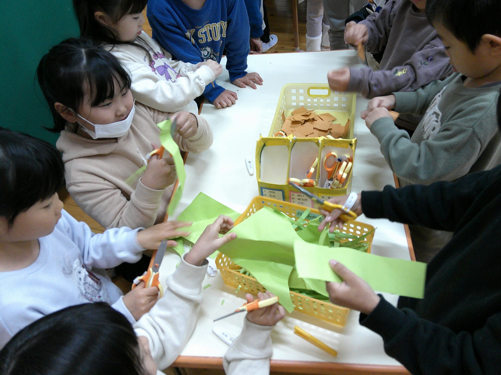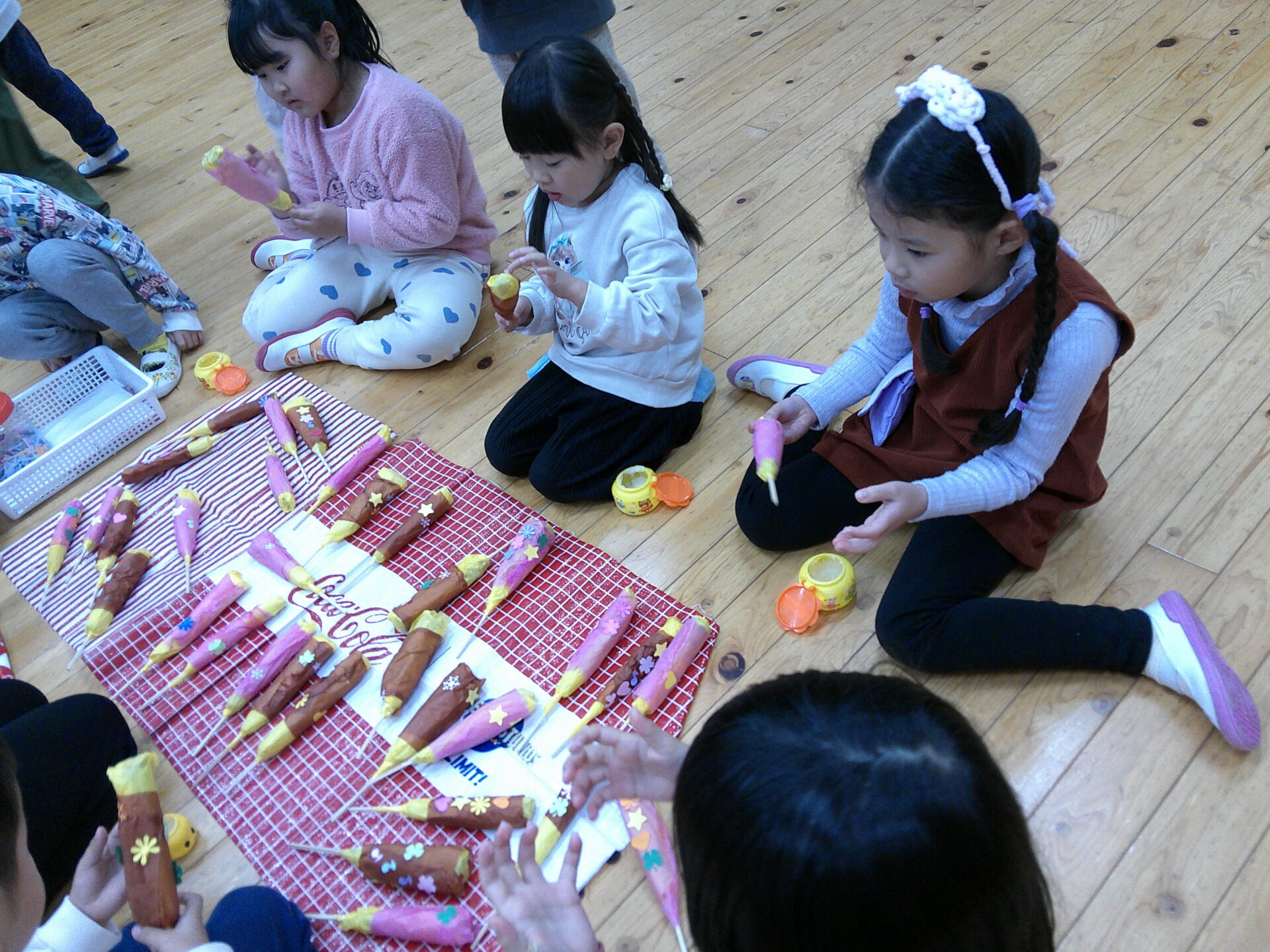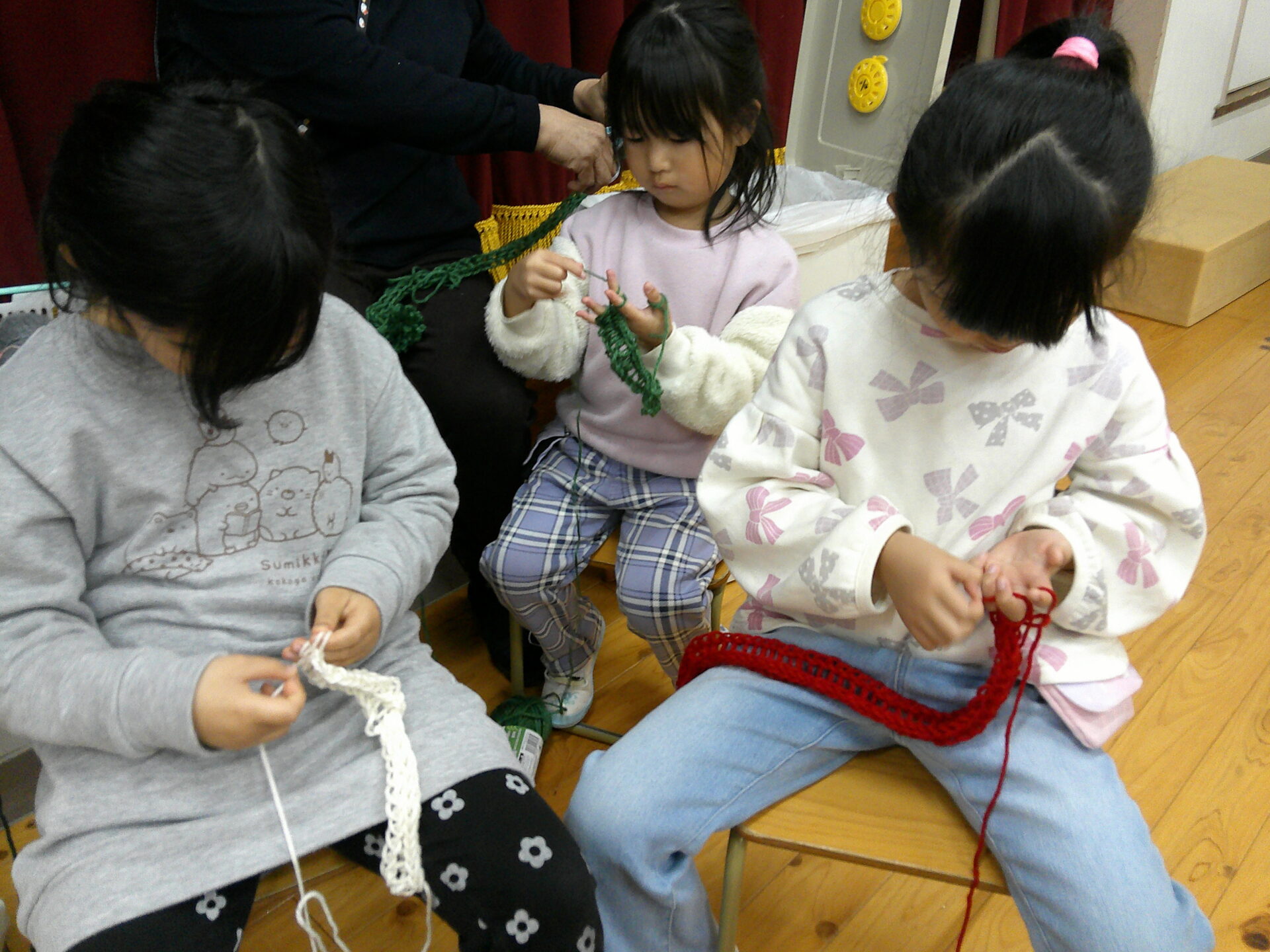 今回、くじらチームさん(5歳児)は初めて、毛糸を使って「ゆびあみ」を体験しました。「初めて~😀」と言いながら真剣に取り組む姿はやはり、就学を目前に控えた年長さんらしい姿です。指先の器用さも、集中力もしっかりとあります。また、にじチームさん(3歳児)は色を塗ったり、絵をかいたりして、協力。それをそらチームさん(4歳児)が切ったり、貼ったりして、仕上げていました。みんなが協力して、たくさんの品物を作っています。当日、どのような屋台が出来るのか。。。今から楽しみです。