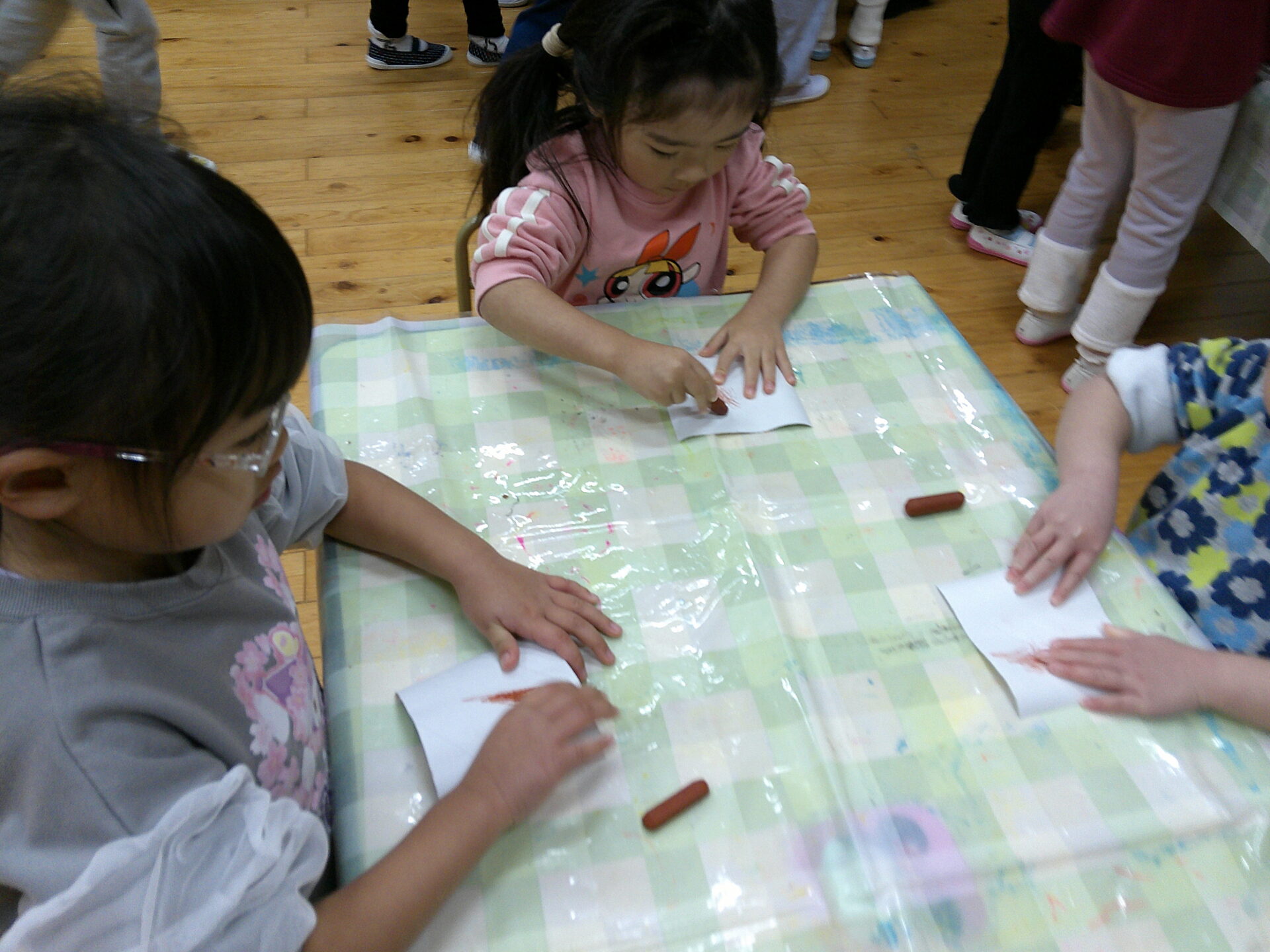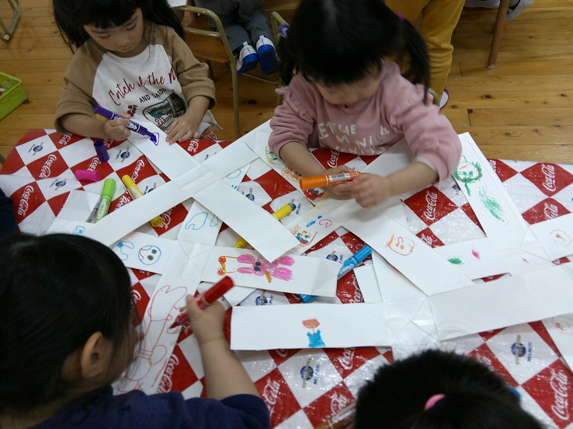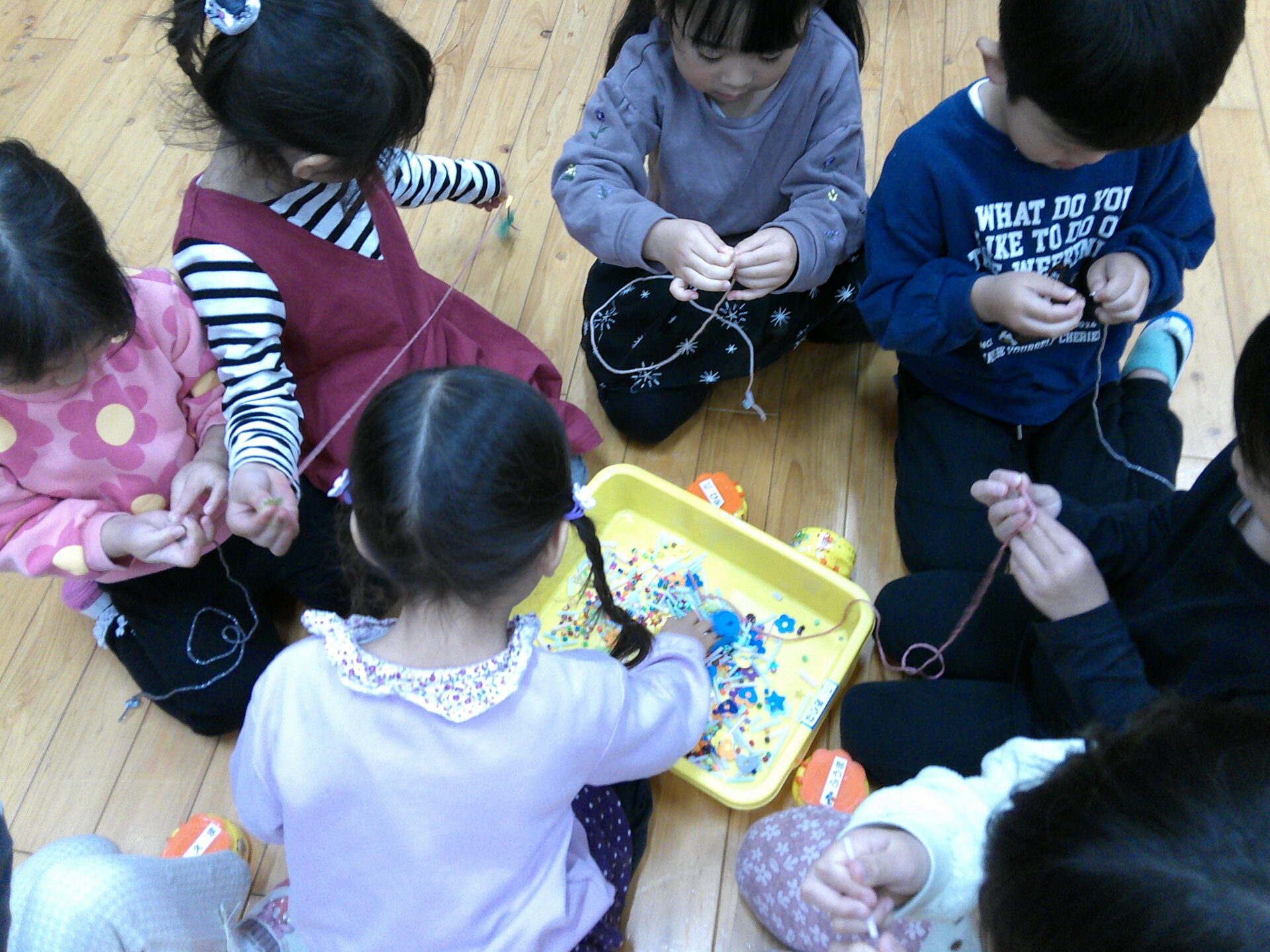 今回、くじらチームさん(5歳児)は初めて、毛糸を使って「ゆびあみ」を体験しました。「初めて~😀」と言いながら真剣に取り組む姿はやはり、就学を目前に控えた年長さんらしい姿です。指先の器用さも、集中力もしっかりとあります。また、にじチームさん(3歳児)は色を塗ったり、絵をかいたりして、協力。それをそらチームさん(4歳児)が切ったり、貼ったりして、仕上げていました。みんなが協力して、たくさんの品物を作っています。当日、どのような屋台が出来るのか。。。今から楽しみです。